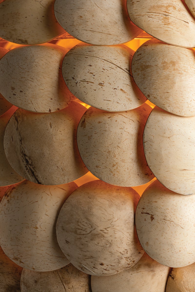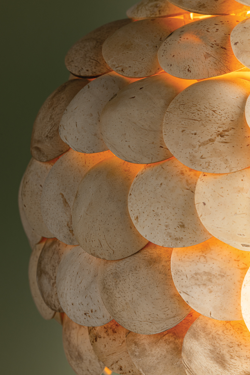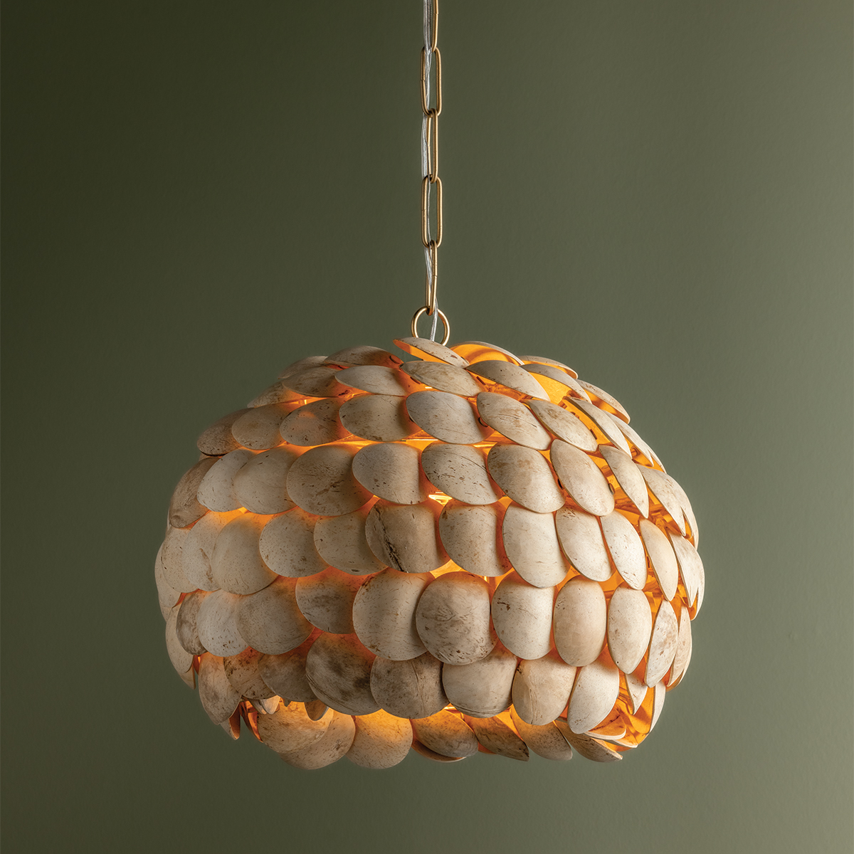 Entirely covered in layered coco shell discs, the Edric pendant is a celebration of natural texture and color variance. The overlapping shell pieces form a voluminous, spherical shade, showcasing the variety of neutral tones. To complete the fixture without detracting from its beauty, Edric dangles from a classic Vintage Gold Leaf chain.