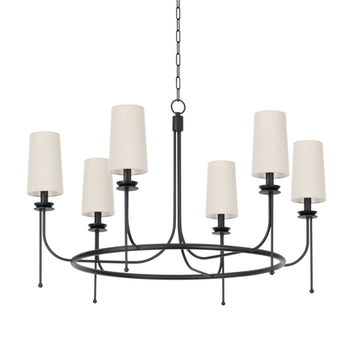 Inspired by the work of renowned Italian artist Alberto Giacometti, the Vishal family makes an impact with its sculptural framework and heavily patinated finish. The shades resemble dishes filled with light while the spindly arms are accented by ornamental circular motifs. The allover Black Patina Gold finish continues the art historical reference, adding an organic, hand-applied, and weathered effect. Vishal is available as a 1-light sconce and 4 or 6-light chandelier.