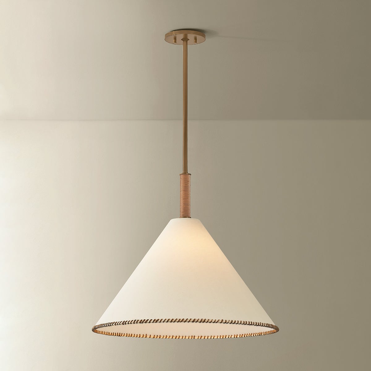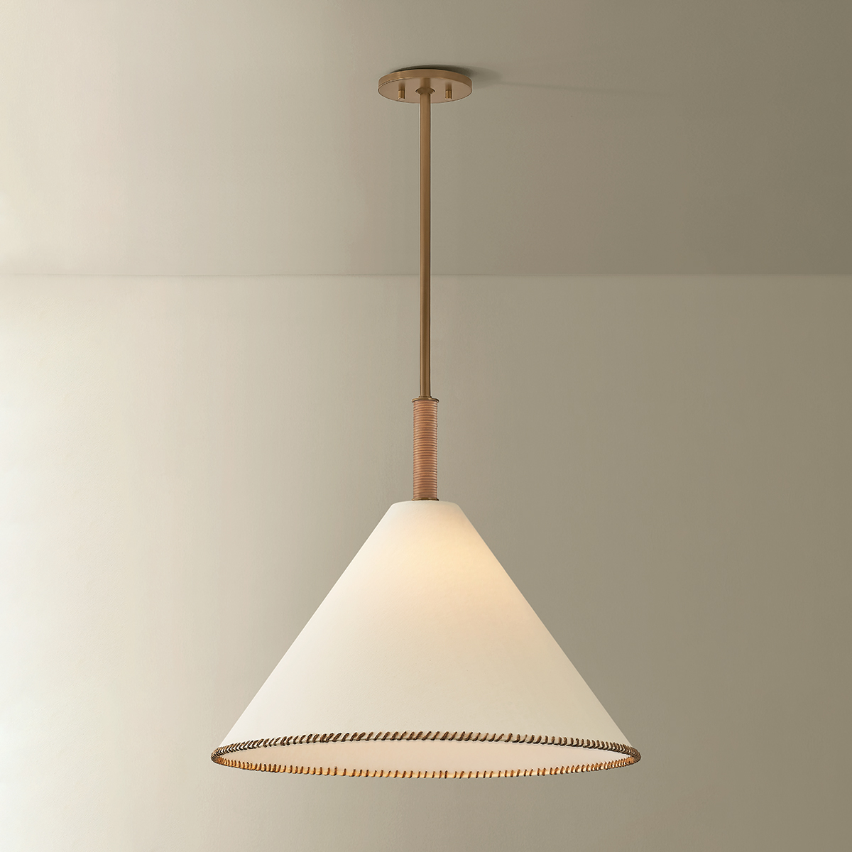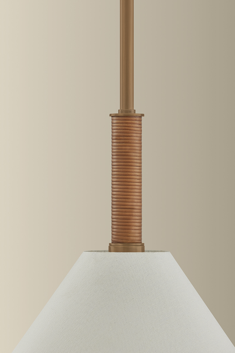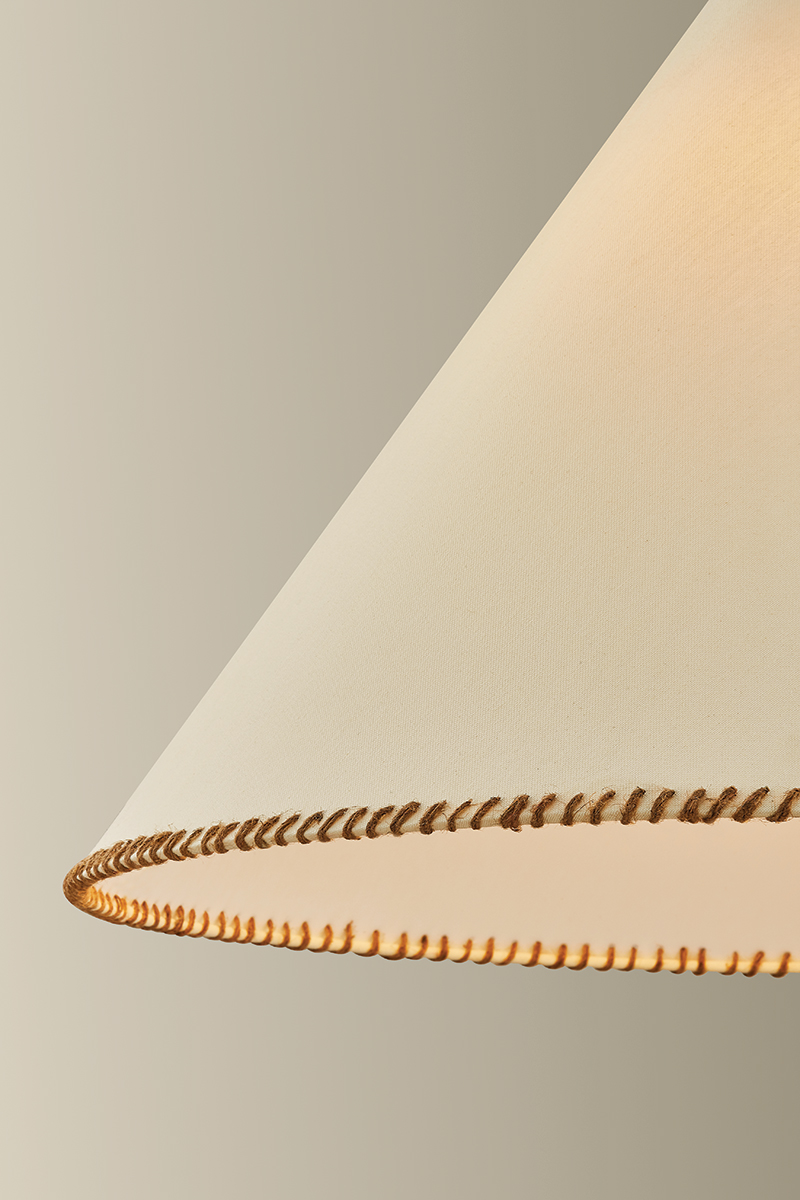 The architectural design language of the Stoney family is softened by its unique material qualities. Large conical white linen shades are edged with contrasting whip-stitching, echoing the natural jute wrap details along the Patina Brass frames. Available as a 1-light sconce, 1-light pendant, 5-light chandelier, and 1-light floor lamp, Stoney is an ode to craftsmanship.