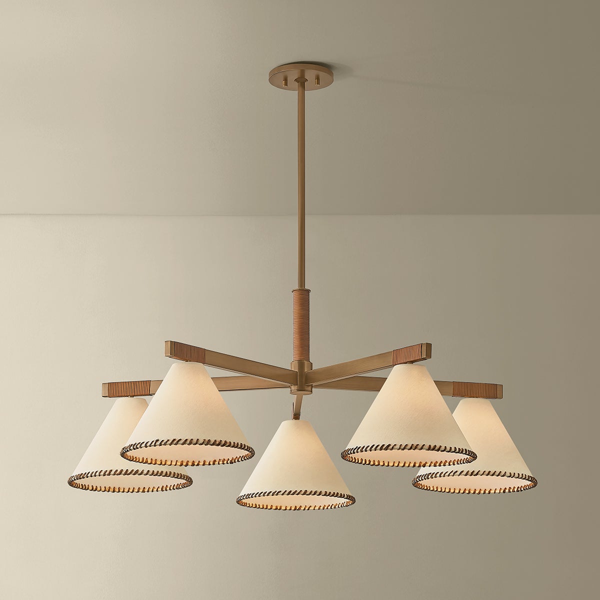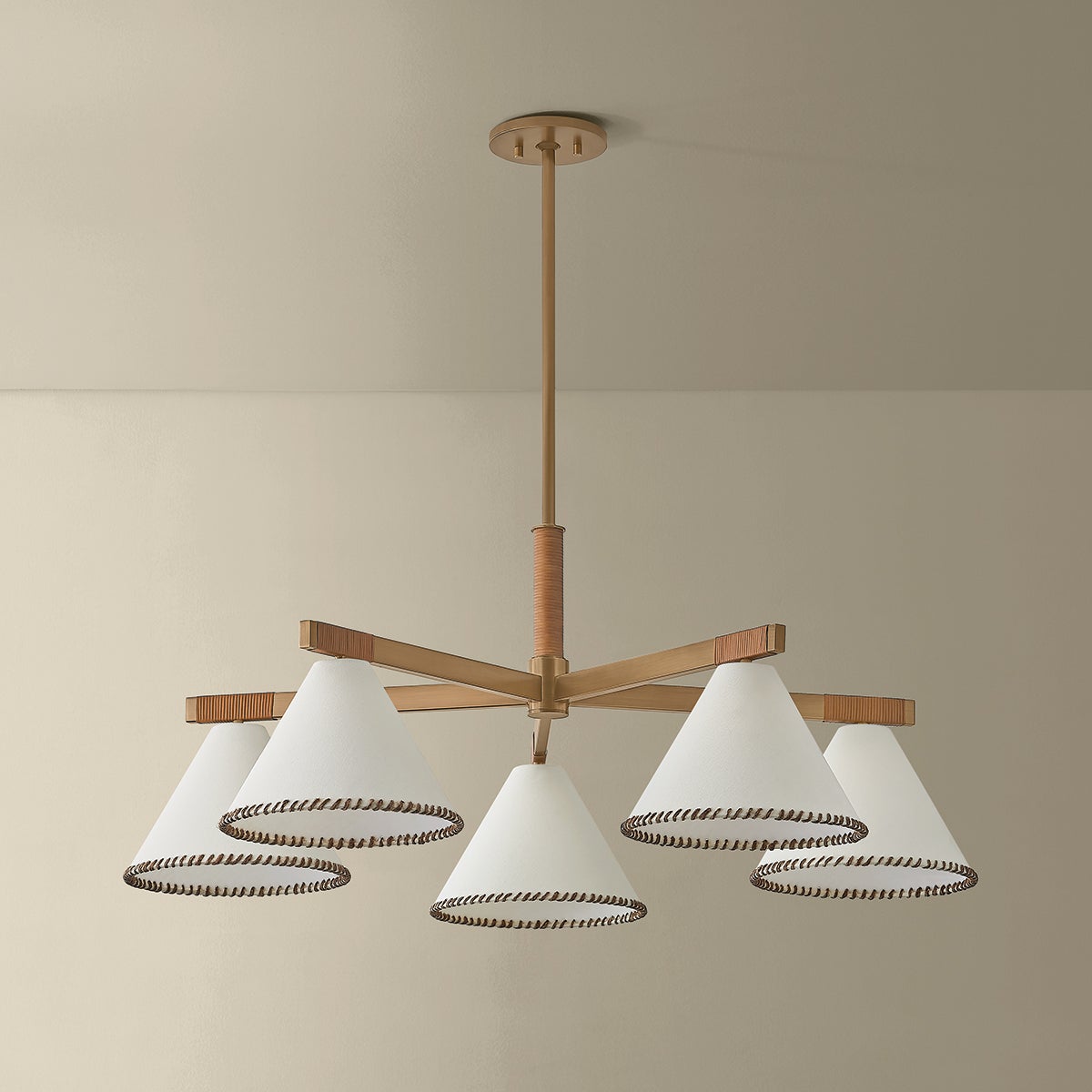 The architectural design language of the Stoney family is softened by its unique material qualities. Large conical white linen shades are edged with contrasting whip-stitching, echoing the natural jute wrap details along the Patina Brass frames. Available as a 1-light sconce, 1-light pendant, 5-light chandelier, and 1-light floor lamp, Stoney is an ode to craftsmanship.