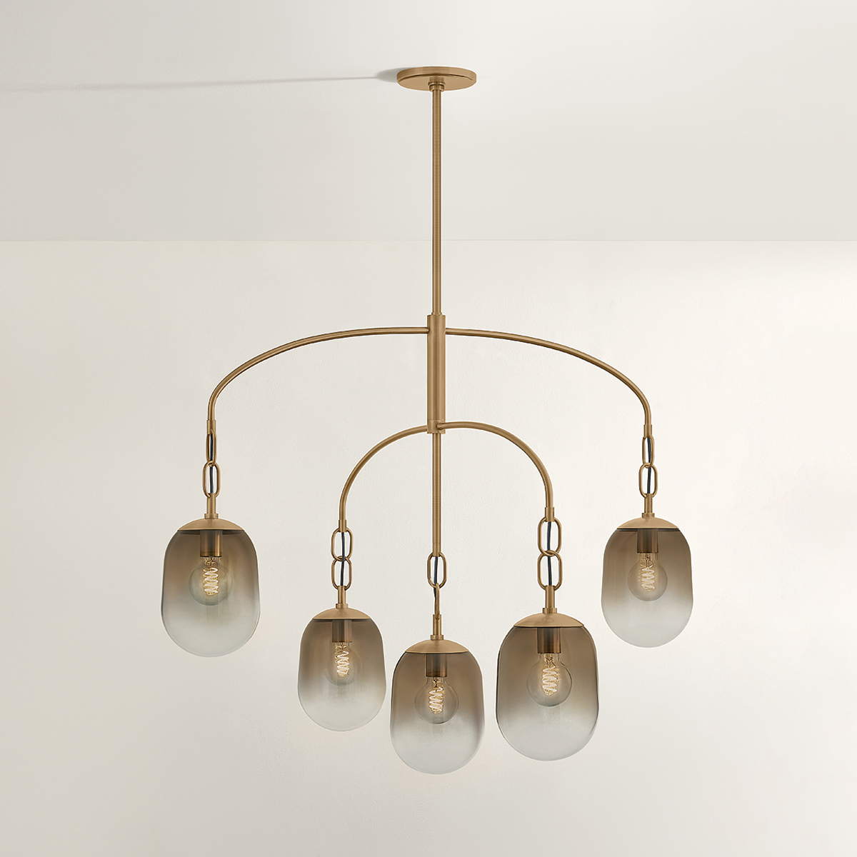 The Harvey chandelier’s dangling arms and artistic ombre glass are both Calderesque and faintly organic. Softly pill-shaped Dark Bronze glass shades drip from racetrack-shaped links on the sparse, arcing metal framework. The subtle industrial details provide a striking contrast to the otherwise playful silhouette. Available with 1, 5, or 7 lights and a Patina Brass finish, Harvey’s innovative spirit enlivens modern interiors.