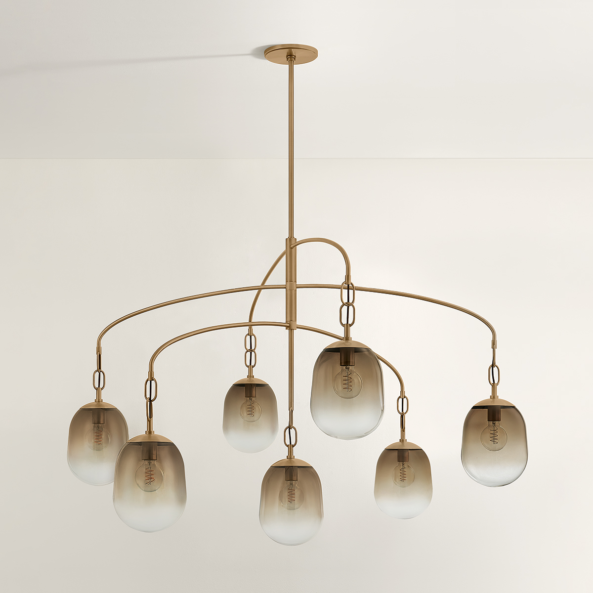 The Harvey chandelier’s dangling arms and artistic ombre glass are both Calderesque and faintly organic. Softly pill-shaped Dark Bronze glass shades drip from racetrack-shaped links on the sparse, arcing metal framework. The subtle industrial details provide a striking contrast to the otherwise playful silhouette. Available with 1, 5, or 7 lights and a Patina Brass finish, Harvey’s innovative spirit enlivens modern interiors.