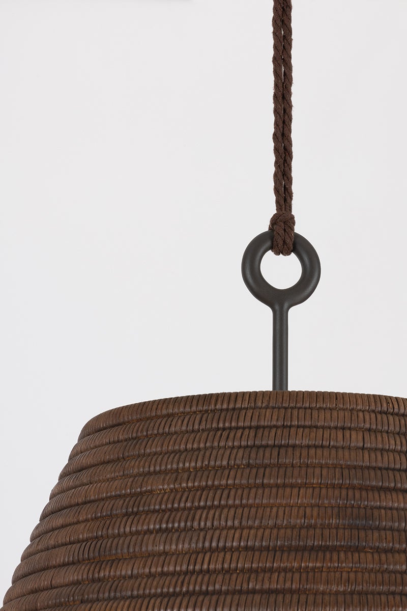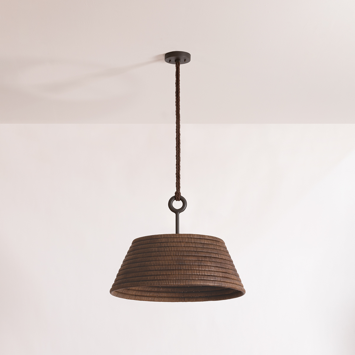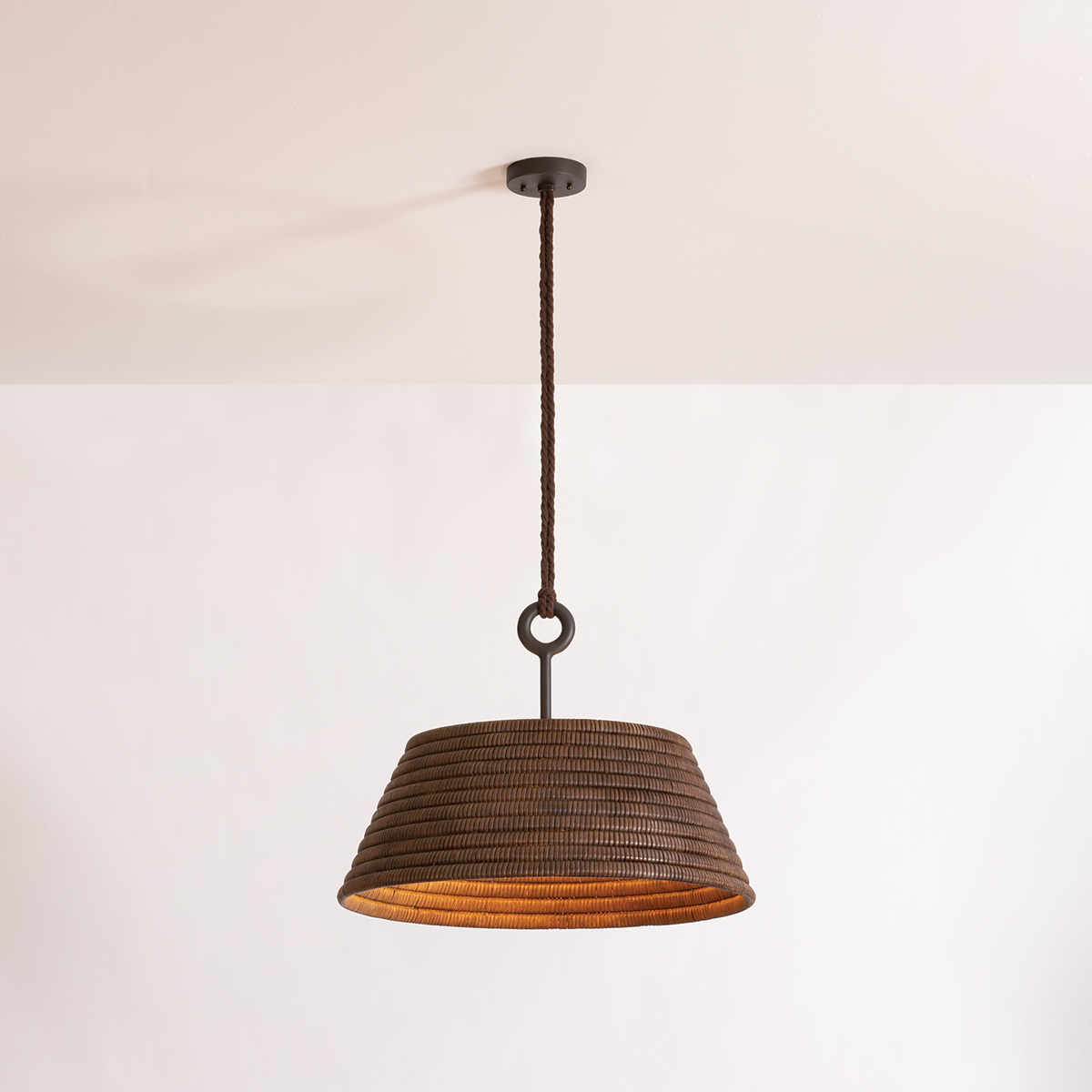 Inspired by artisanal handicraft, this pendant features an elegant woven natural shade paired with robust forged metalwork. The basket-like shape of the shade, with its uniform weave and simple top loop, recalls nautical motifs. Sequoia is available in two sizes with two finish options, both of which complement the rattan's natural earthy tones.