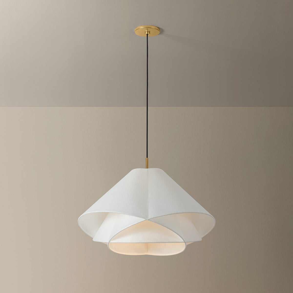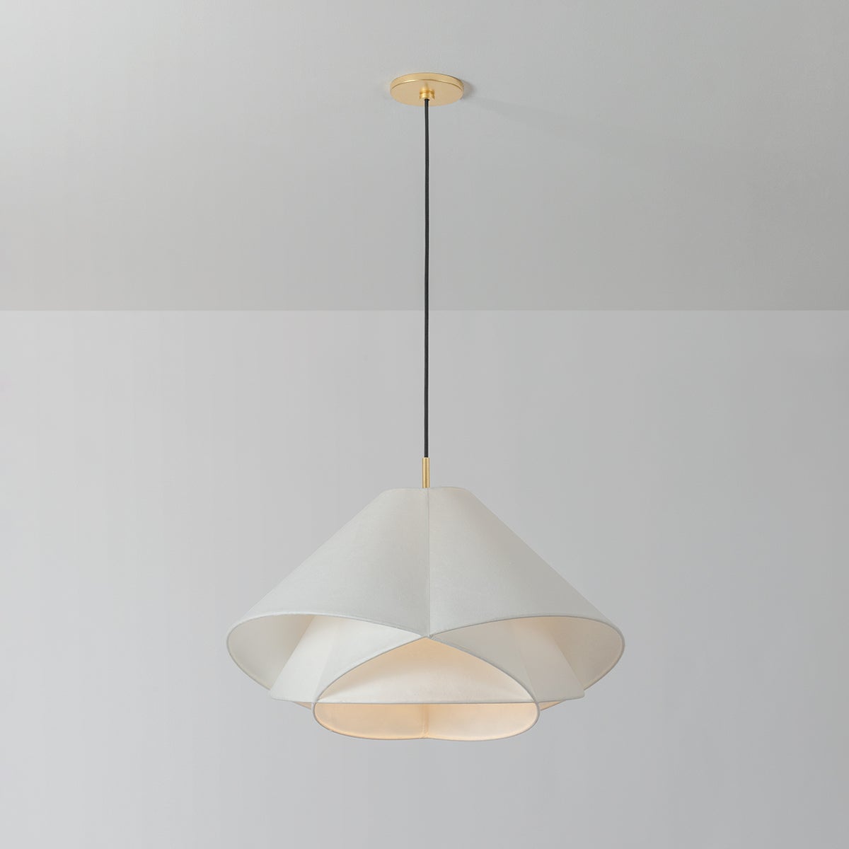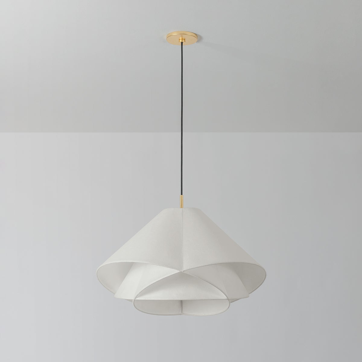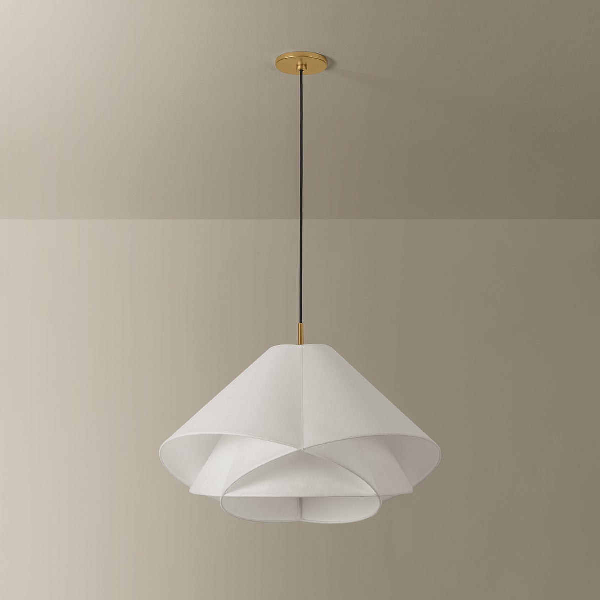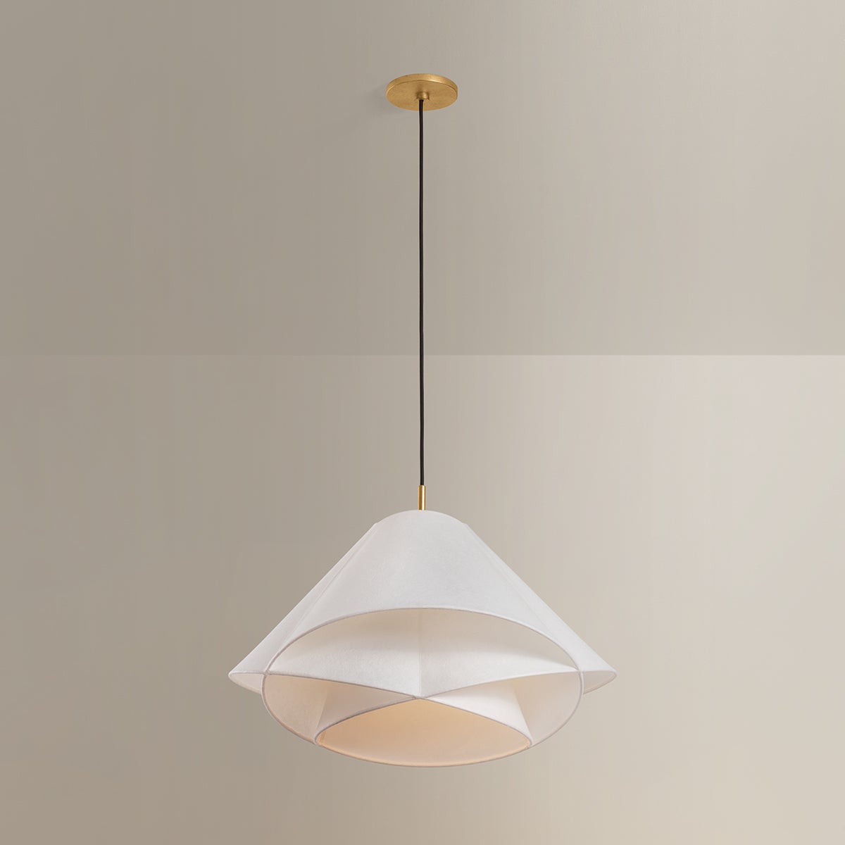 The dynamically layered design of the Edna pendant seeks to push the boundaries of what is possible with a handmade paper shade construction. Constructed as one piece, the shade is comprised of three identical pieces that intersect one another in a perfect geometric array. This artful paper pendant is accented by a Vintage Gold Leaf finial and available in two sizes.