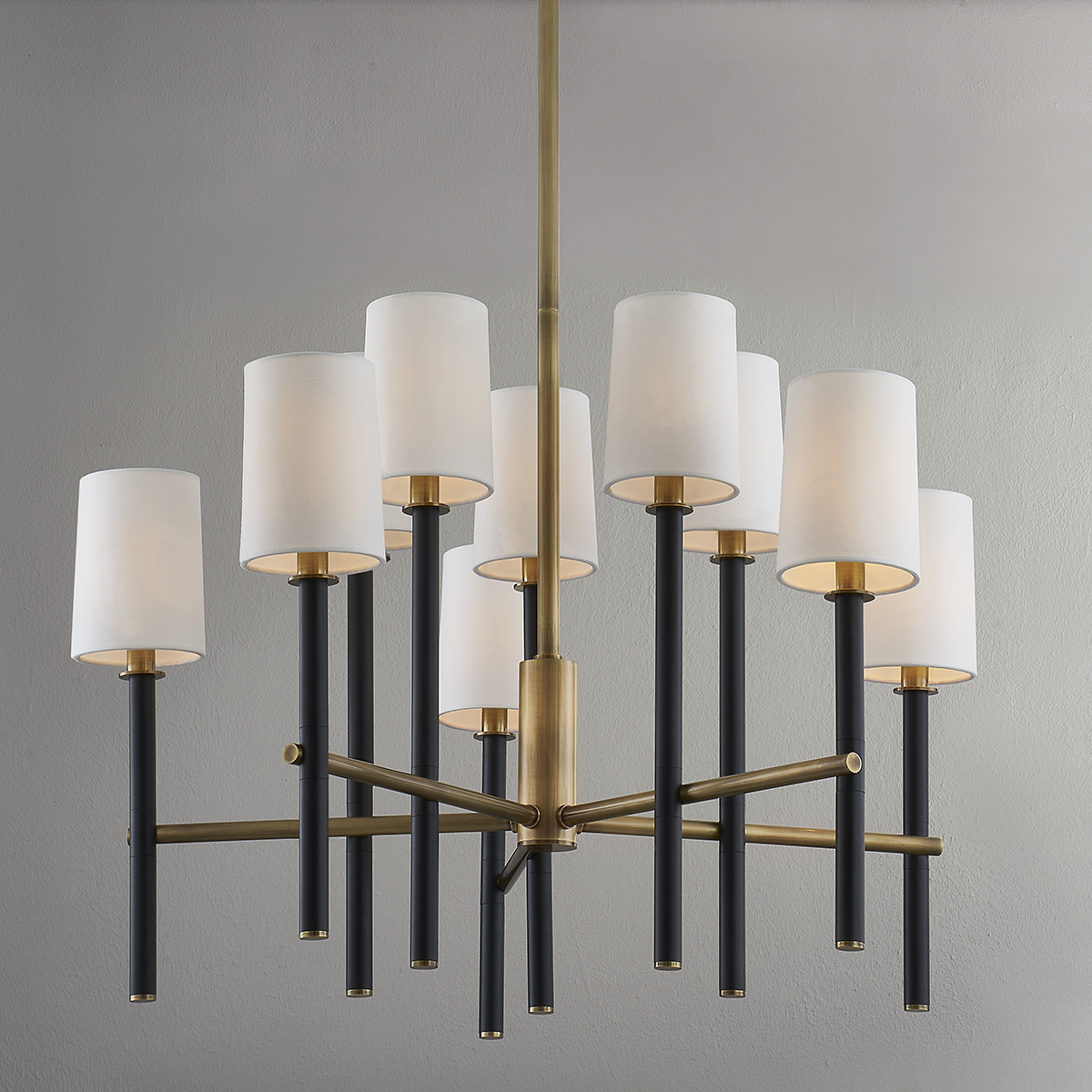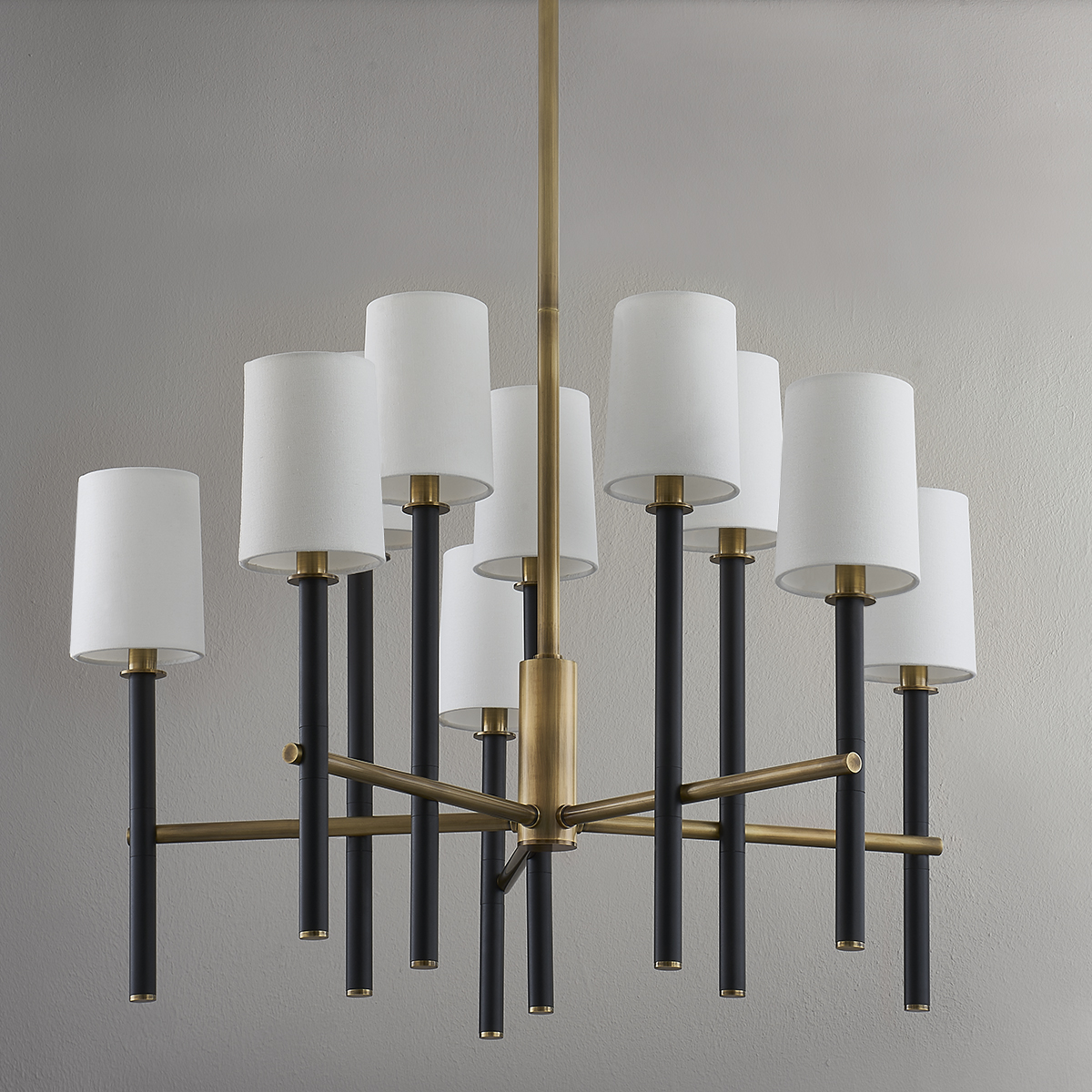 A traditional design with modern detailing, Belvedere is defined by its uniquely held candlesticks. Each Patina Brass arm on the ten-light chandelier holds two Texture Black candlesticks pierced through on opposing sides of the arm. The candlestick on the one-light wall sconce is pinched in place by two Patina Brass arms. The perfectly balanced two-tone metal finish adds sophistication.