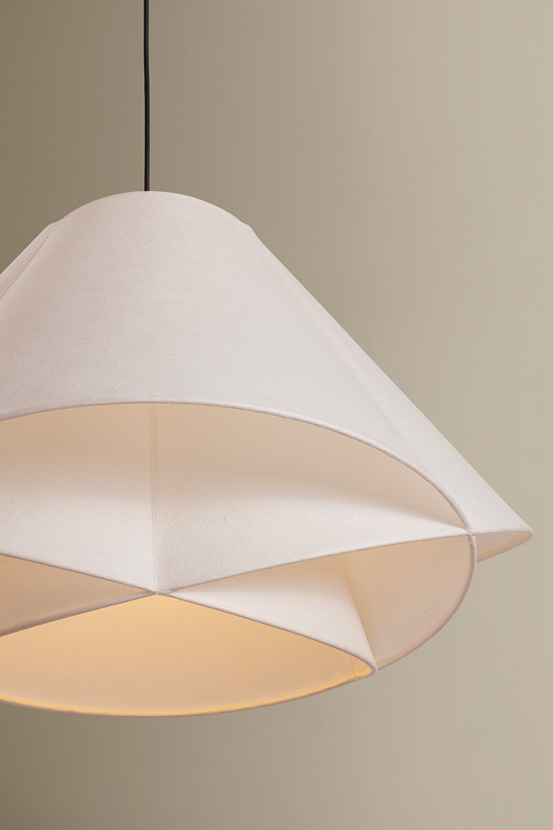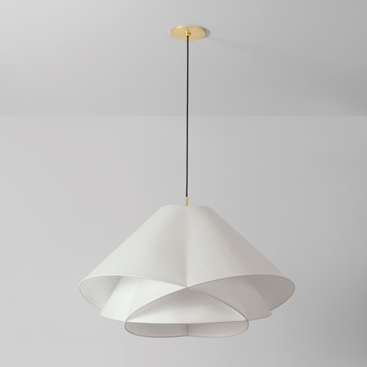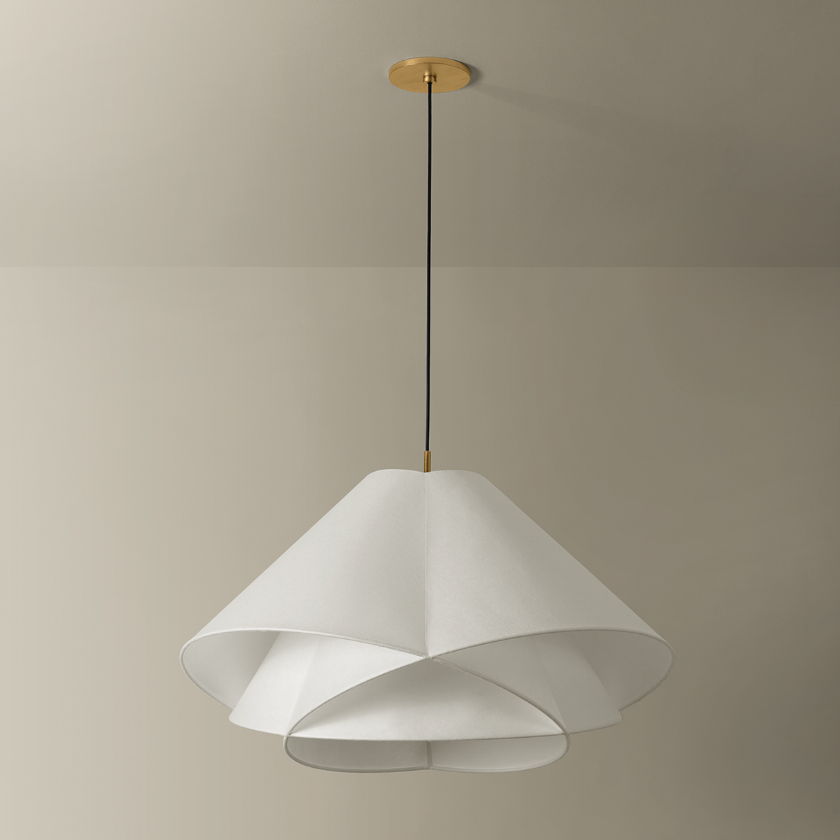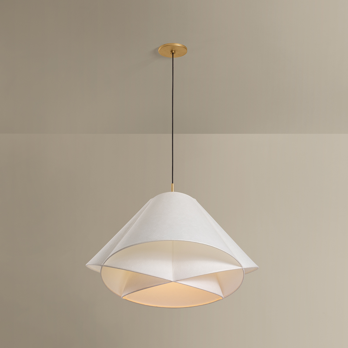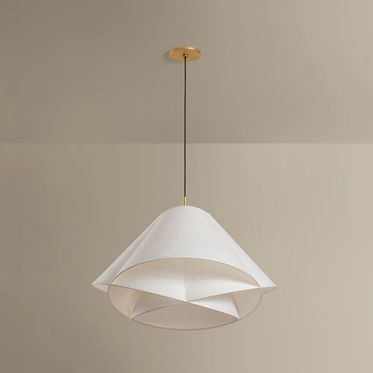 The dynamically layered design of the Edna pendant seeks to push the boundaries of what is possible with a handmade paper shade construction. Constructed as one piece, the shade is comprised of three identical pieces that intersect one another in a perfect geometric array. This artful paper pendant is accented by a Vintage Gold Leaf finial and available in two sizes.