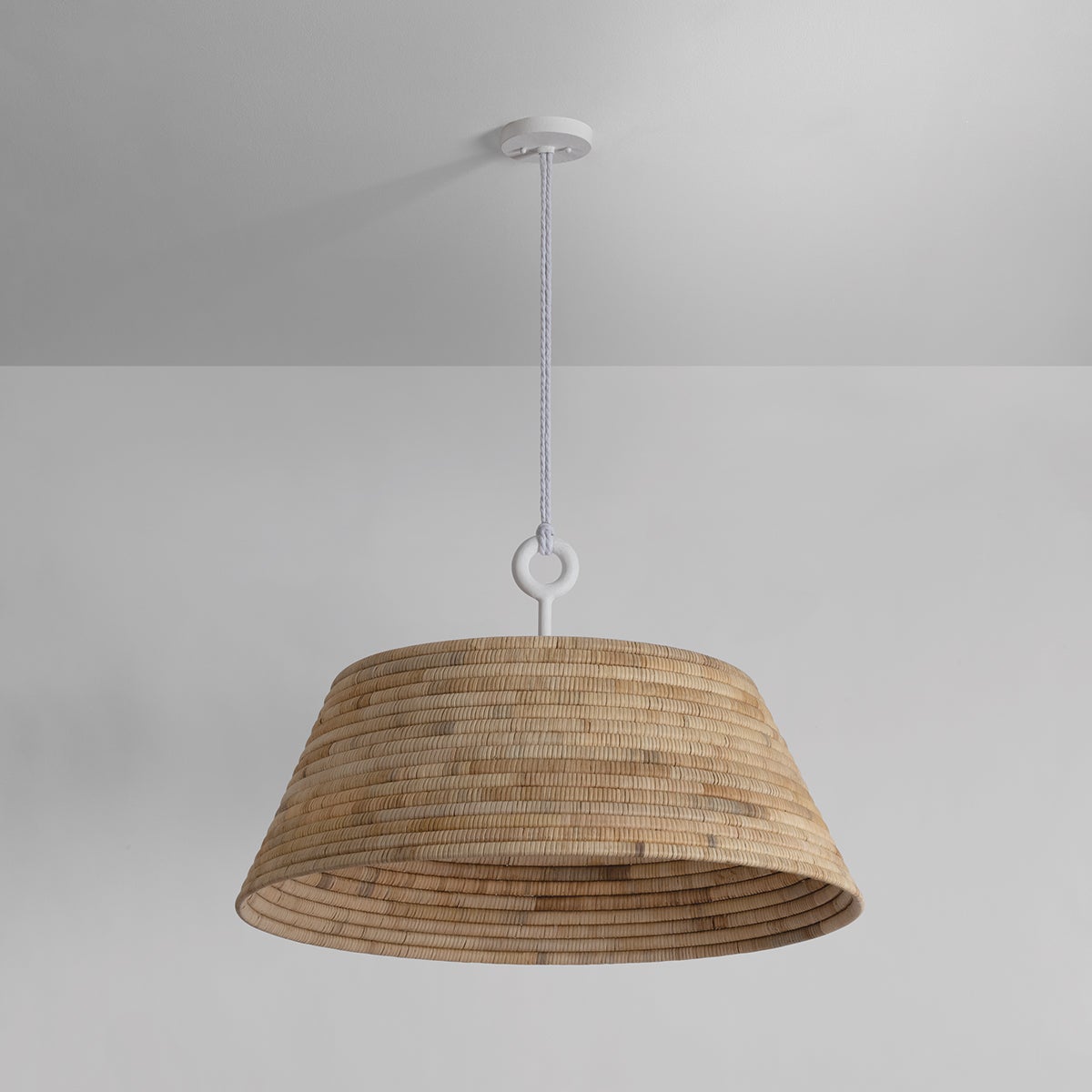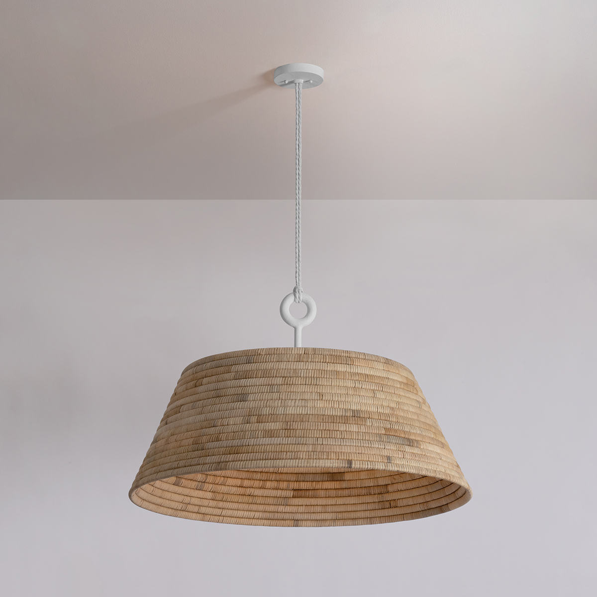 Inspired by artisanal handicraft, this pendant features an elegant woven natural shade paired with robust forged metalwork. The basket-like shape of the shade, with its uniform weave and simple top loop, recalls nautical motifs. Sequoia is available in two sizes with two finish options, both of which complement the rattan's natural earthy tones.