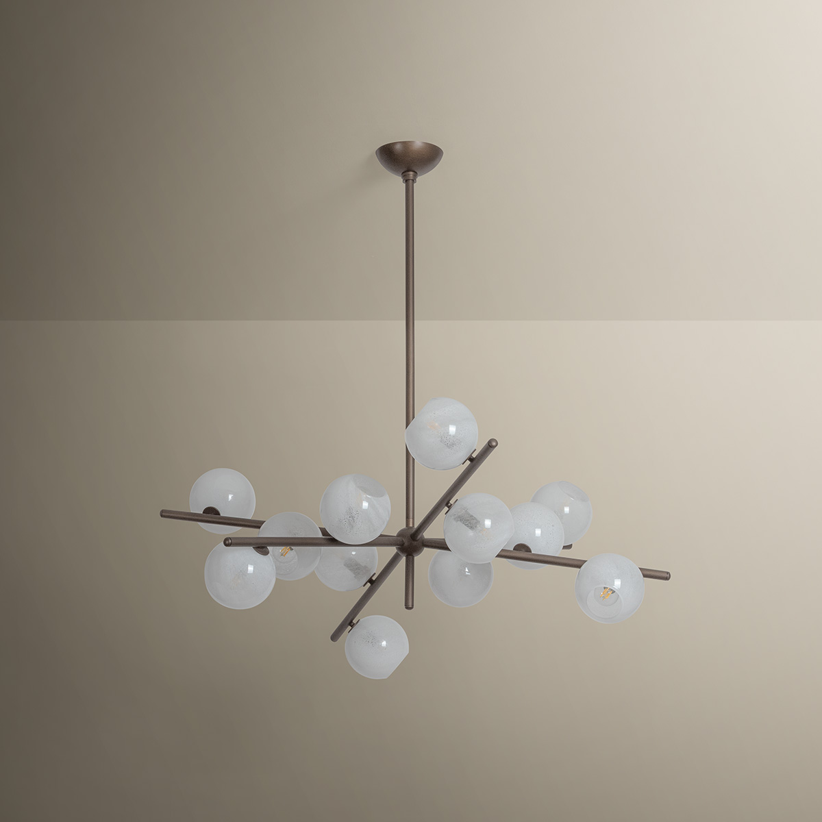 Sonny takes inspiration from a mid-century sputnik chandelier, reimagined with an organic, staggered rhythm. Finished in Bronze Leaf, slender arms extend outward, culminating in a softly glowing cloud seedy glass globe. The seemingly randomized arrangement creates a dynamic, almost celestial composition. Available as a 4-light sconce and a 12- or 20-light chandelier, Sonny serves as a stunning centerpiece for dining or living spaces.