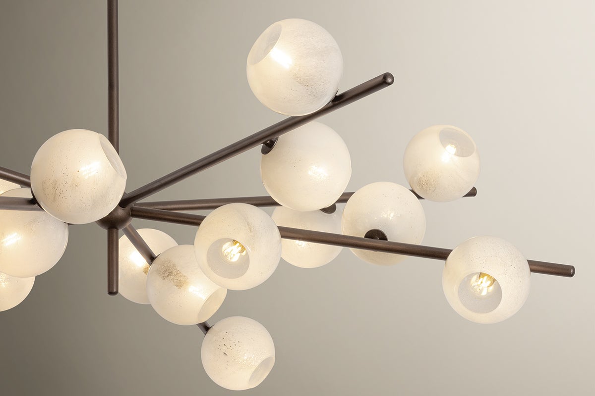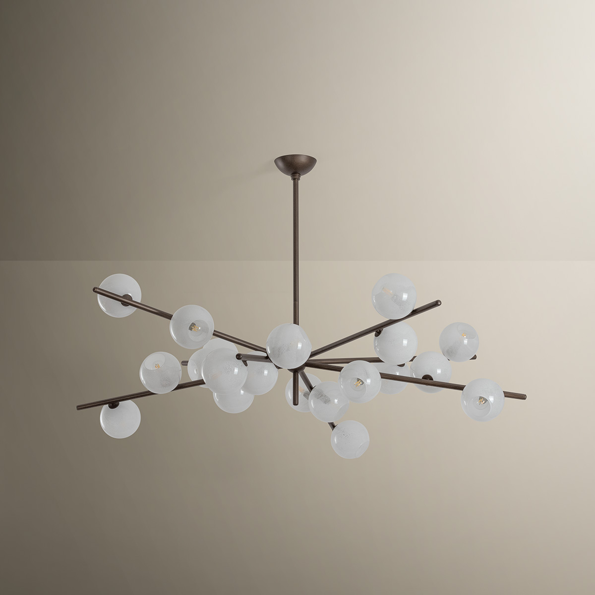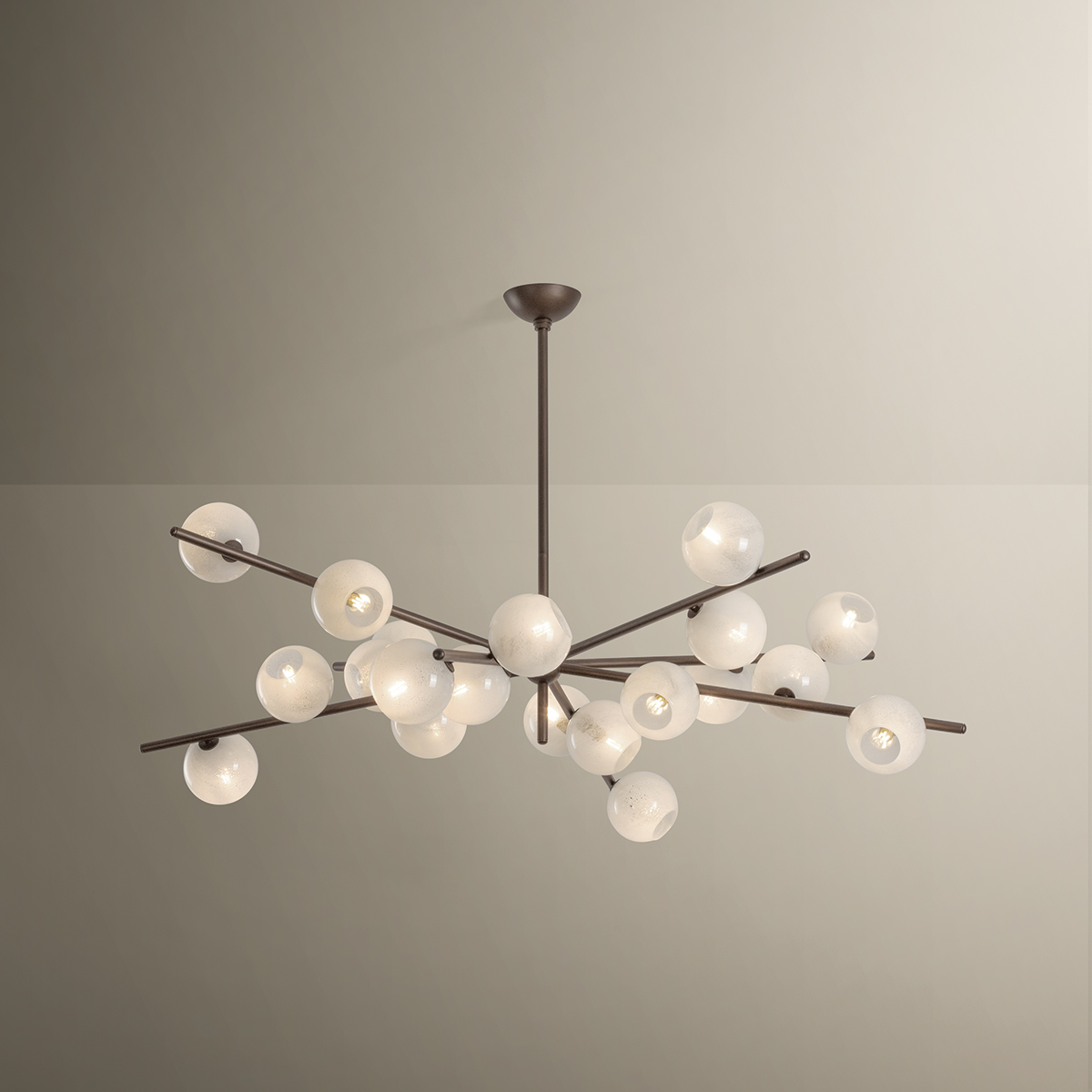 Sonny takes inspiration from a mid-century sputnik chandelier, reimagined with an organic, staggered rhythm. Finished in Bronze Leaf, slender arms extend outward, culminating in a softly glowing cloud seedy glass globe. The seemingly randomized arrangement creates a dynamic, almost celestial composition. Available as a 4-light sconce and a 12- or 20-light chandelier, Sonny serves as a stunning centerpiece for dining or living spaces.