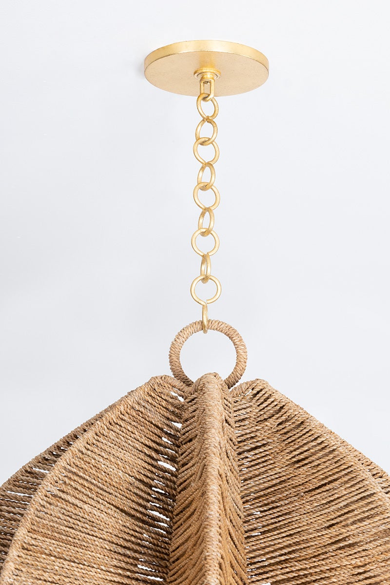 Crafted from Natural Abaca rope, this botanically-inspired pendant emanates charm with an intricate shape and weave pattern. Valatie is suspended by a Vintage Gold Leaf chain that melds with the natural hue of the Abaca while adding a luxurious touch. Available in two sizes, it creates a beautiful focal point above a dining table.