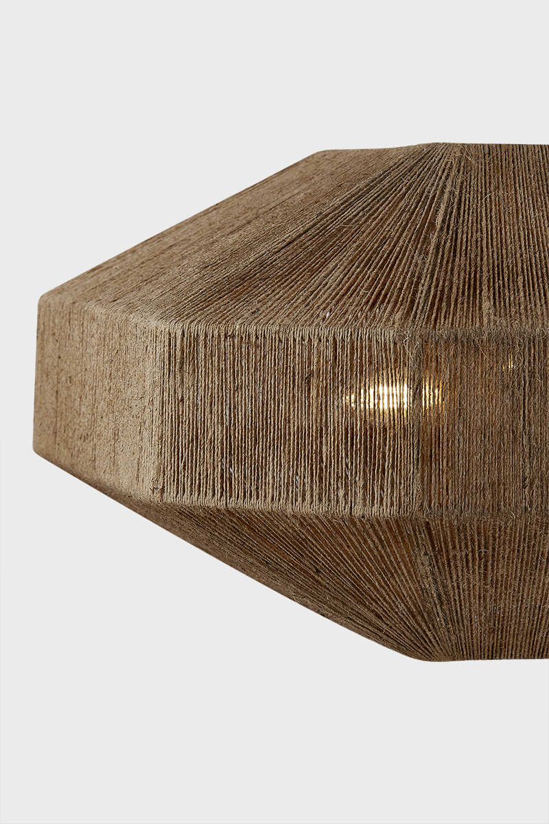 Designed to make an impact on large ceilings, Laken features a voluminous architectural shade. The artisanal jute-wrap technique gives the fixture its rich texture and warm color variance. Inside, a pinwheel cluster of lights emits powerful illumination. Laken is finished with Patina Brass metalwork, adding an antiqued quality that complements the rustic nature of the jute.