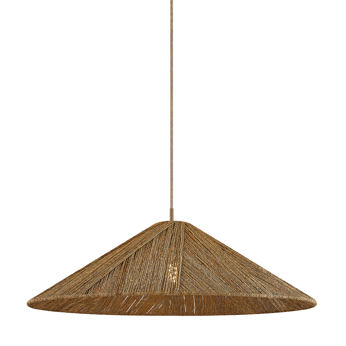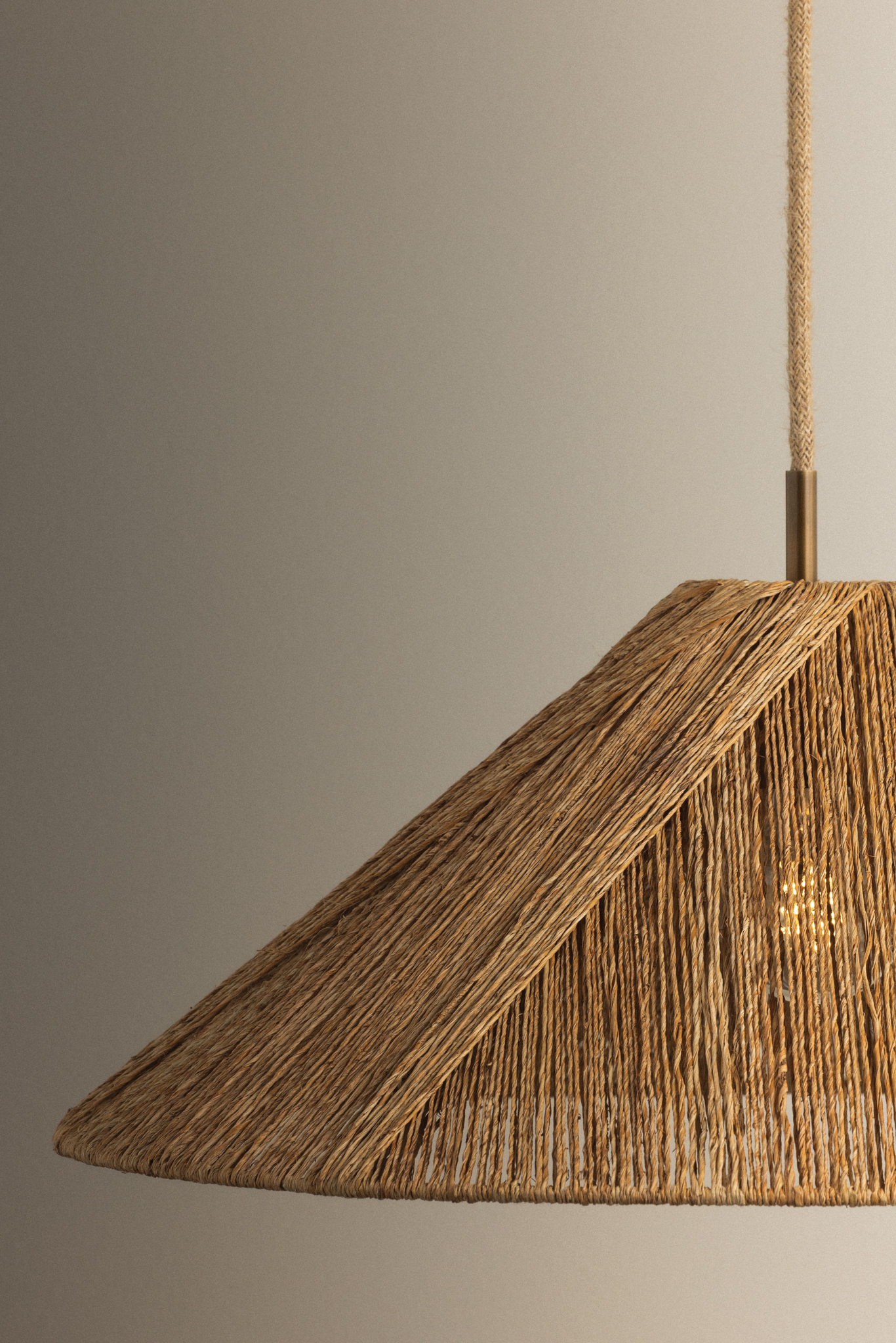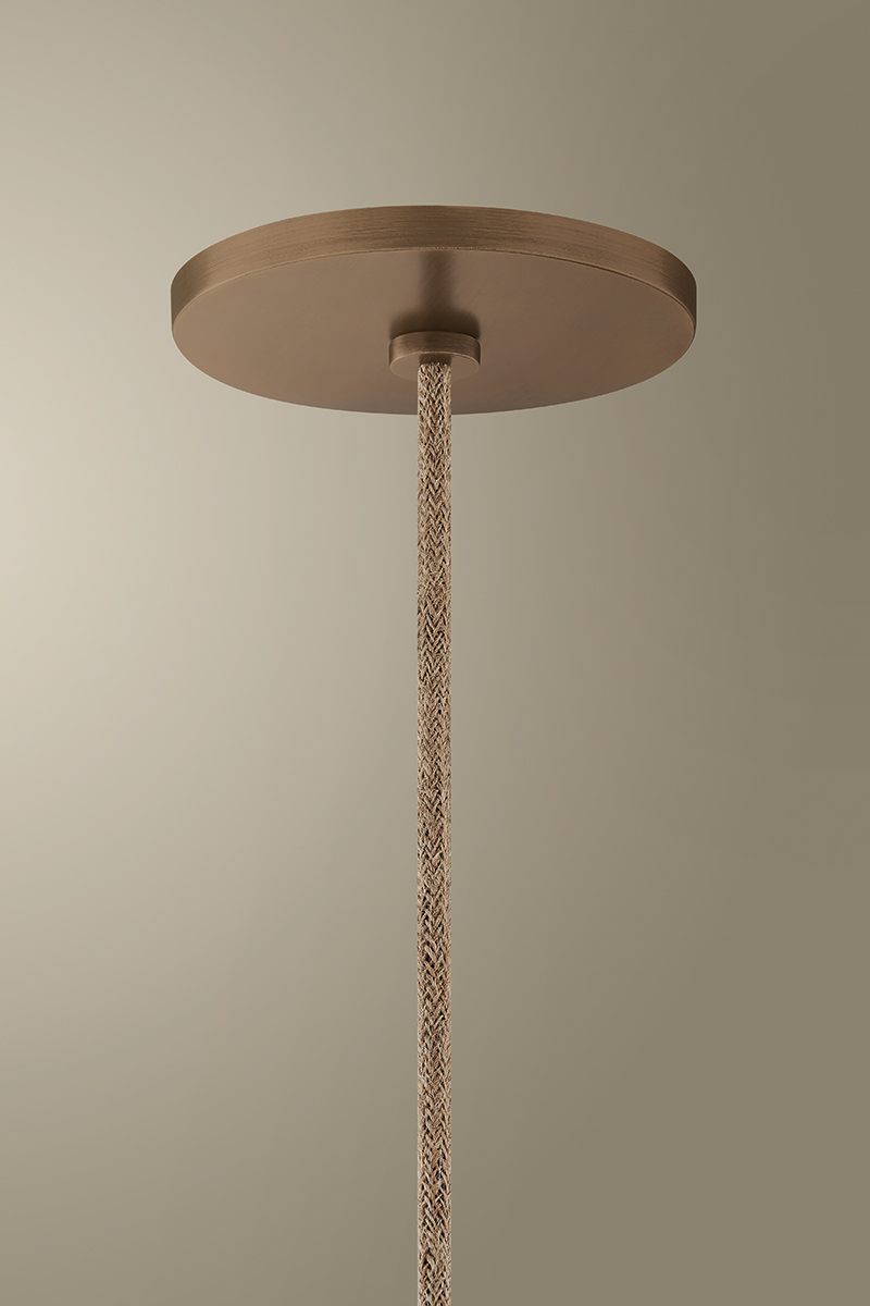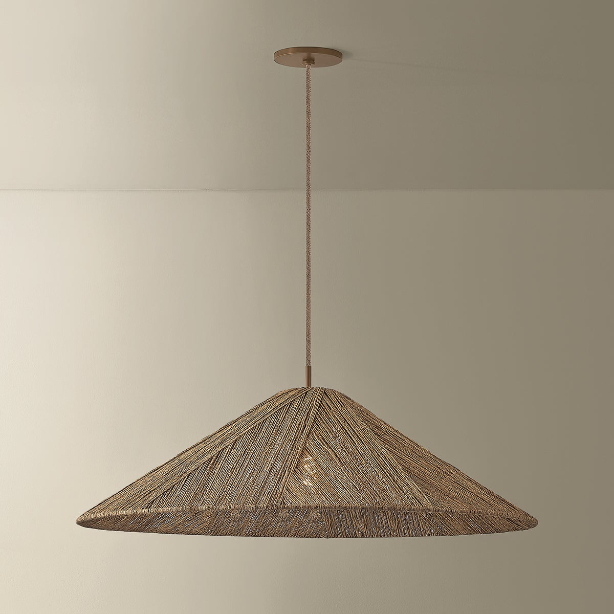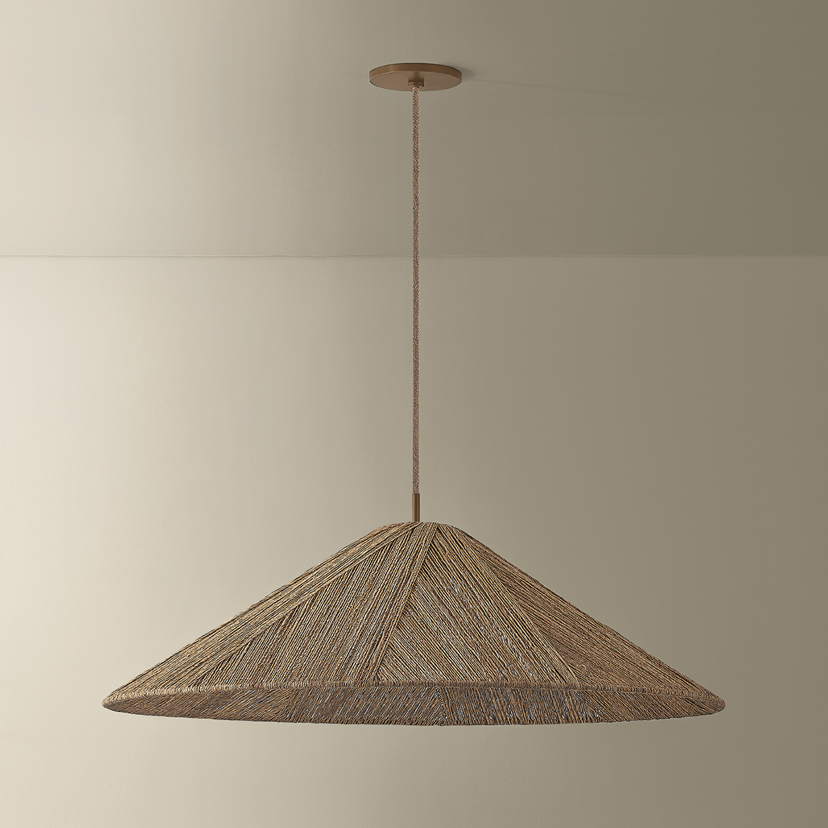 The Ahrens pendant celebrates the beauty of craftsmanship. A conical shade is hand-wrapped in natural jute string, woven in an unexpected hatching pattern that gives the form texture, rhythm, and depth. When illuminated, light filters through the weave to create a captivating play of shadow. Available in two sizes.