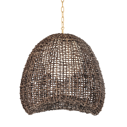 Embodying a sense of refuge, warmth, and reprieve, the Irvine pendant recalls a traditional Vietnamese hanging lantern with a modern, sculptural twist. Featuring two tiers of rounded shapes that cinch in the center, the balanced silhouette appears to gently undulate overhead. The loose rattan weave allows light to sift through, casting a warm and inviting glow throughout a space. Suspended from a bronze chain, Irvine creates an elevated lighting experience. Part of our Chandler McLellan collection.