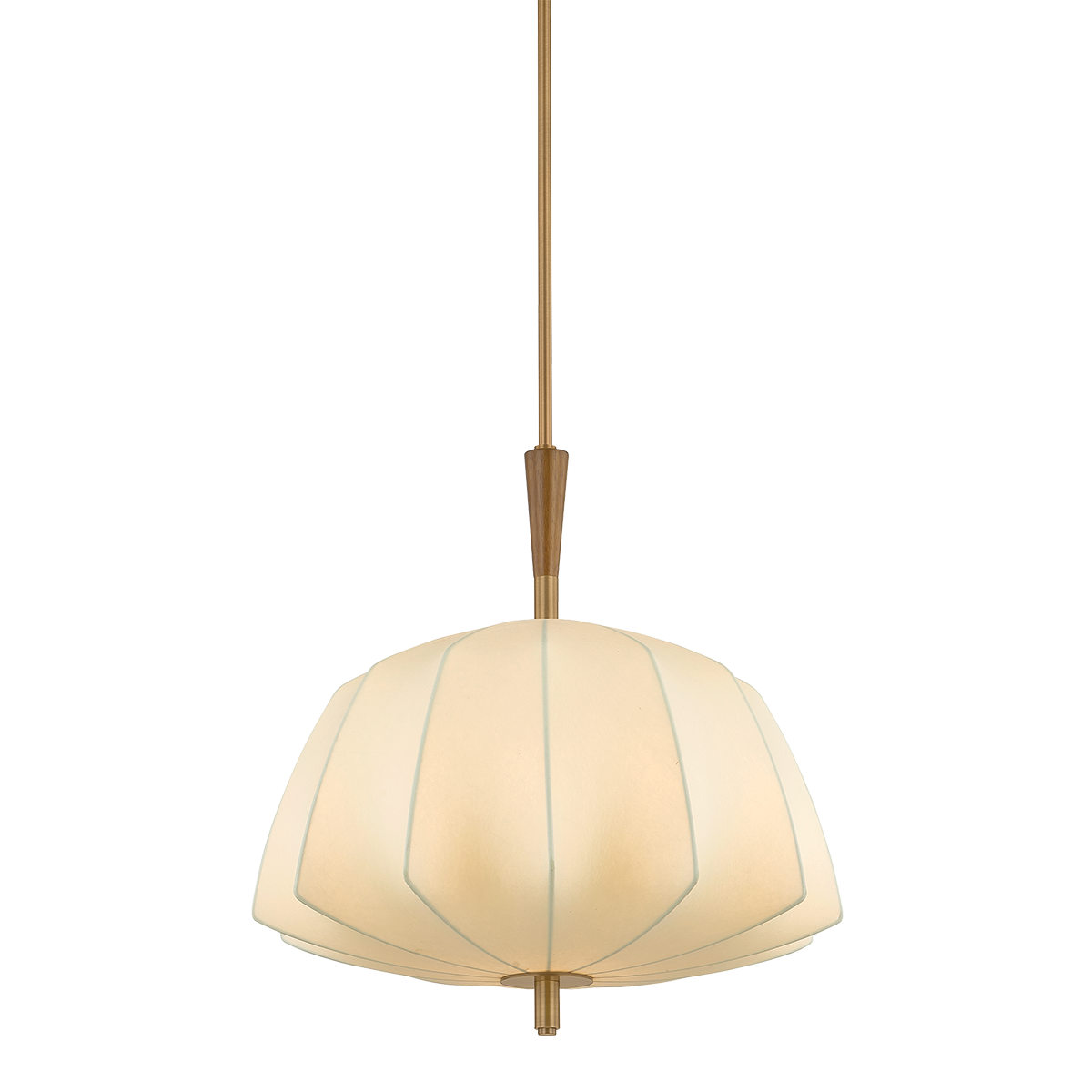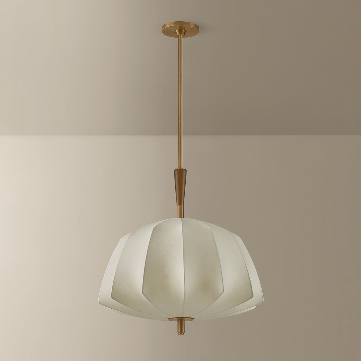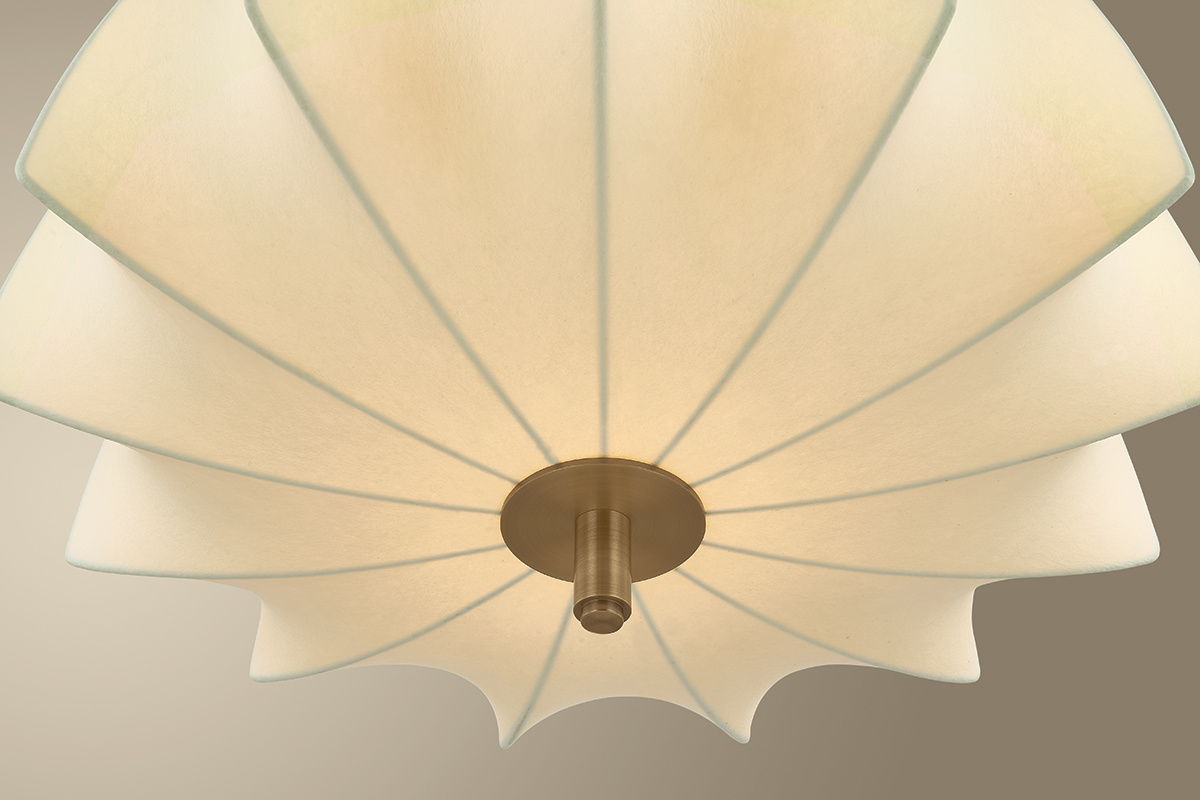 The Flinders pendant takes inspiration from mid-century lanterns, reimagined with sculptural softness. A large faceted shade made from cream polymer fabric diffuses light in quiet, dimensional folds. The Patina Brass suspension creates the effect of piercing the shade, accented by a turned oak wood detail on the top. Available in two sizes, Flinders adds an air of drama wherever it is placed.