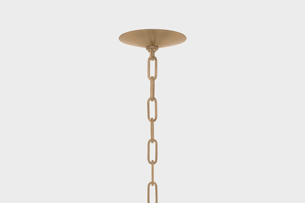 This artful transitional lantern features an inverted bell jar shape with a suspended glass disc at the top. The all-glass composition is fresh and unexpected, revealing clean metalwork inside. Available with 3 or 4 lights, Tully comes in Patina Brass for a classic finish or Vintage Pewter for a sleeker appearance.