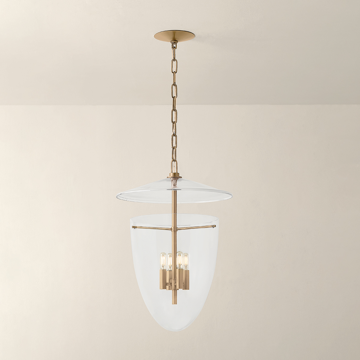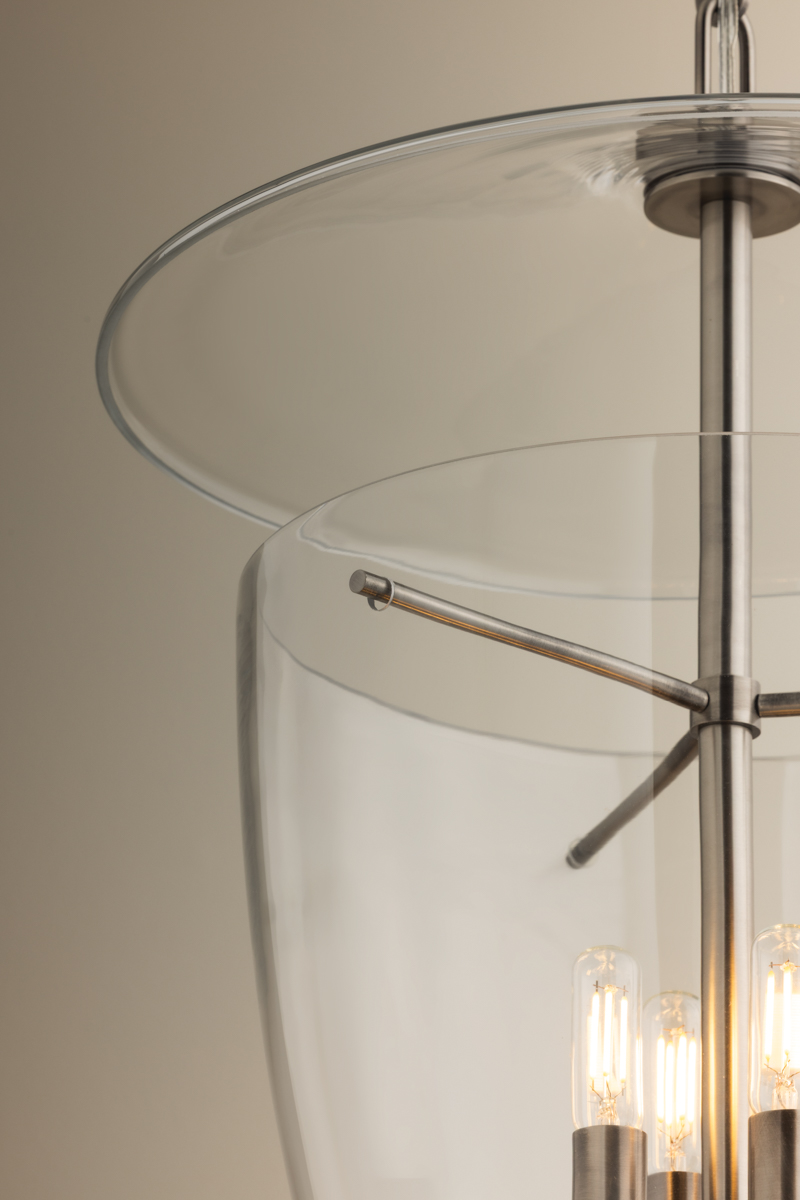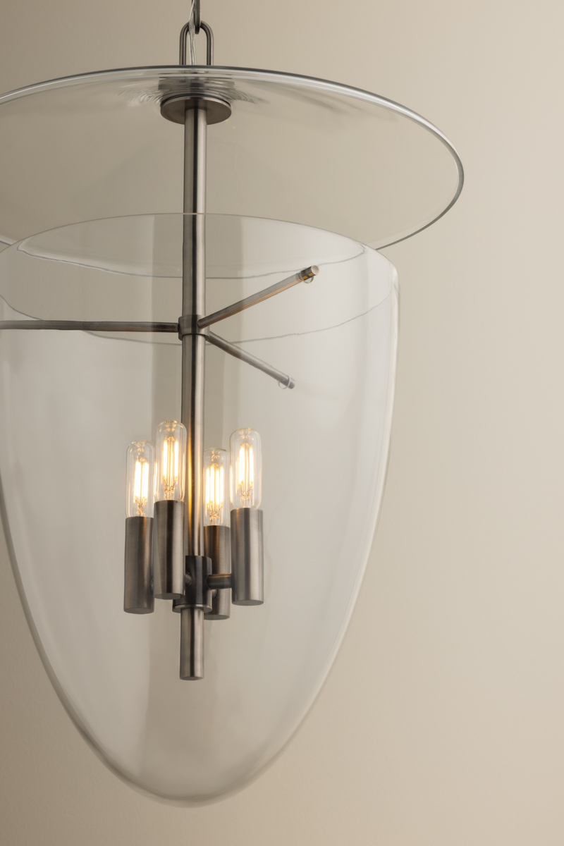 This artful transitional lantern features an inverted bell jar shape with a suspended glass disc at the top. The all-glass composition is fresh and unexpected, revealing clean metalwork inside. Available with 3 or 4 lights, Tully comes in Patina Brass for a classic finish or Vintage Pewter for a sleeker appearance.