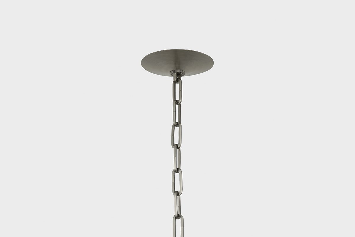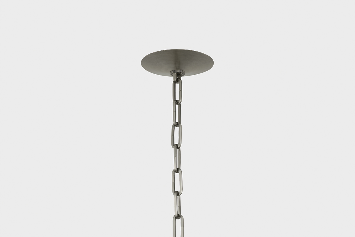This artful transitional lantern features an inverted bell jar shape with a suspended glass disc at the top. The all-glass composition is fresh and unexpected, revealing clean metalwork inside. Available with 3 or 4 lights, Tully comes in Patina Brass for a classic finish or Vintage Pewter for a sleeker appearance.