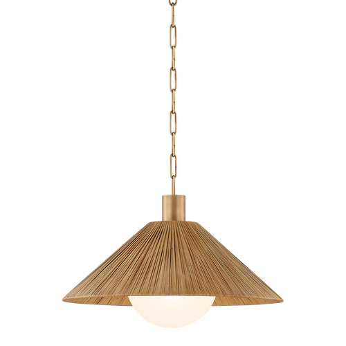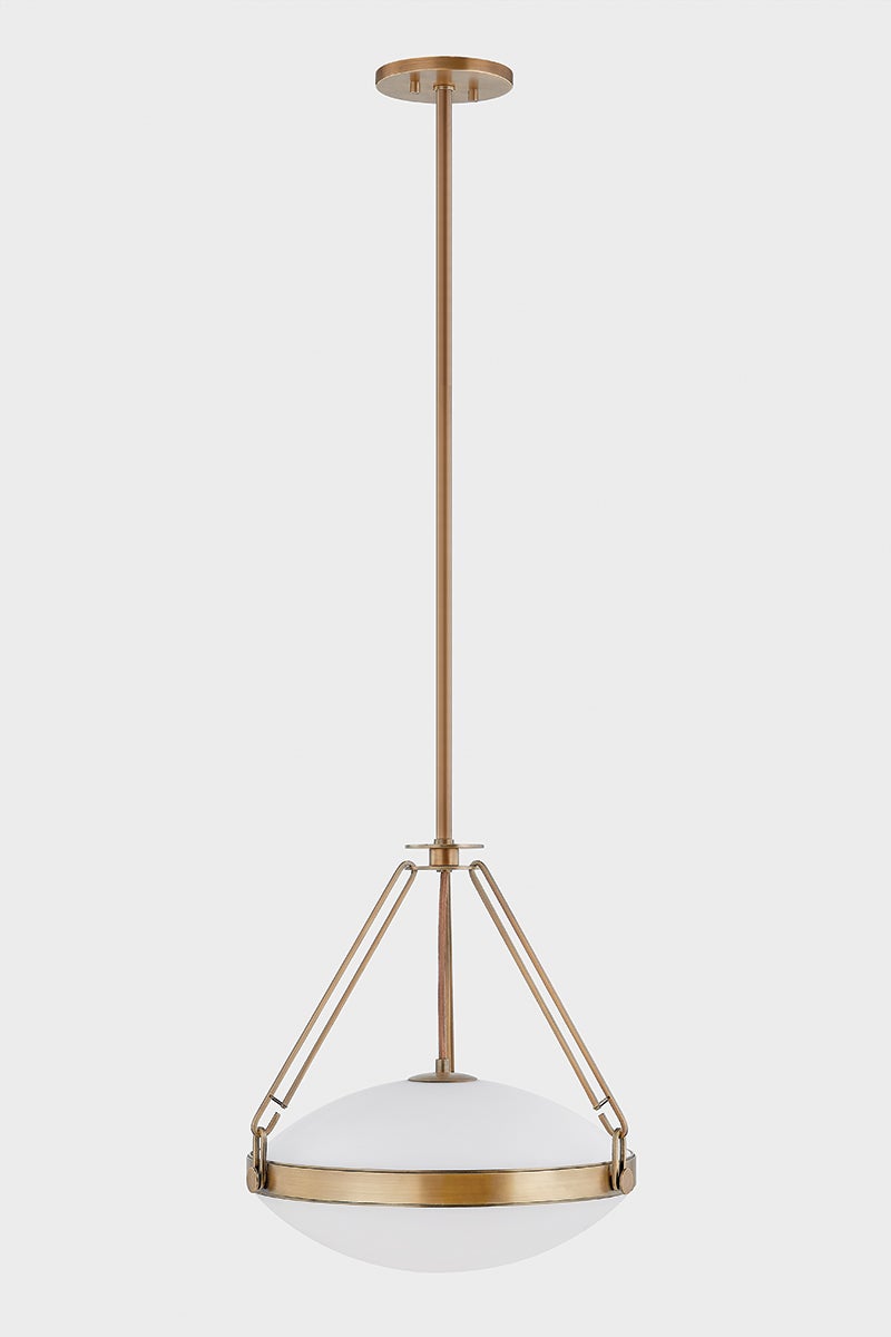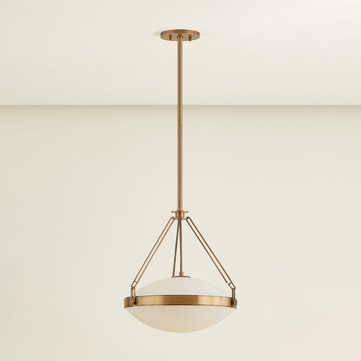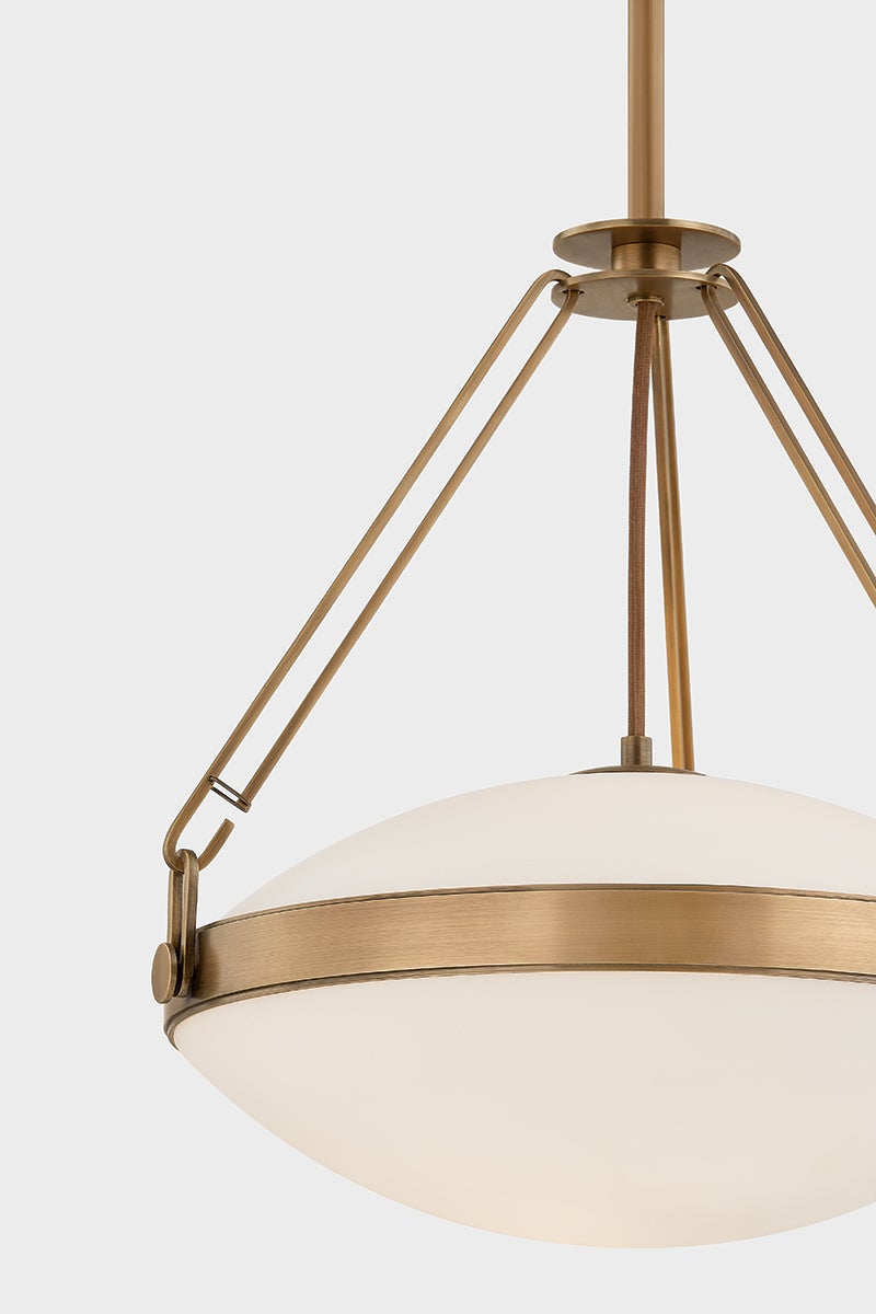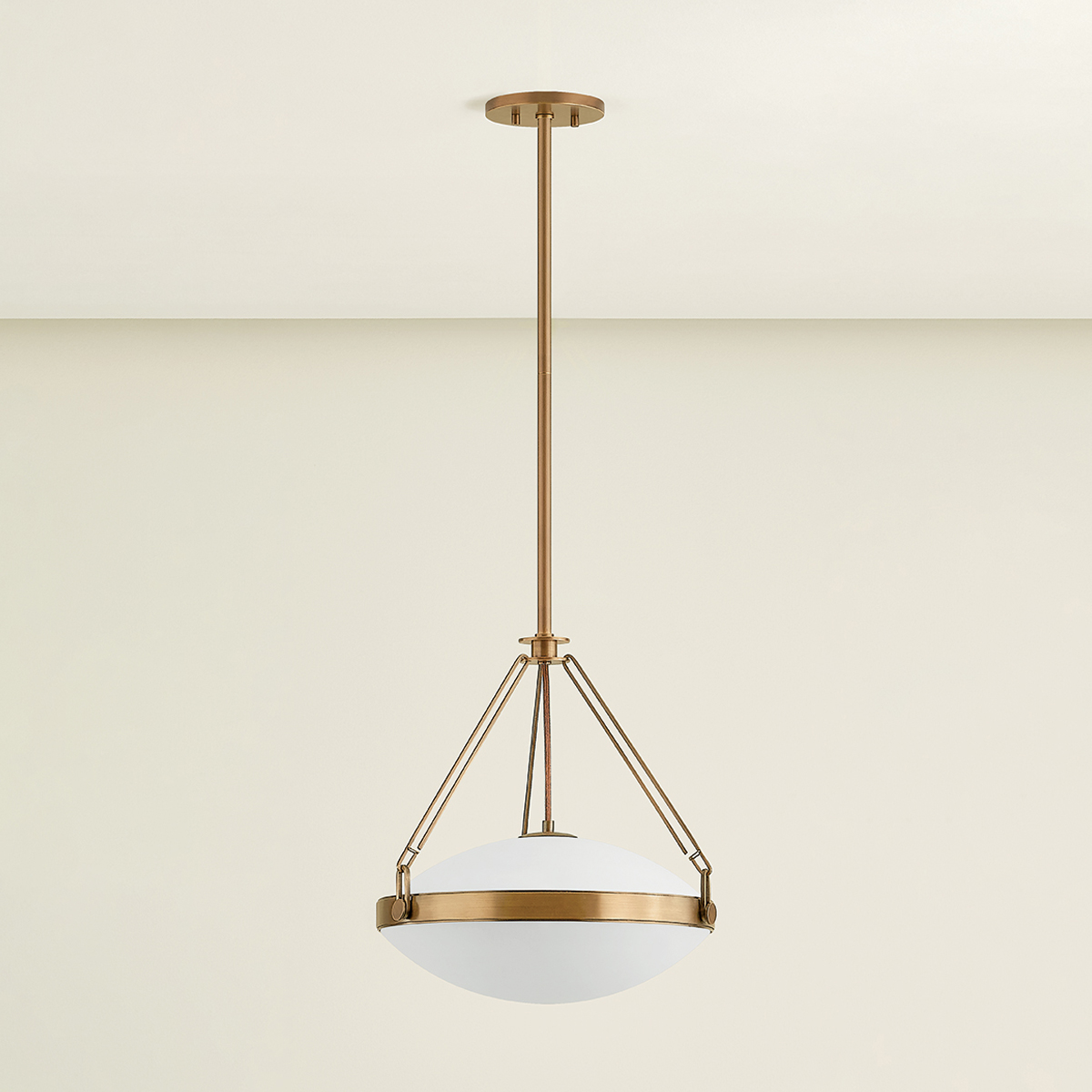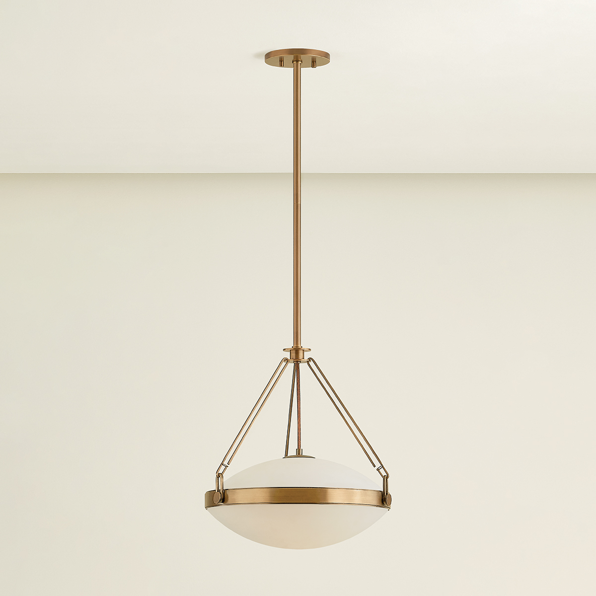 The Kade pendant updates a nostalgic shape with sleek, industrial metalwork and two large opal matte glass shades. Inspired by vintage elements, it features a striking suspension technique with three oversized loops connecting to the central housing above the fixture. The Patina Brass finish adds old-world finesse to the frame.