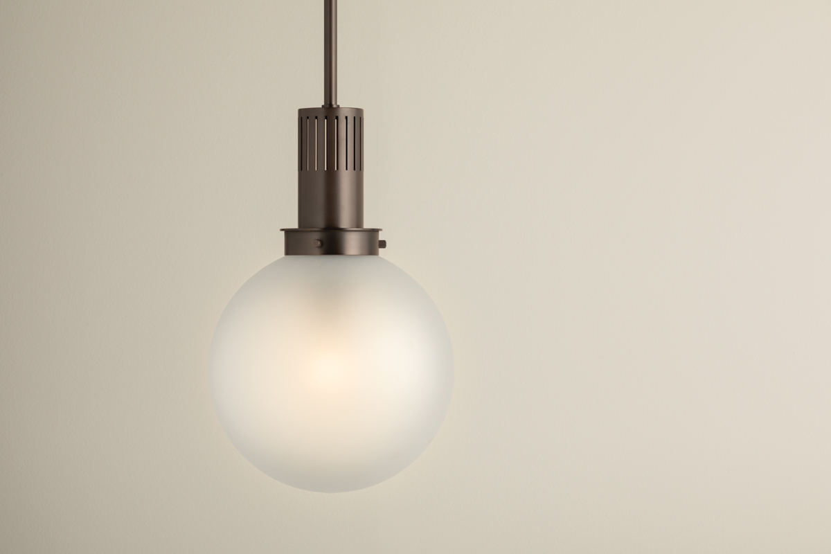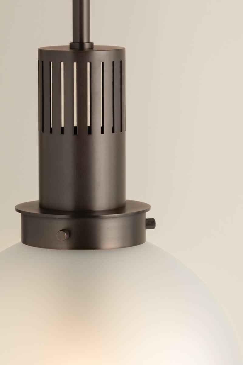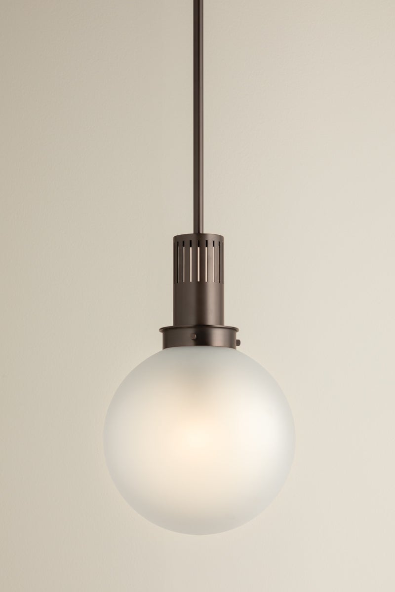 Tobias is a recognizable basic with a cool, modern feel. The oversized glass globe has been internally etched to add texture, but the real star of this pendant is the industrial-style chimney. Perforated with elongated slats, it sets the tone with either a Patina Brass or Bronze finish. This modernized retro staple comes in two sizes to suit your spatial needs.