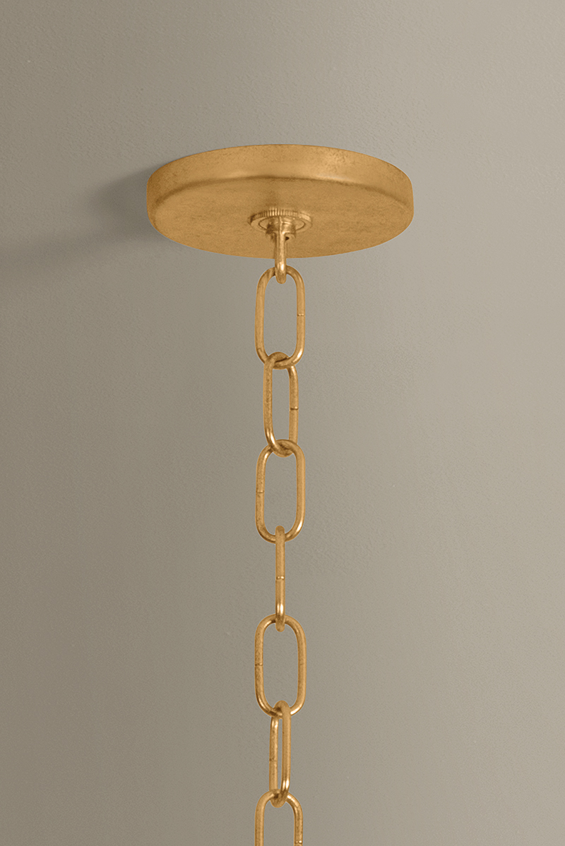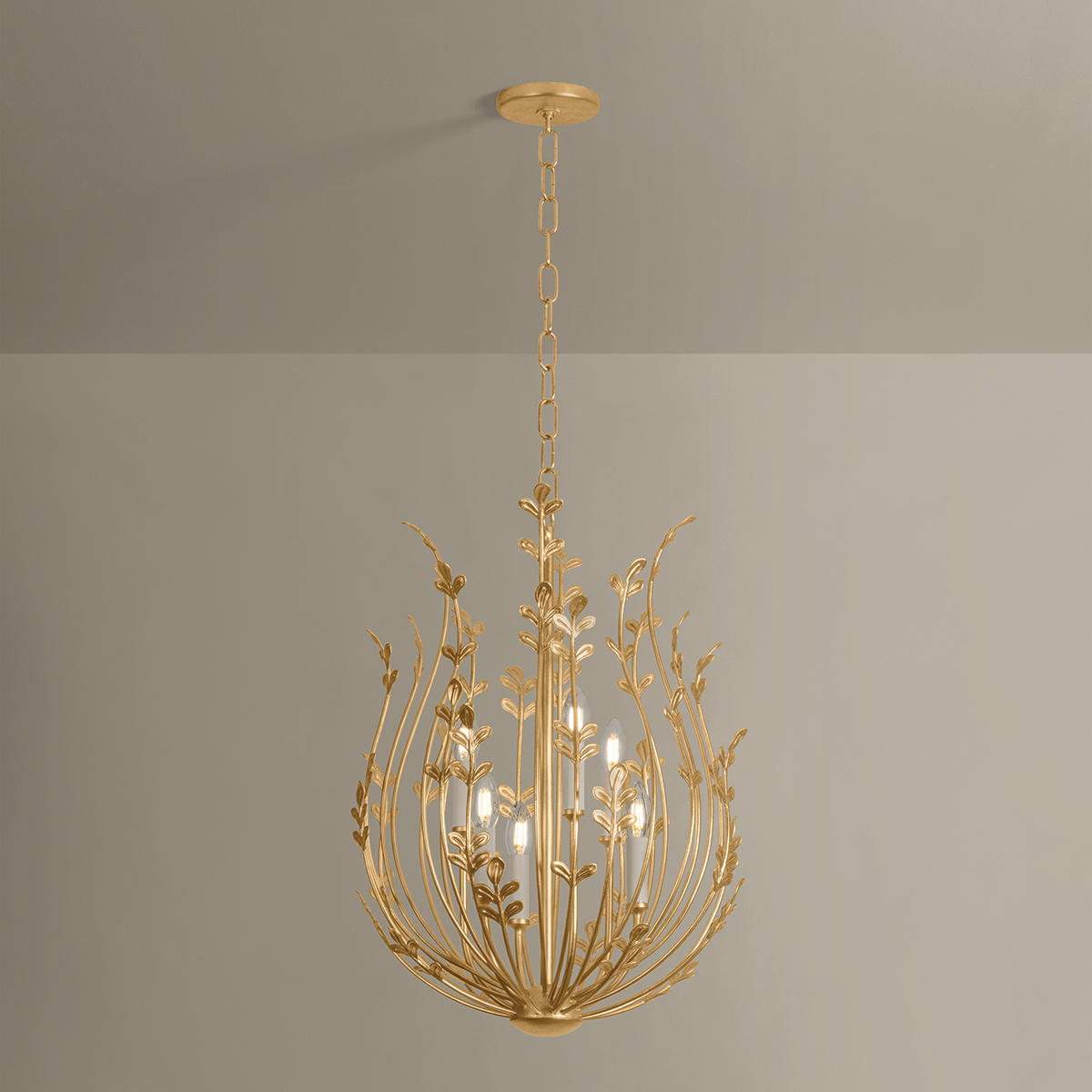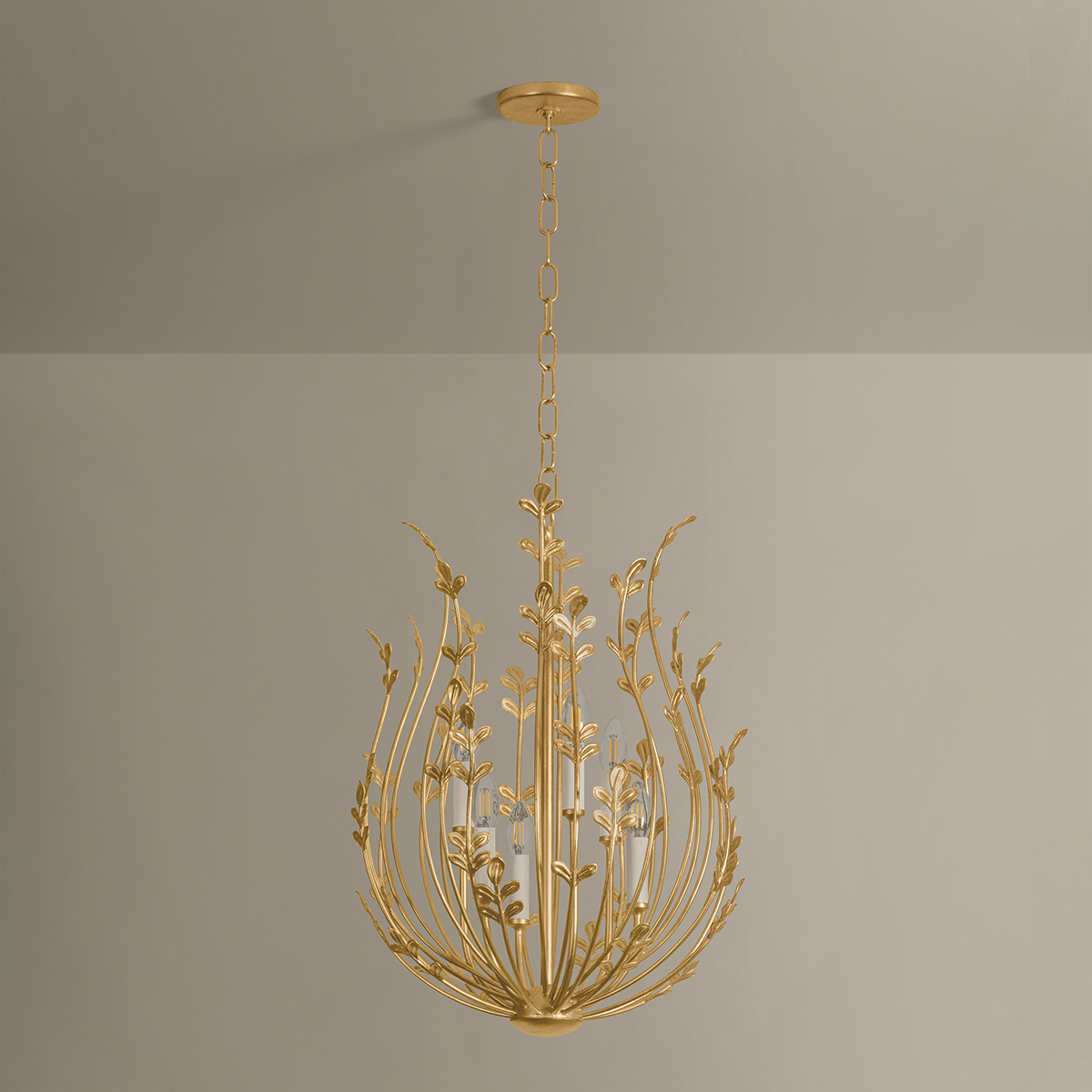 Somewhere between the concept of a pendant and a lantern floats the ethereal, botanically-inspired Delmore. Made of iron and finished in Vintage Gold Leaf, the airy frame features sprightly curving stems accented by etched leaf details. 3 or 6 candles are nested within the delicate composition, creating a bright and joyous celebration of nature.
