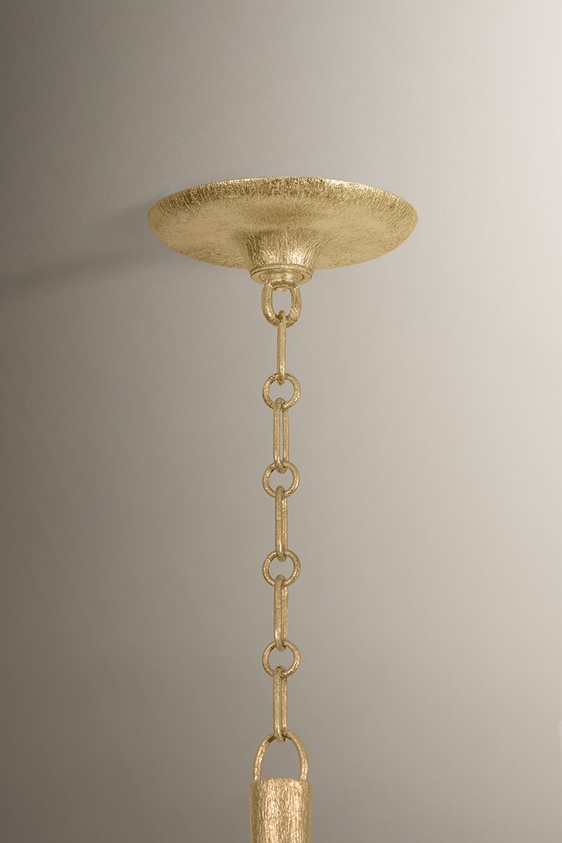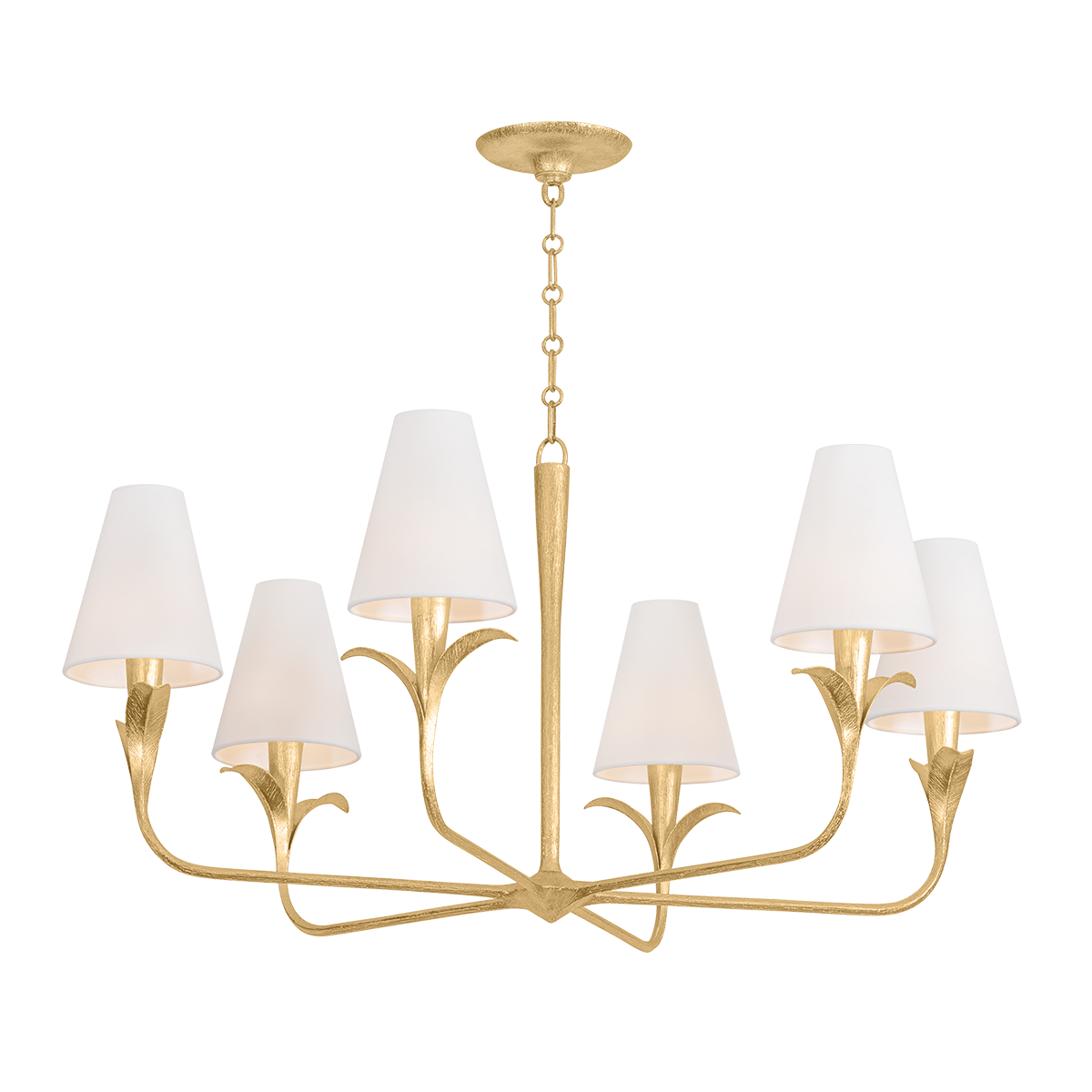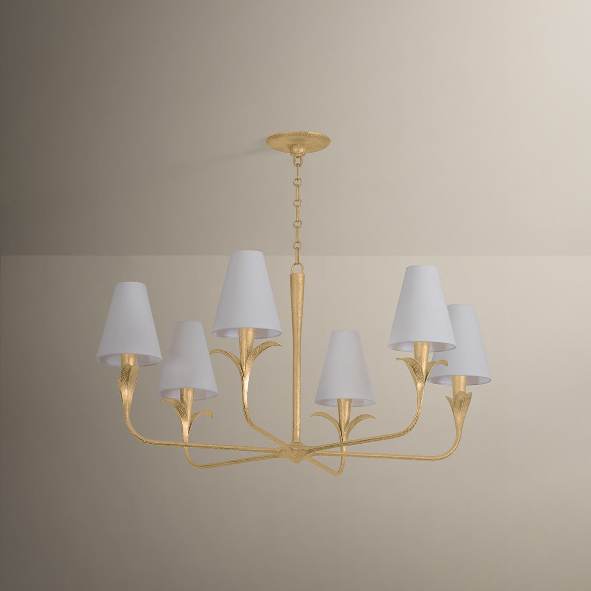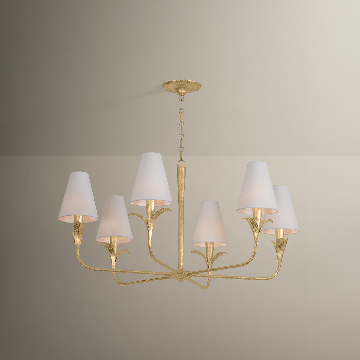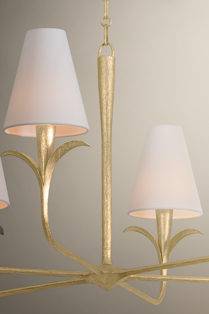 Equally captivating with or without the white linen shades, Quill blooms with botanical inspiration. Using dynamic shaping, it creates eye-catching statement pieces with curved armatures and leaf-like bobeche details. A Gilded Ivory finish lends a delicacy to the design. Available as a 1-light sconce and 6- and 8-light chandelier.