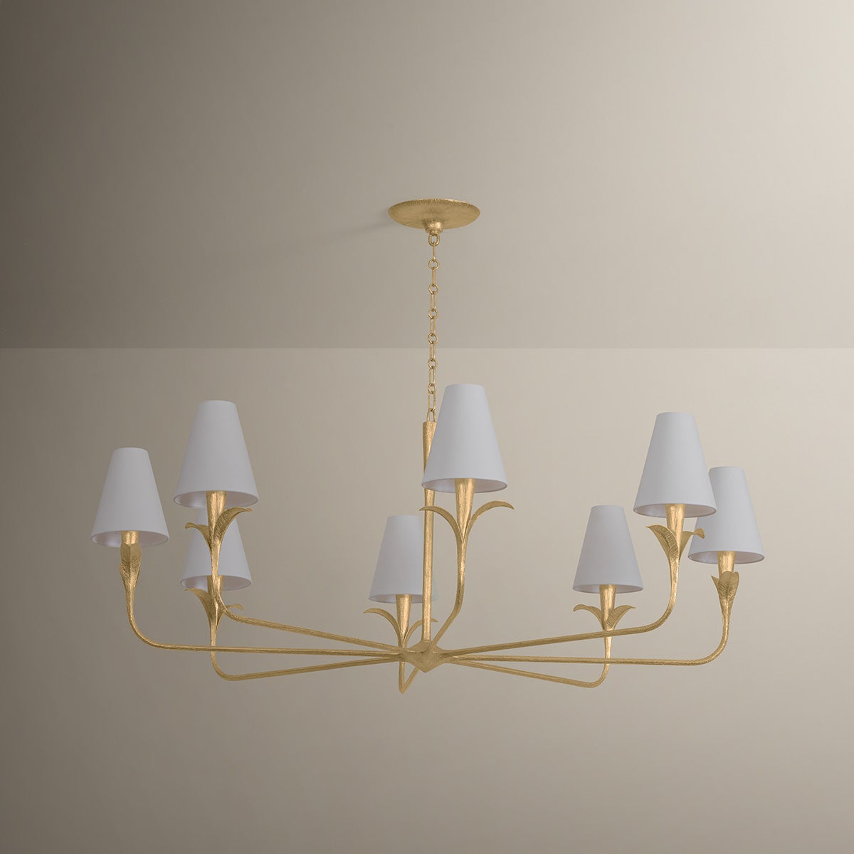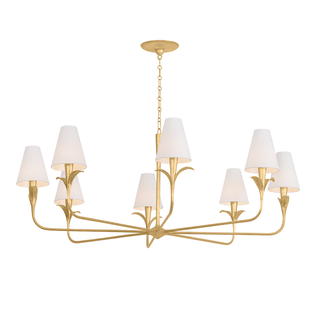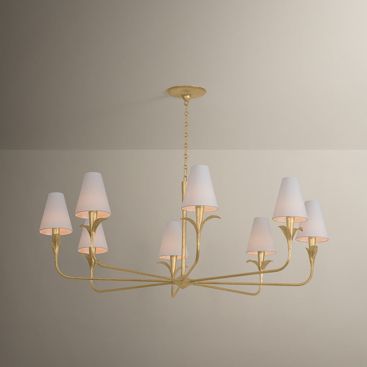 Equally captivating with or without the white linen shades, Quill blooms with botanical inspiration. Using dynamic shaping, it creates eye-catching statement pieces with curved armatures and leaf-like bobeche details. A Gilded Ivory finish lends a delicacy to the design. Available as a 1-light sconce and 6- and 8-light chandelier.