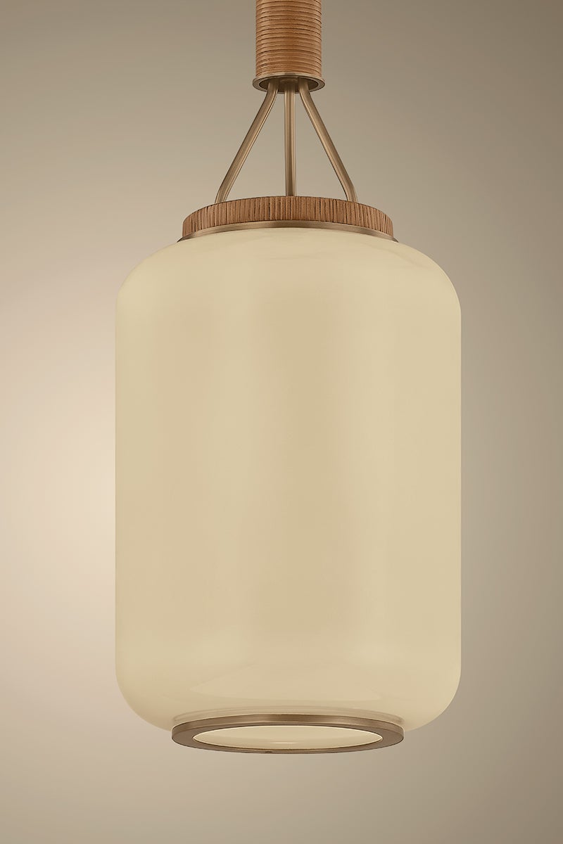 Drawing inspiration from a paper lantern, Judson reinterprets a familiar silhouette with elevated materials. The elongated cream opal glossy glass shade emits an atmospheric glow, while the wrapped rattan and Patina Brass accents introduce texture and warmth to the frame. Available in two sizes, Judson is the perfect balance of minimalism and soul.