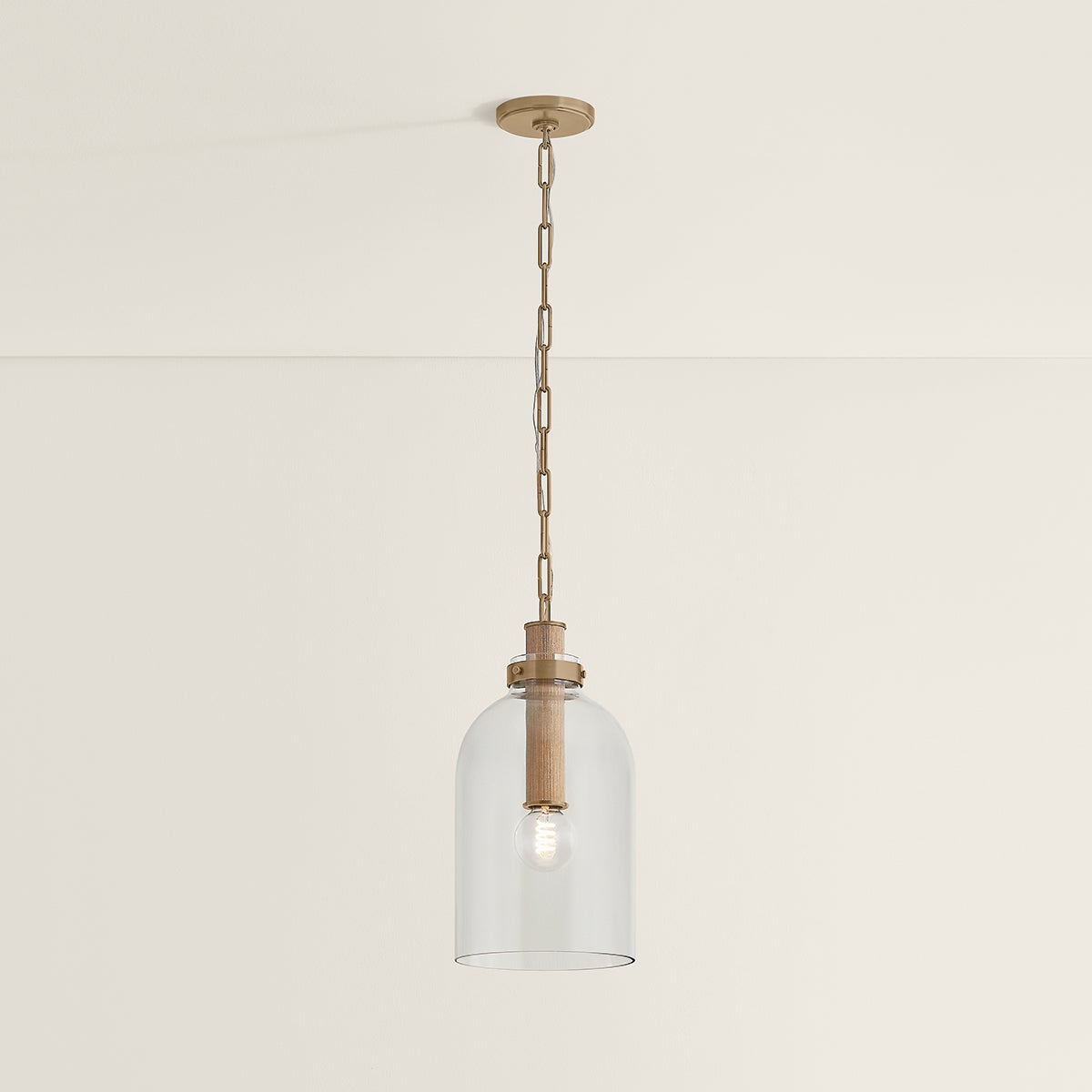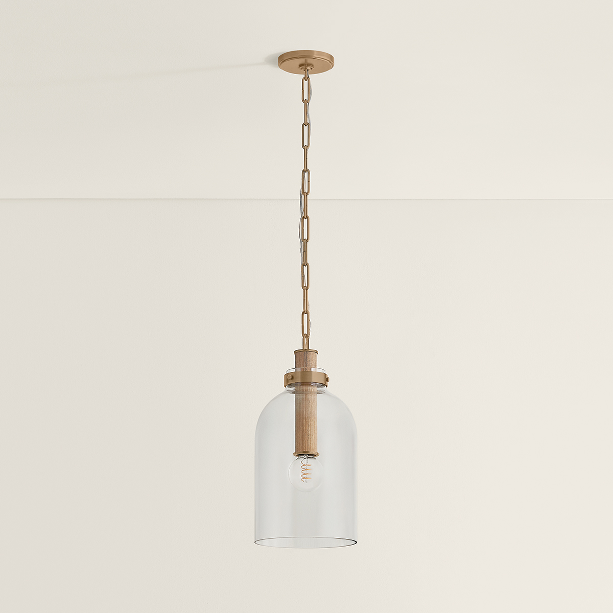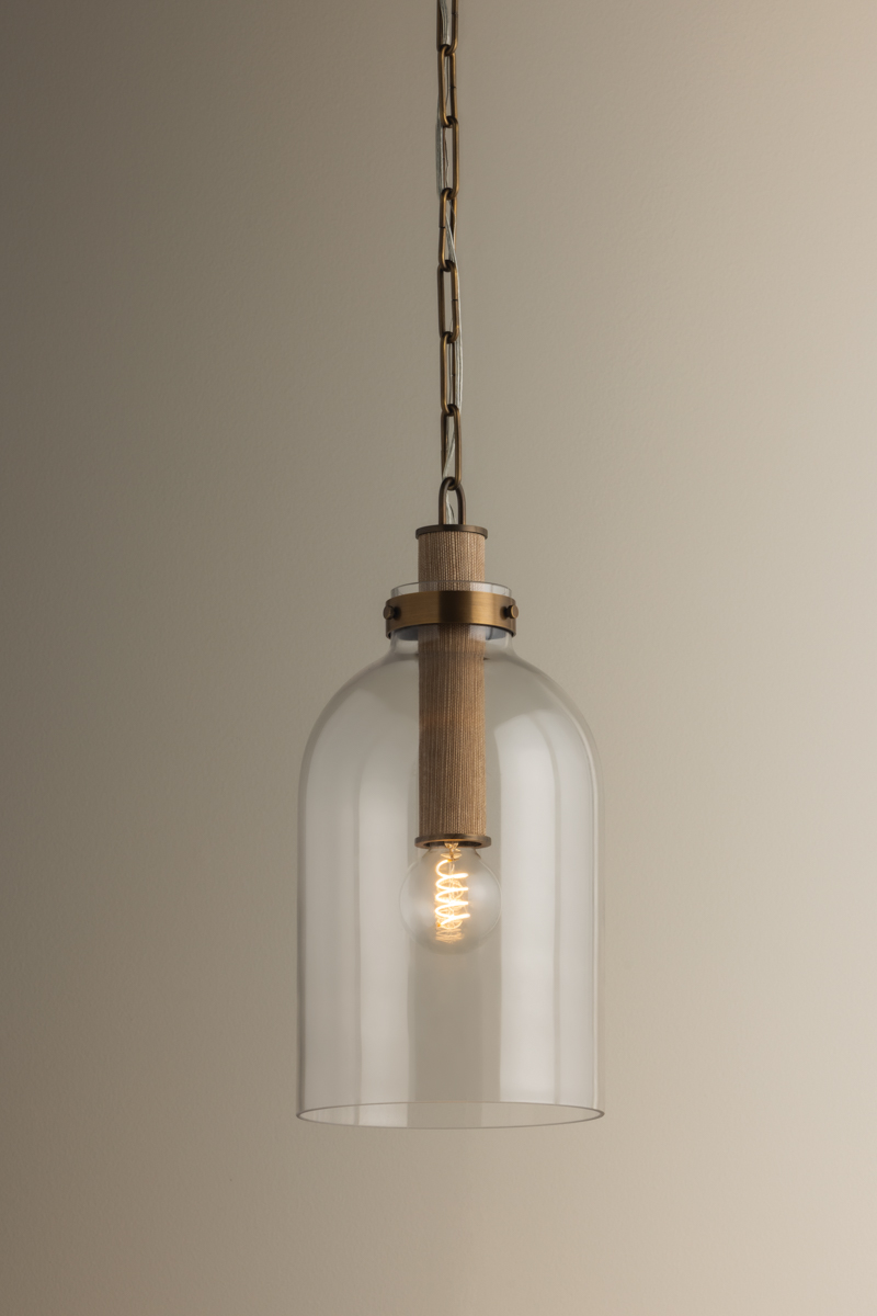 The Kori pendant follows the vein of Japanese modernism with a minimalist cloche-shaped glass design accented by elevated details. A grass cloth wrapped tube extends through the center of the clear glass shade, adding textural interest. Finished in Patina Brass, the thick metal hardware introduces an industrial edge. Despite its distinctive features, Kori’s simplicity of form allows it to be hung in multiples across various spaces. Available in two sizes.