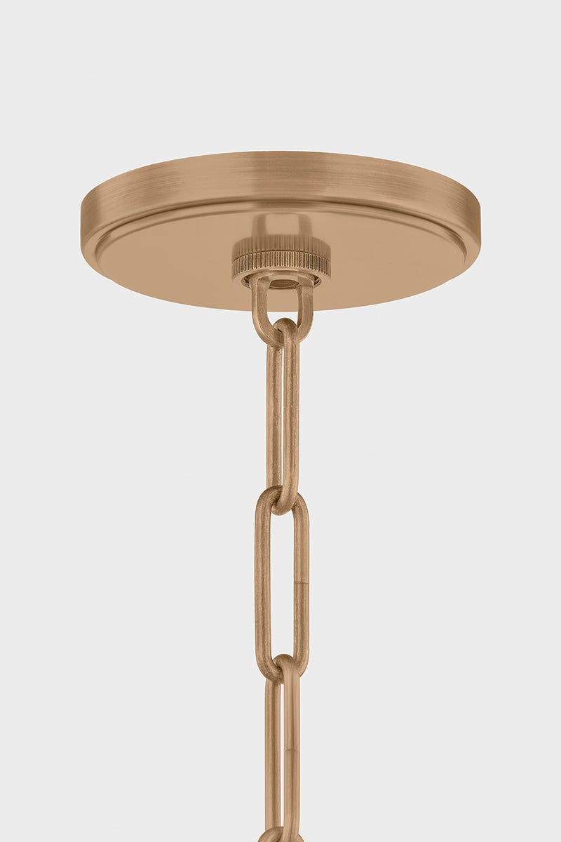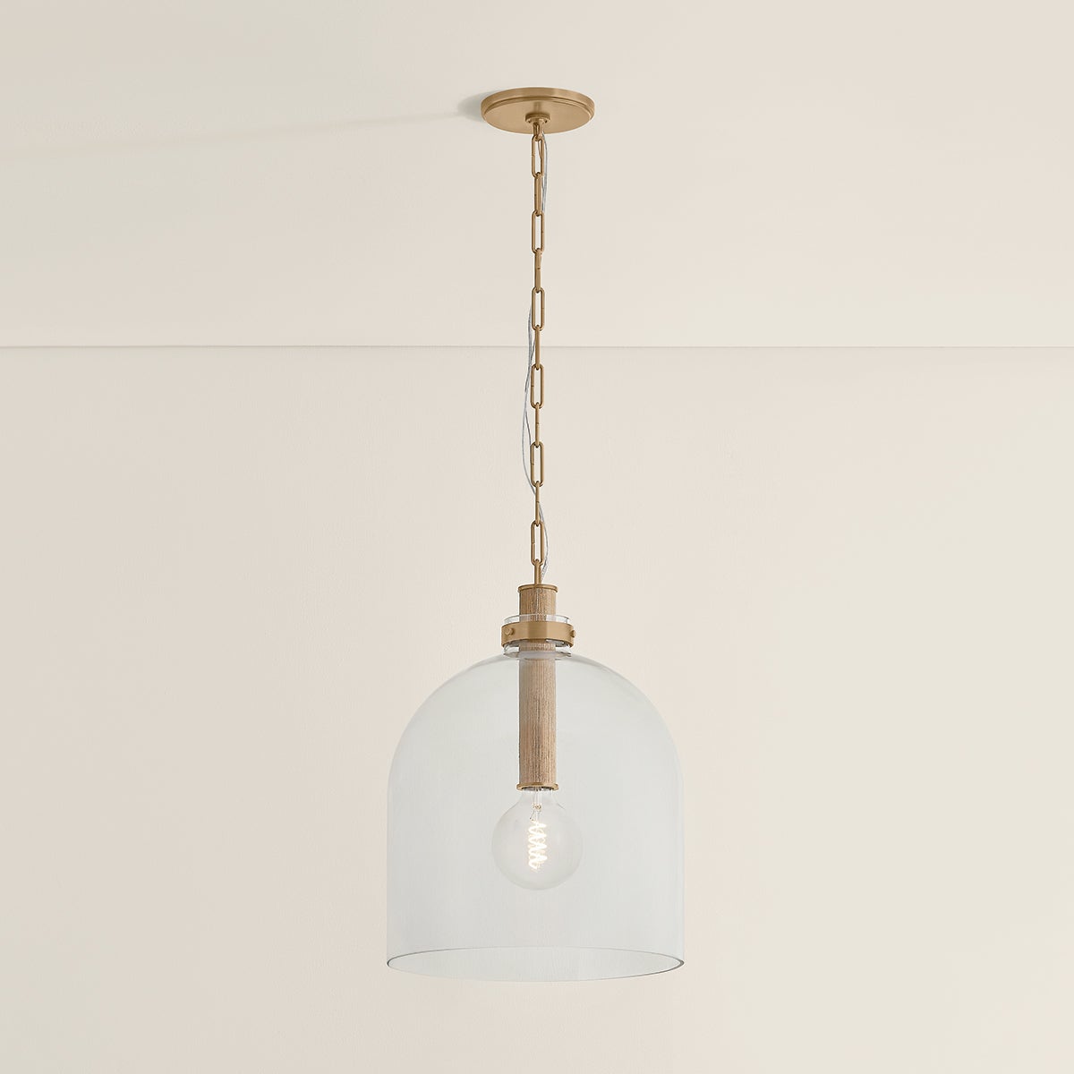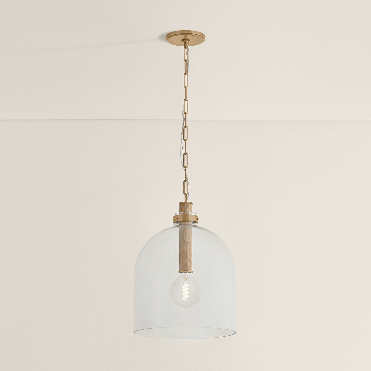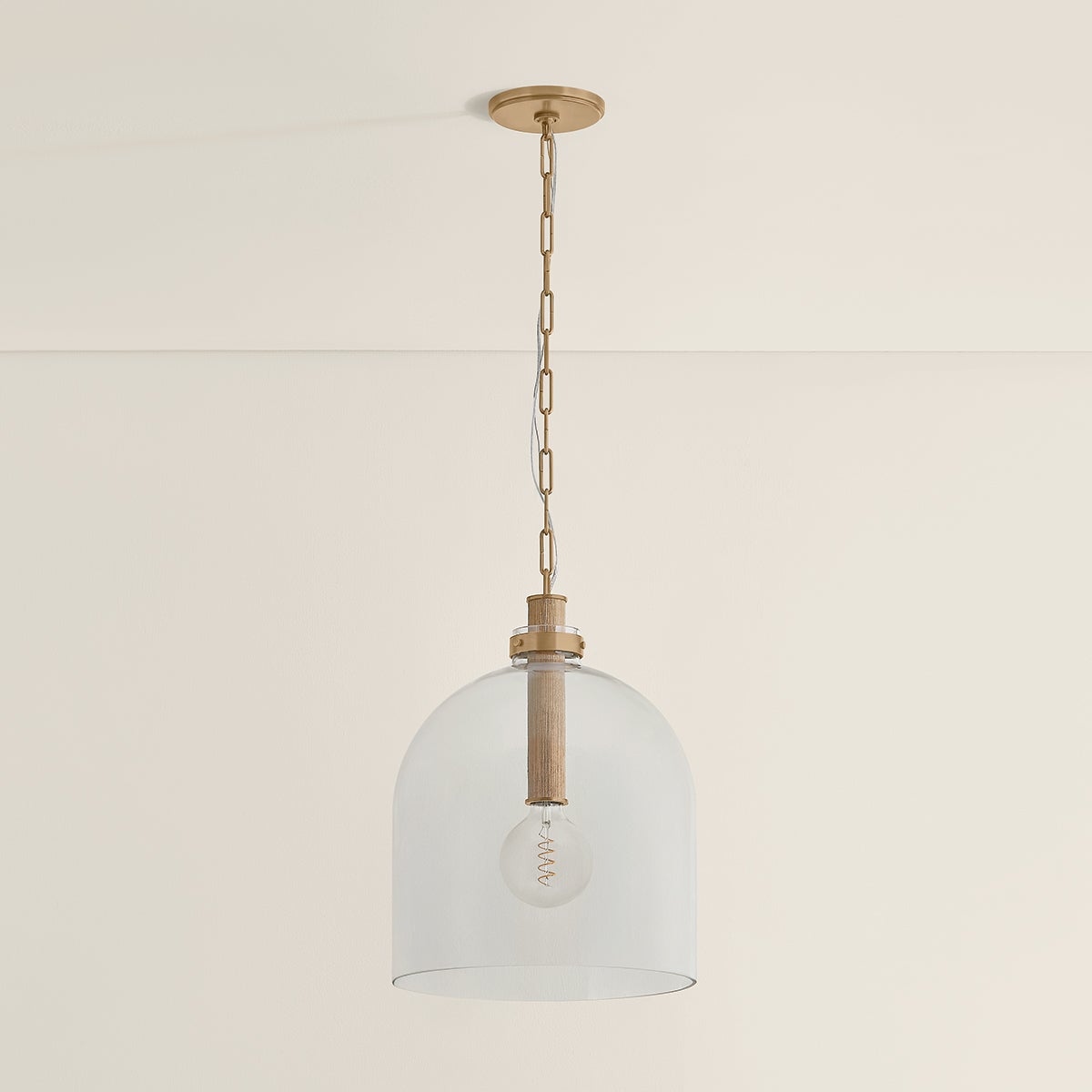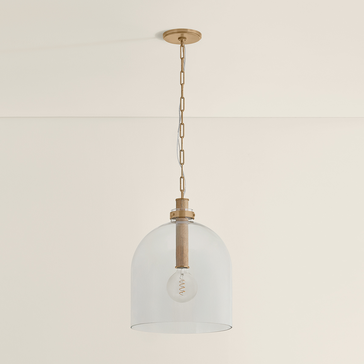 The Kori pendant follows the vein of Japanese modernism with a minimalist cloche-shaped glass design accented by elevated details. A grass cloth wrapped tube extends through the center of the clear glass shade, adding textural interest. Finished in Patina Brass, the thick metal hardware introduces an industrial edge. Despite its distinctive features, Kori’s simplicity of form allows it to be hung in multiples across various spaces. Available in two sizes.