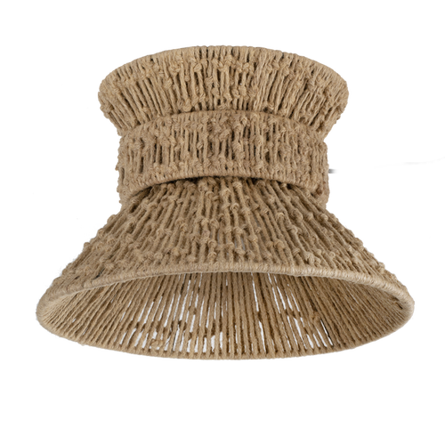 Crafted with a hand-knotted jute string technique, the designs of the Raphael family are like artful ornaments. Each fixture has a central cuff that cinches the conical shades, giving them their distinctive shapes. A hidden bulb radiates light through the gaps in the weave, creating a warm and welcoming glow. For added cohesion, the pendants feature a decorative string-wrapped loop that connects to a Patina Brass chain.