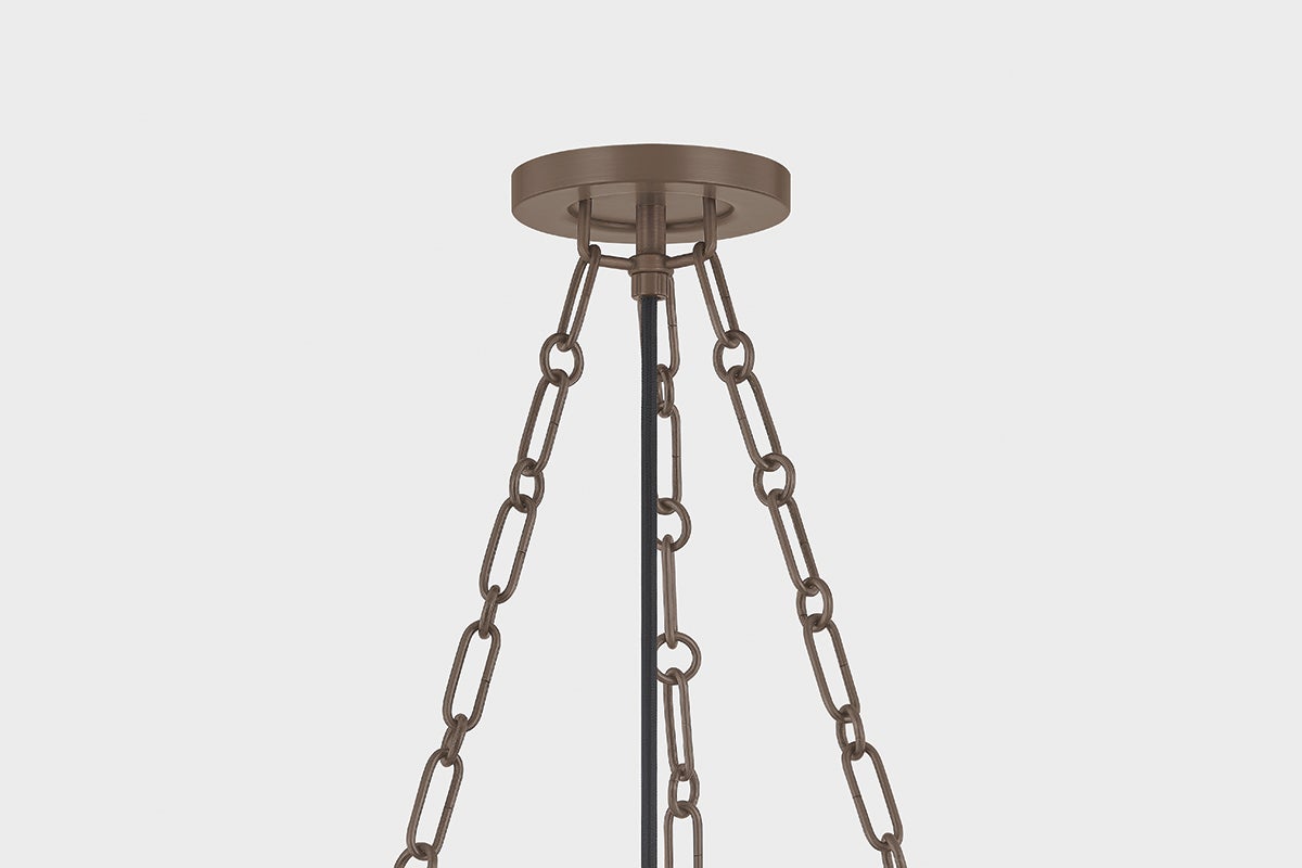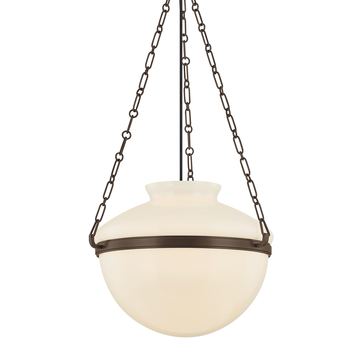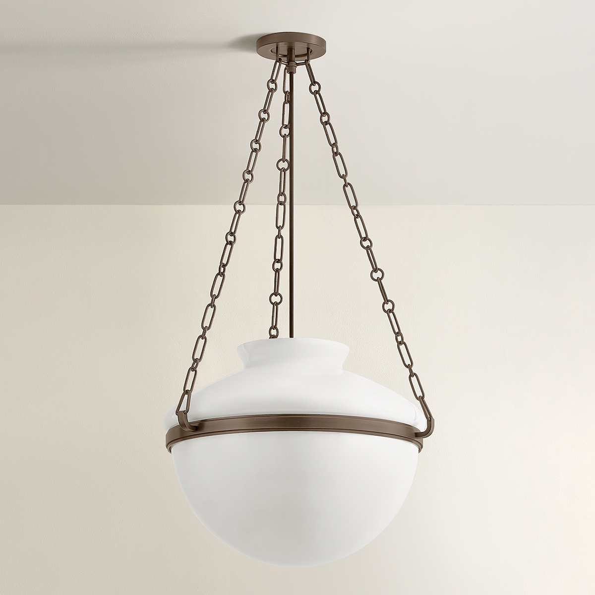 With a silhouette that nods to the past, Paradigm reimagines the classic lantern with bold, generous proportions and a contemporary sensibility. A large student-style opal shiny glass shade hangs from a trio of chunky chains, finished in either polished Patina Brass or an understated Bronze finish. Available in two sizes, Paradigm blends heritage and modernity into a sculptural overhead statement.
