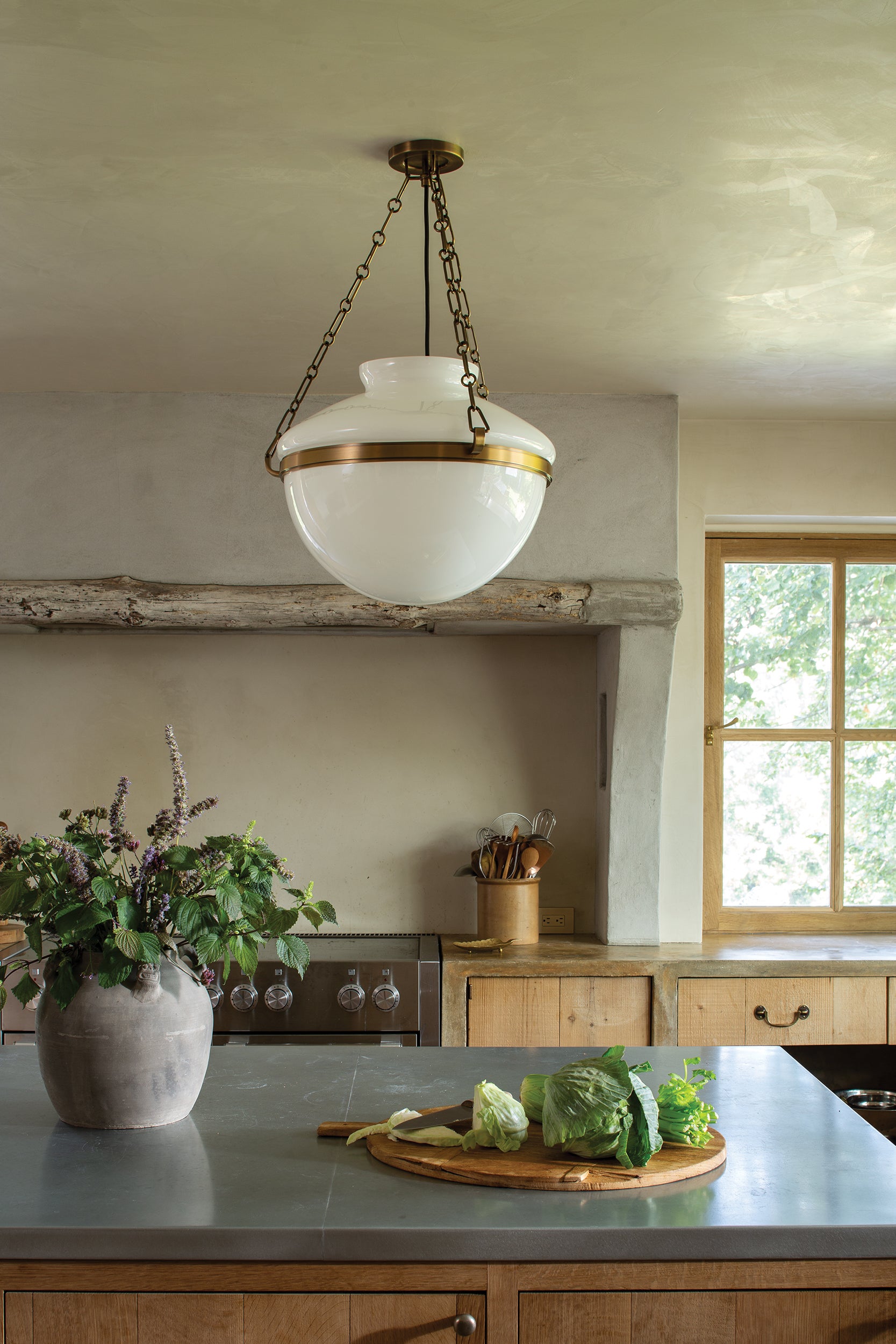 With a silhouette that nods to the past, Paradigm reimagines the classic lantern with bold, generous proportions and a contemporary sensibility. A large student-style opal shiny glass shade hangs from a trio of chunky chains, finished in either polished Patina Brass or an understated Bronze finish. Available in two sizes, Paradigm blends heritage and modernity into a sculptural overhead statement.
