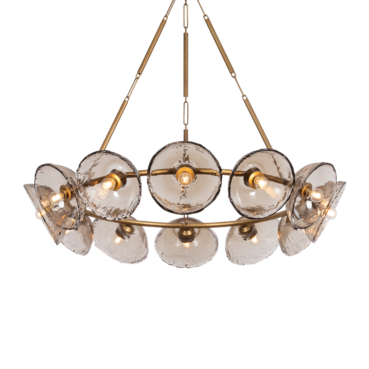 A modernist twist on a ring chandelier, Diego focuses on the beauty of artisanal glasswork. The composition features a concentric array of light bronze piastre glass shades around a Patina Gold Leaf frame. Each dish-shaped shade forms a halo around a purposely petite exposed bulb. Available with 9 or 12 lights, Diego’s industrial-meets-ethereal nature creates an eye-catching lighting moment.
