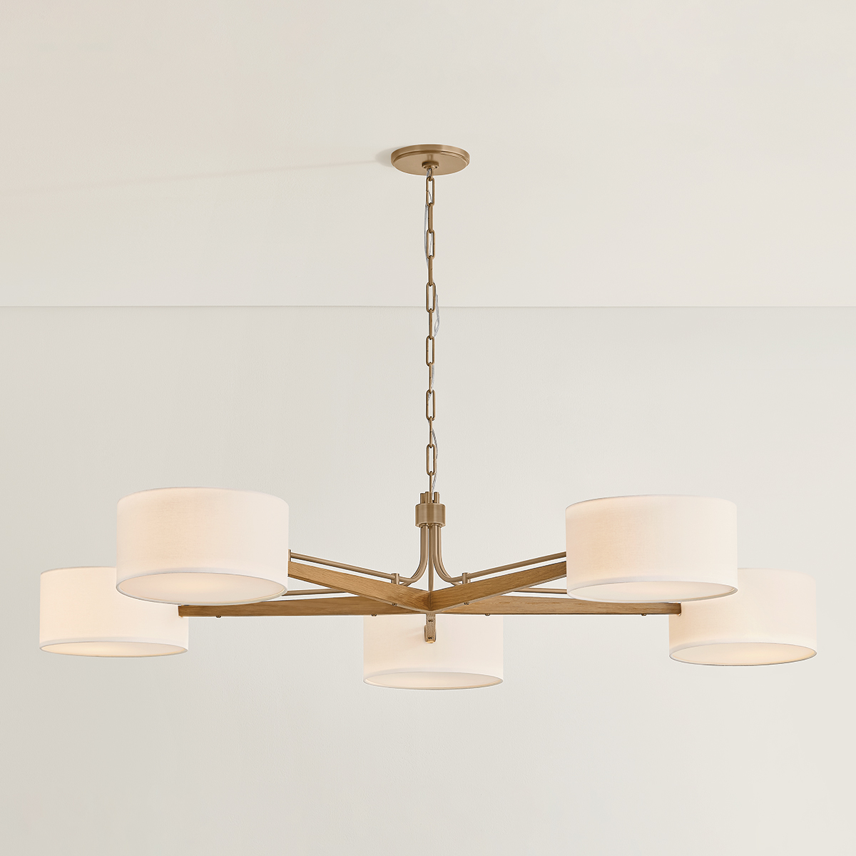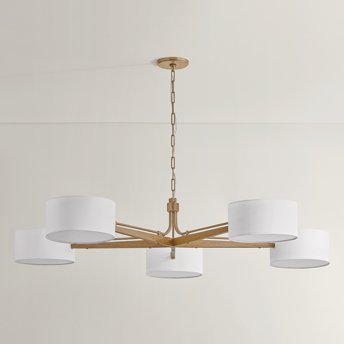 Inspired by vintage furniture, the Mailo family’s complex woodworking techniques and exposed hardware elements put its construction at the center of the design. The white oak frame of each piece is complemented by Patina Brass accents and a matching cord that runs parallel to the arm. In its 1-light sconce format, Mailo swings from the backplate, making it an ideal bedside light that can be easily adjusted. The 3 and 5-light chandeliers feature sleek wooden arms, joined at mitered corners beneath the fixture to create a seamless look. The white linen shades add a finishing note of freshness to this modern family.