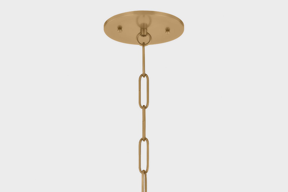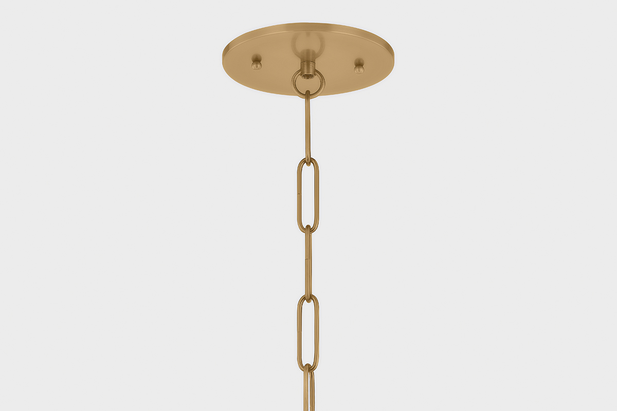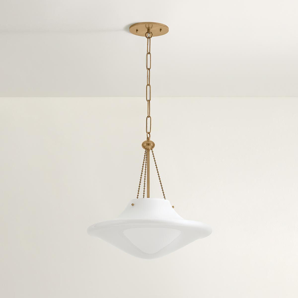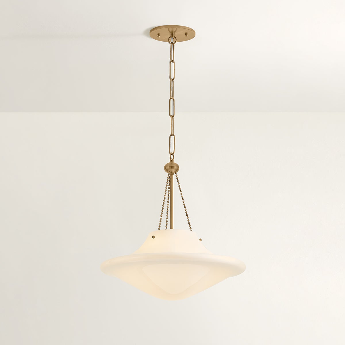 An ethereal pendant-lantern hybrid, Era combines a sleek opal glass shade with charming vintage details to create a soft yet striking focal point. The large shade emits a warm, ambient glow—ideal for gathering spaces like dining rooms and kitchens. Decorative rivets and a retro ball chain in Patina Brass add a touch of vintage glamour. Available in two sizes, Era brings timeless style with a hint of mid-century cool.