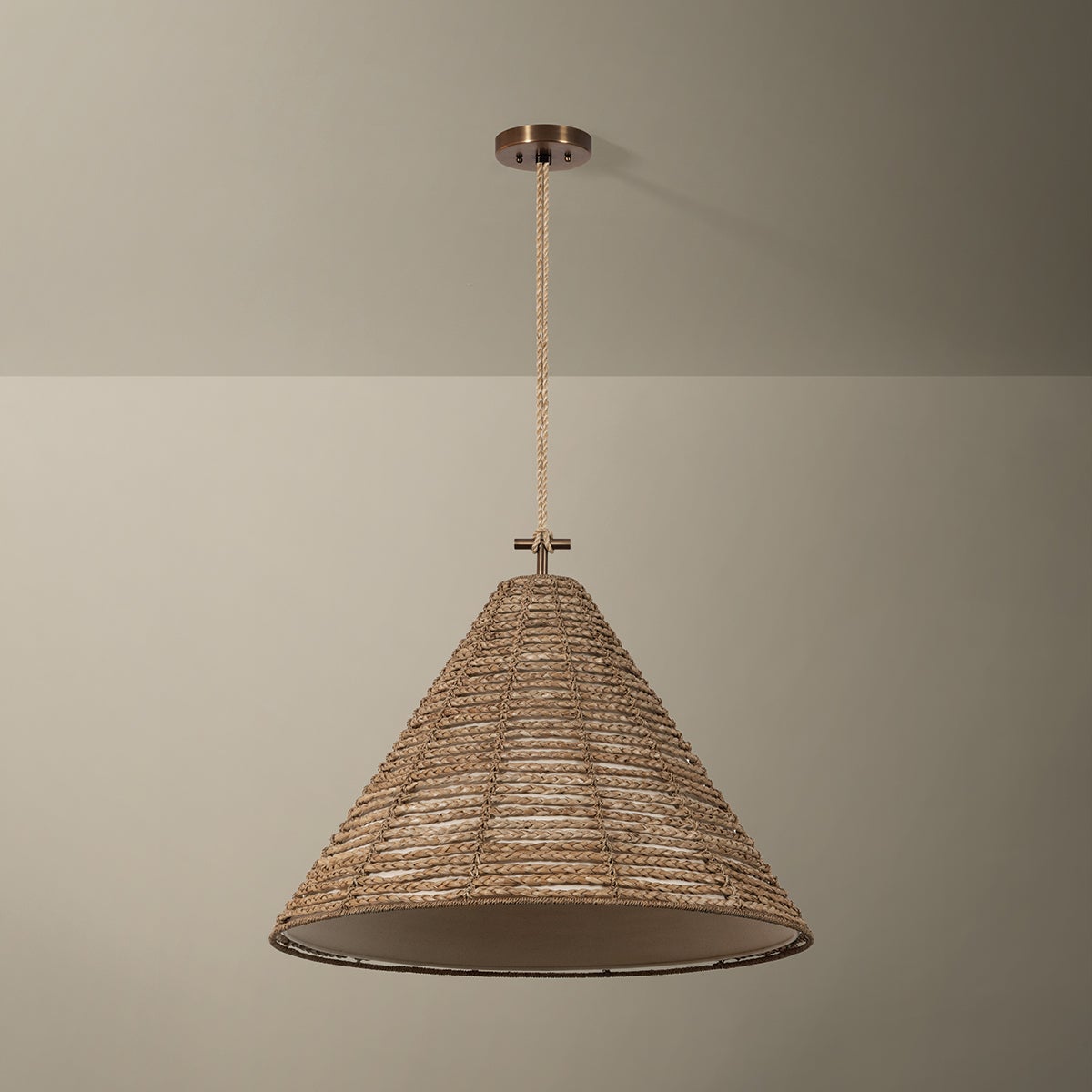 The Redwood family brings coastal ease to contemporary forms. A wheat linen shade is wrapped in abaca rope, diffusing light in warm, dimensional tones. In keeping with the nautical theme, the rope suspension terminates in a knot. The material’s elegant earthiness pairs with rich Patina Brass fittings. Available as a 1-light sconce and 1-light pendant in two sizes.