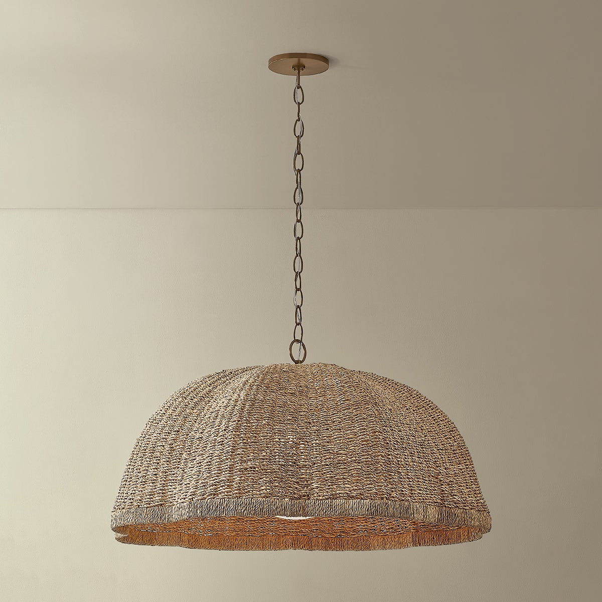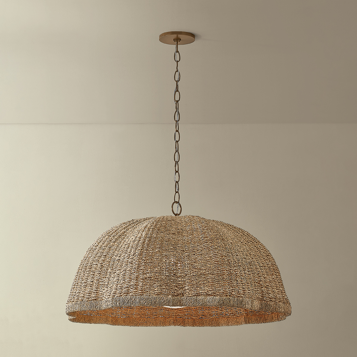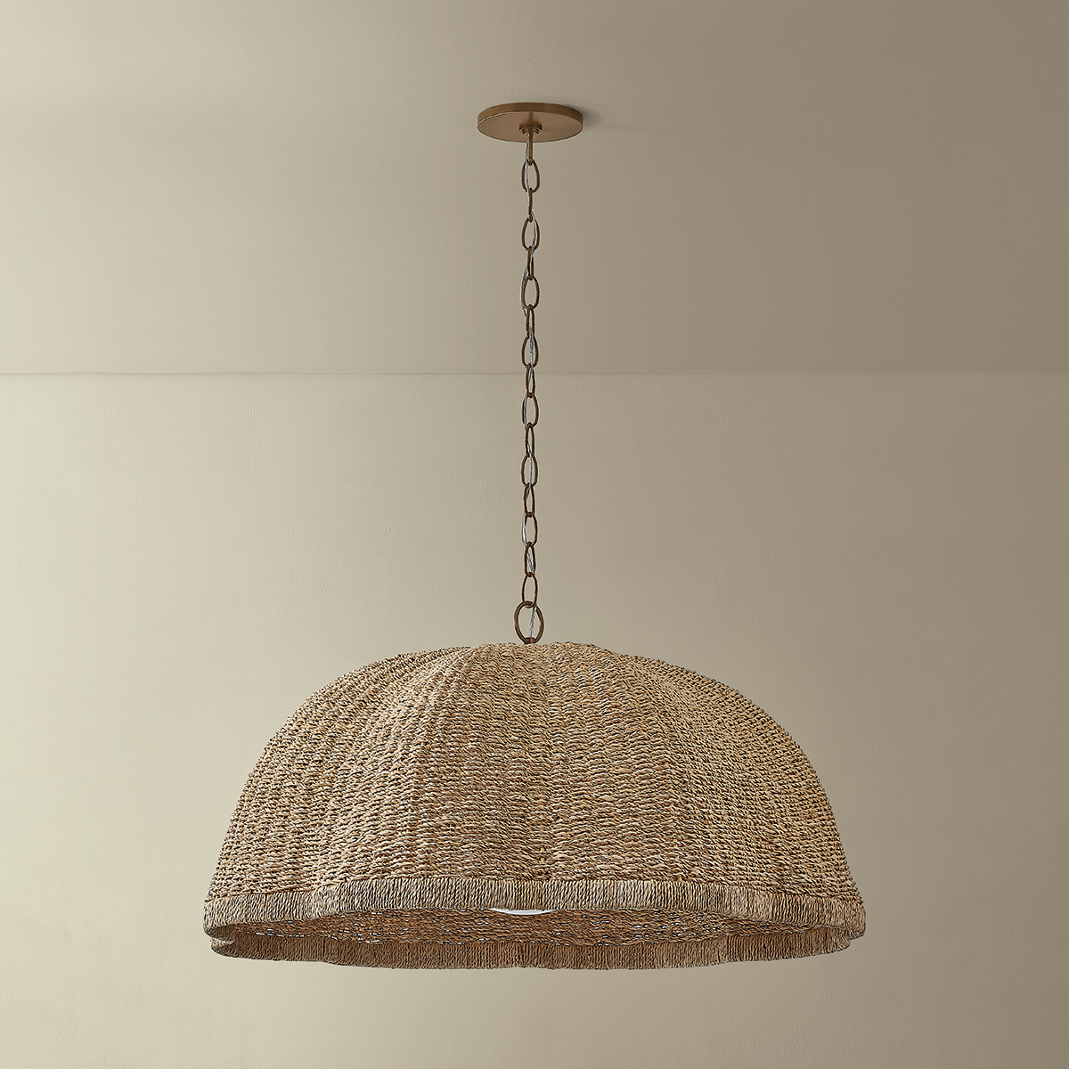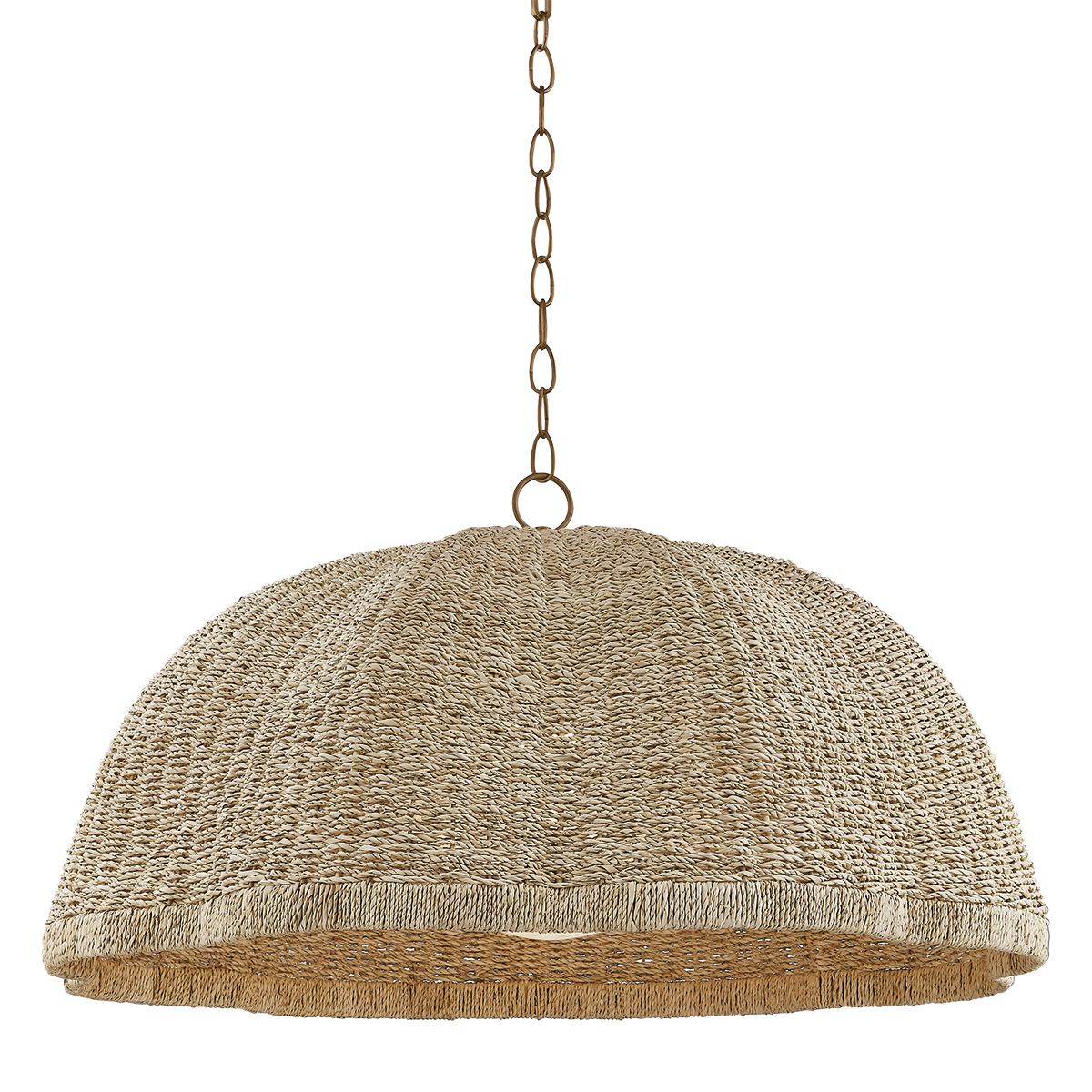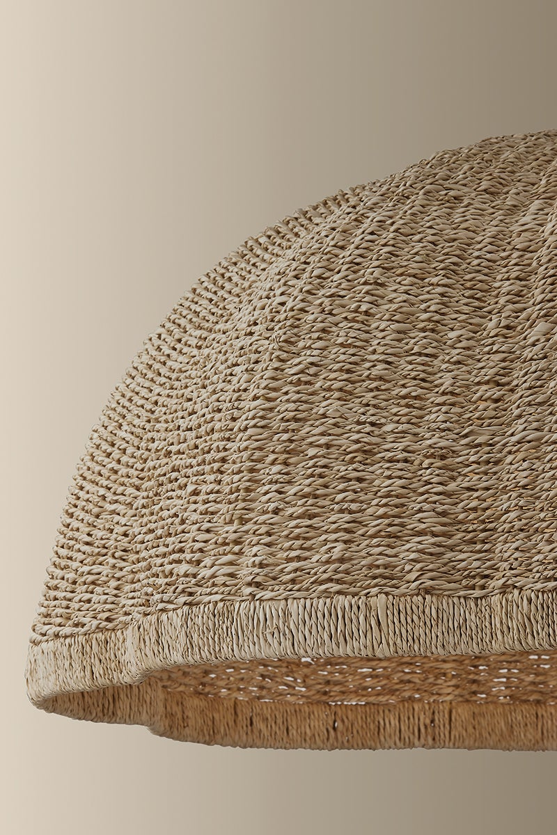 The lofty, vaguely botanical form of the Jack pendant plays with light through its textural shade. Woven from natural Banana Leaf Cord, the broadly scalloped shade features a distinctive vertical wrap at the edge. A clear cloud seedy glass globe rests within like a pearl. Suspended from a Patina Brass chain and available in two sizes, this pendant brings a chic, bohemian energy to a kitchen, dining, or living space.