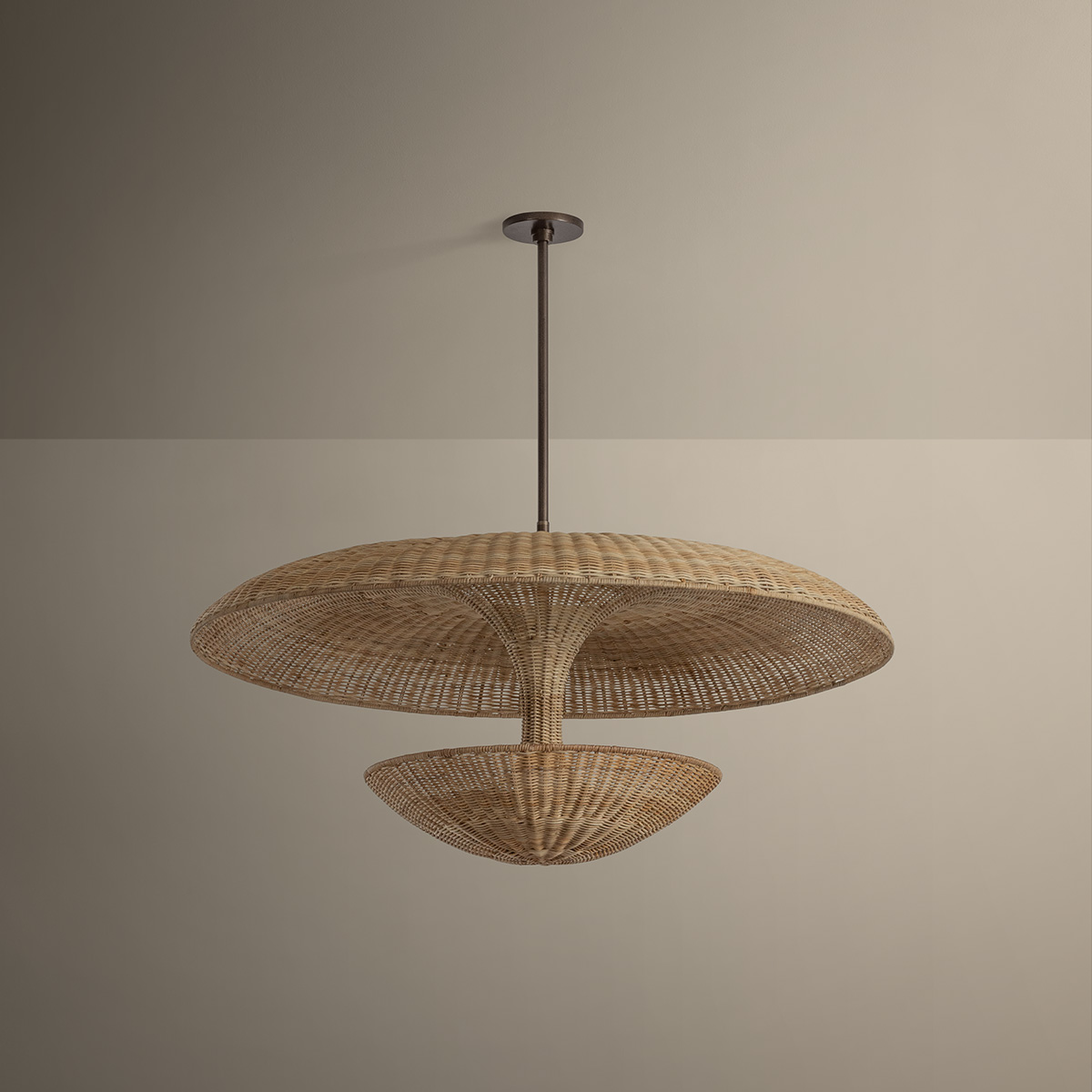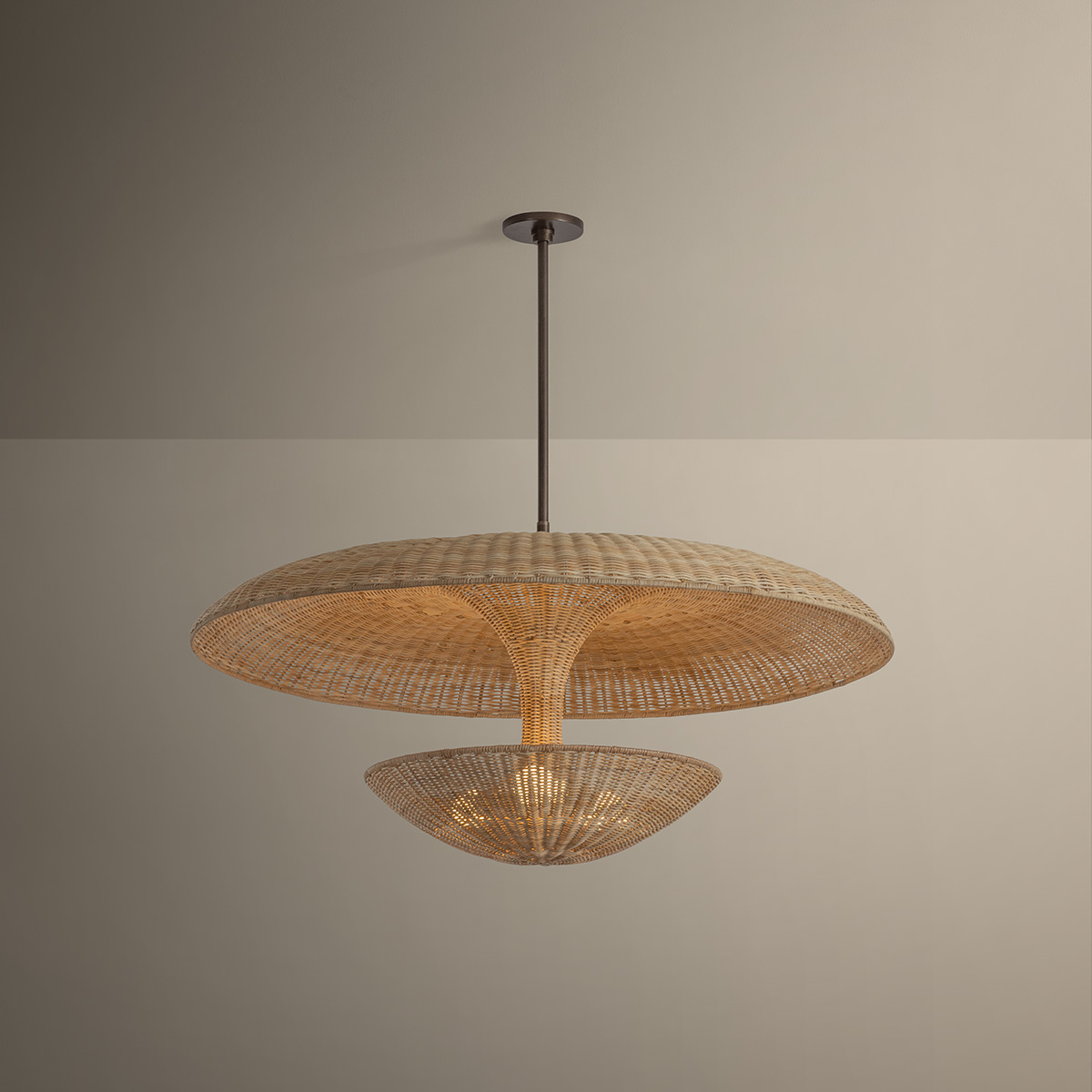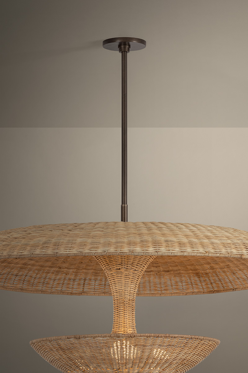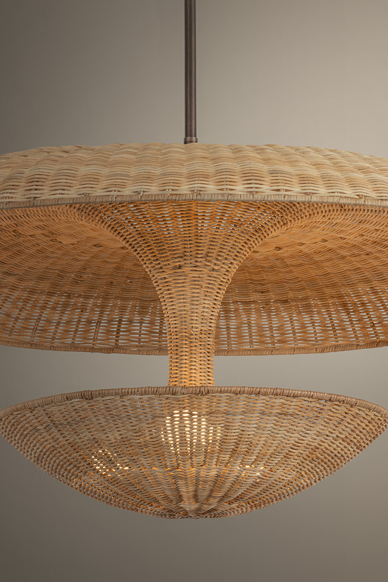 A force of nature, Draco blends mid-century style with artisanal craftsmanship. Supported by a Bronze Leaf stem, the silhouette is based on a classic 1960s reflector form with a handwoven twist. The natural openness of the light natural wicker weave allows light to filter through all sides of the fixture. Available as a 3-light semi-flush or 3-light pendant in two sizes, Draco makes for an impressive focal point.
