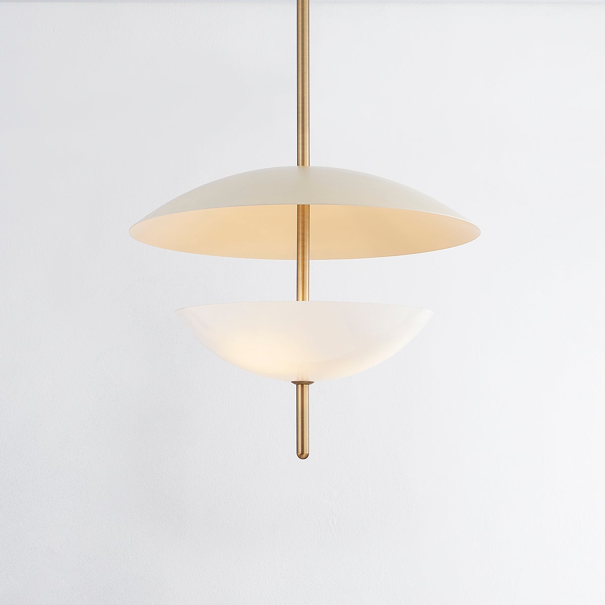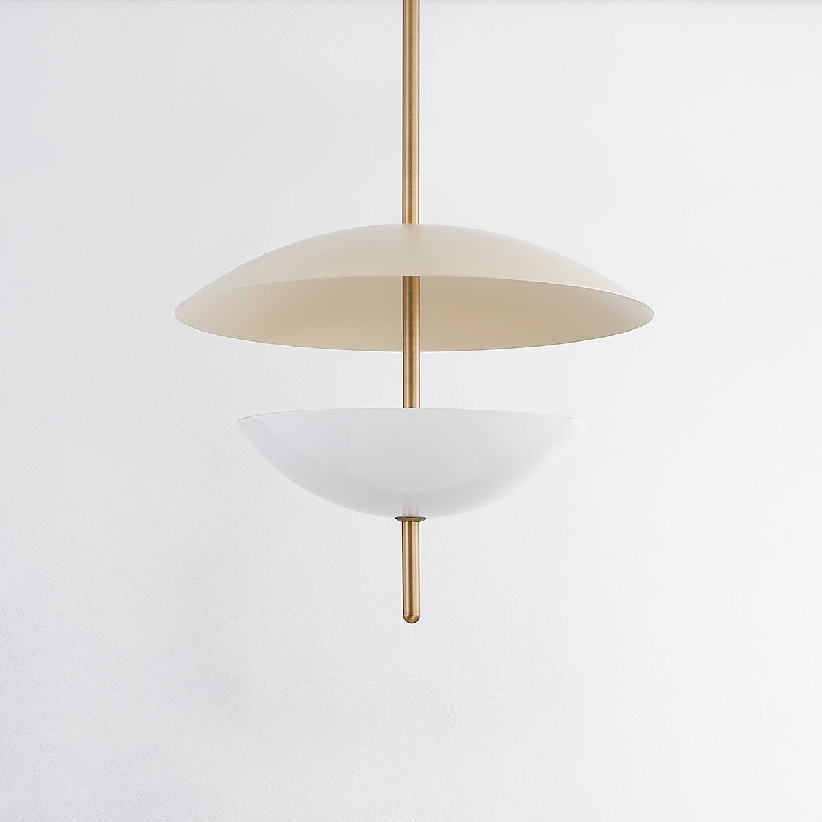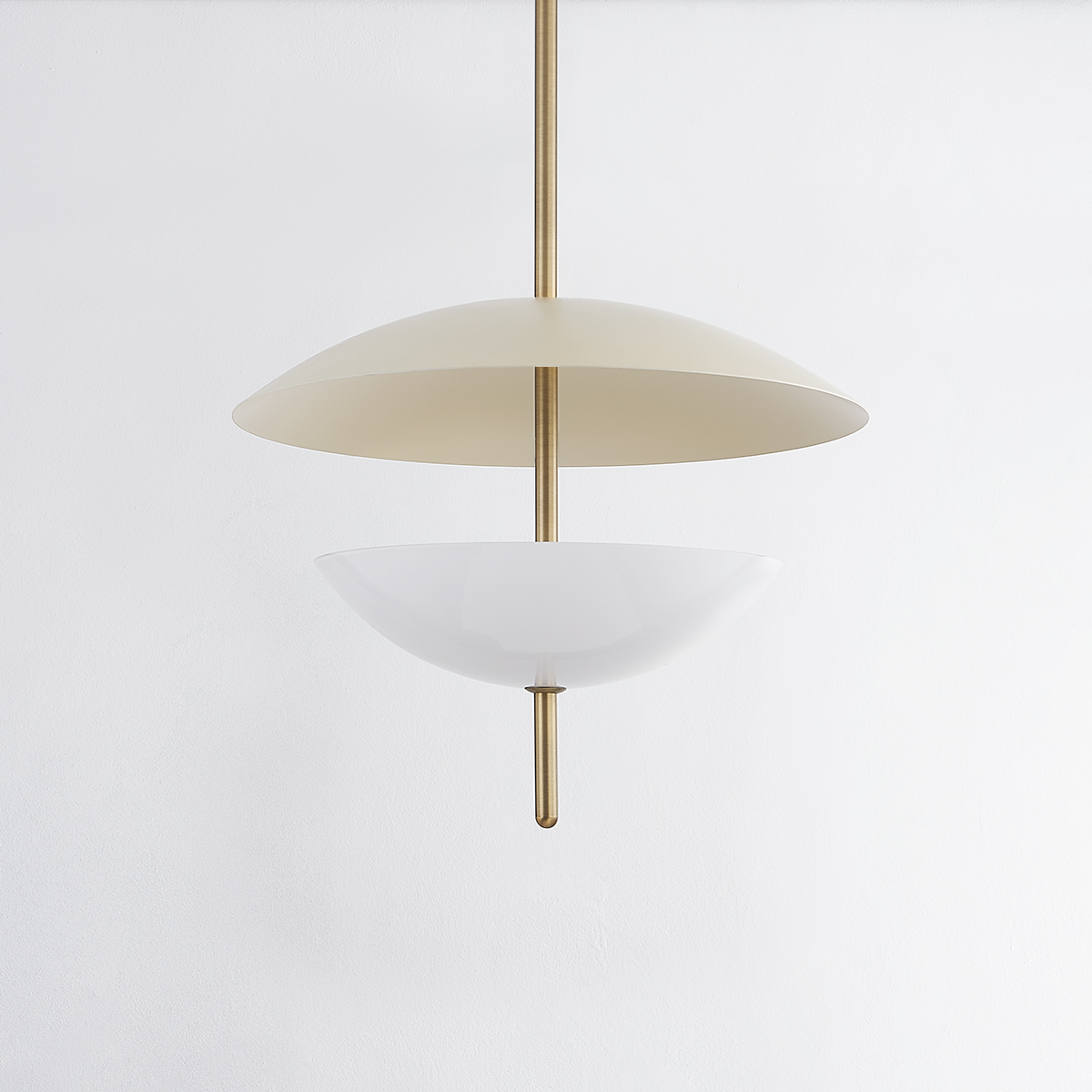 Dion captures modern organic design with its round, slender Patina Brass rod that pierces through a pair of domed shades in warm, neutral tones. The opal glossy glass shade below fills with a soft glow and casts an uplight that reflects off of the larger Soft Sand dish above. This pretty pendant defines subtle sophistication.