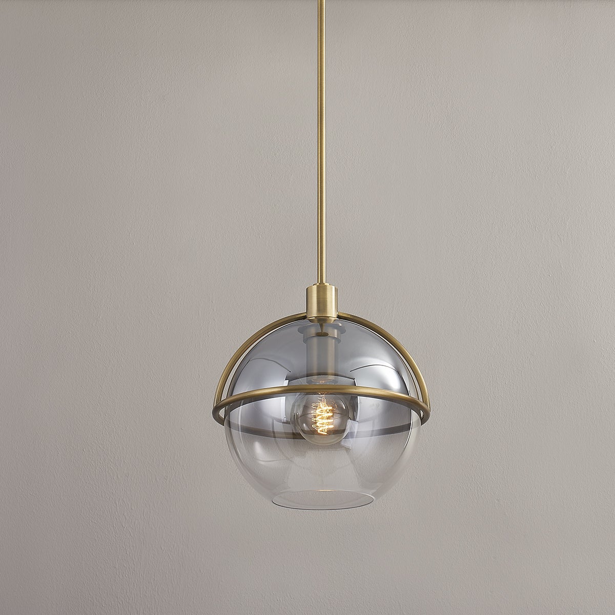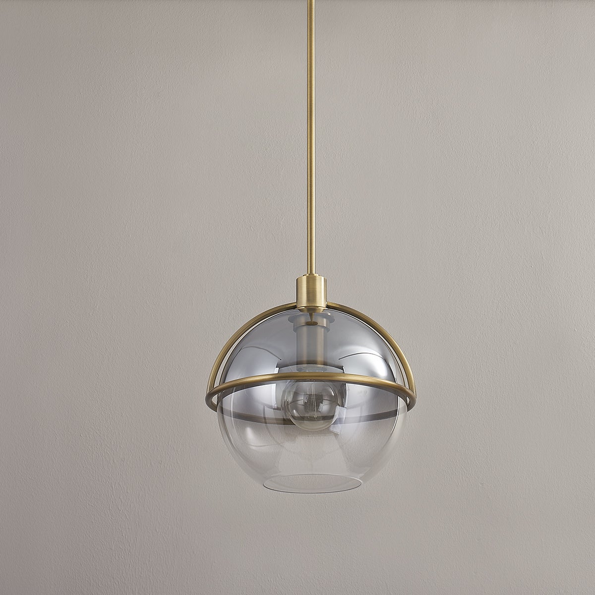 A smoked plated glass globe is suspended in a Patina Brass frame, taking a familiar pendant silhouette to the next level. The glass has a stunning, almost two-tone appearance when lit and contrasts beautifully with the brass finish for a luxurious, refined look that is extremely usable. Hang in multiples or alone in smaller spaces—two different sizes suit a variety of locations.