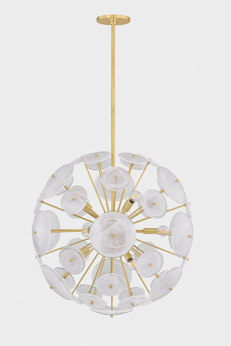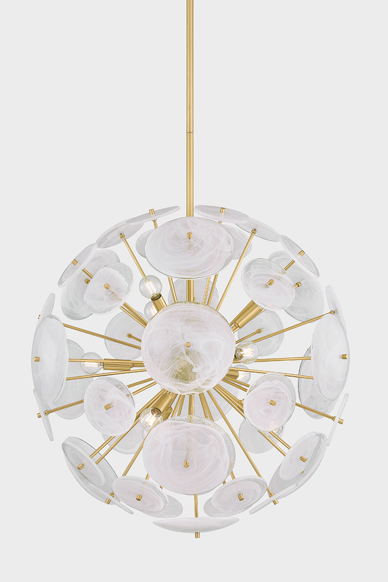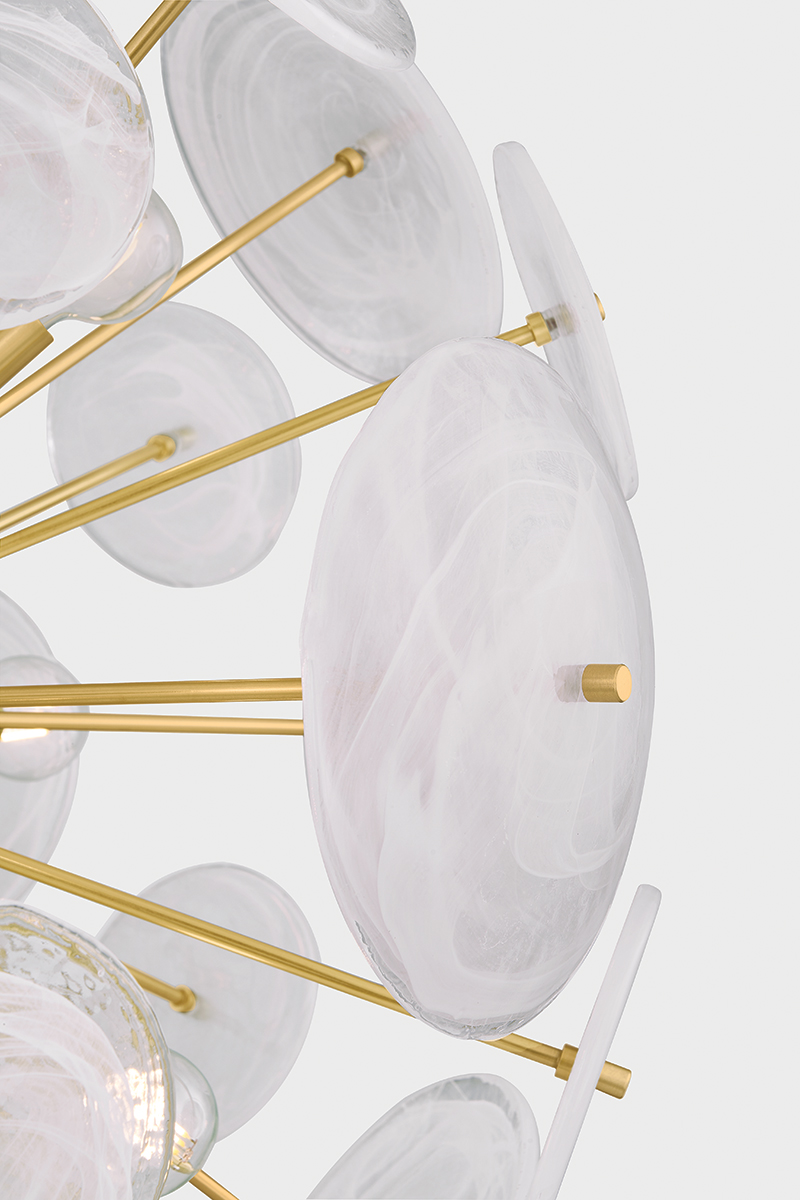Harmonizing linear and organic shapes, the Tamara chandelier provides an artful update to a mid-century sputnik design. Cast from Remolino Blanco glass, the discs feature milky white swirls that gently diffuse light. Slender Aged Brass stems support the composition, providing a counterpoint to the softness of the rounded glass forms. Available with 6 or 9 lights, Tamara is a luminous conversation piece in a living or dining space.