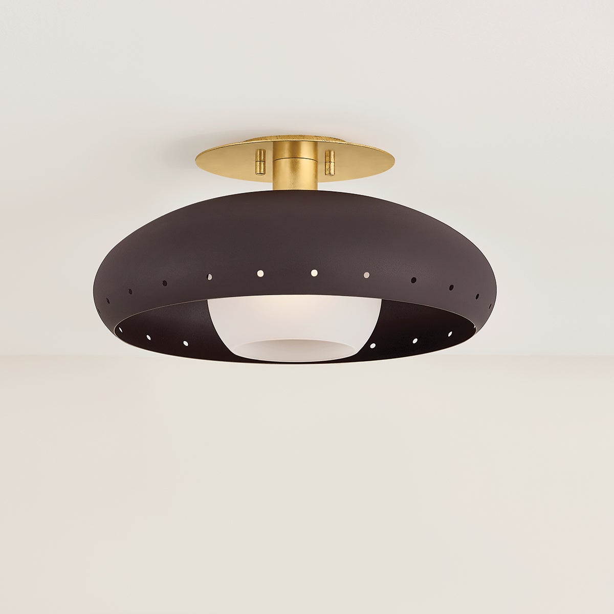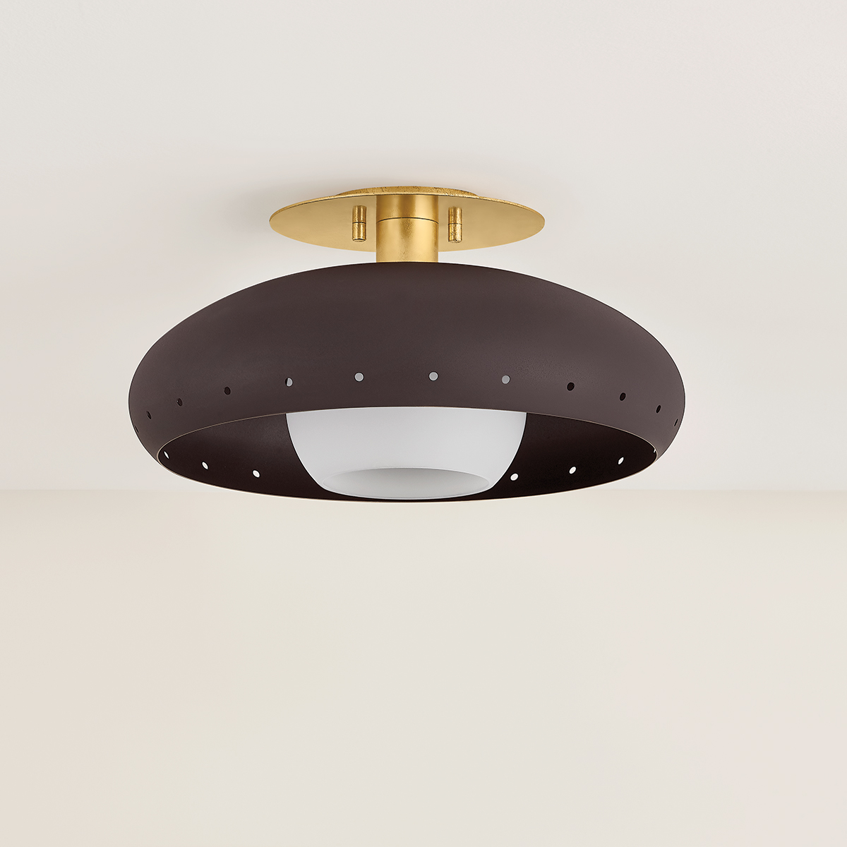The minimalist, adaptable design of the Kimber flush mount demonstrates refined restraint with simple style details. At the edges of the domed bronze shade, decorative perforations create a sparkle of light around the piece. The canopy and interior of the shade are finished in Vintage Gold Leaf, adding warmth and a luxe quality to the fixture.
