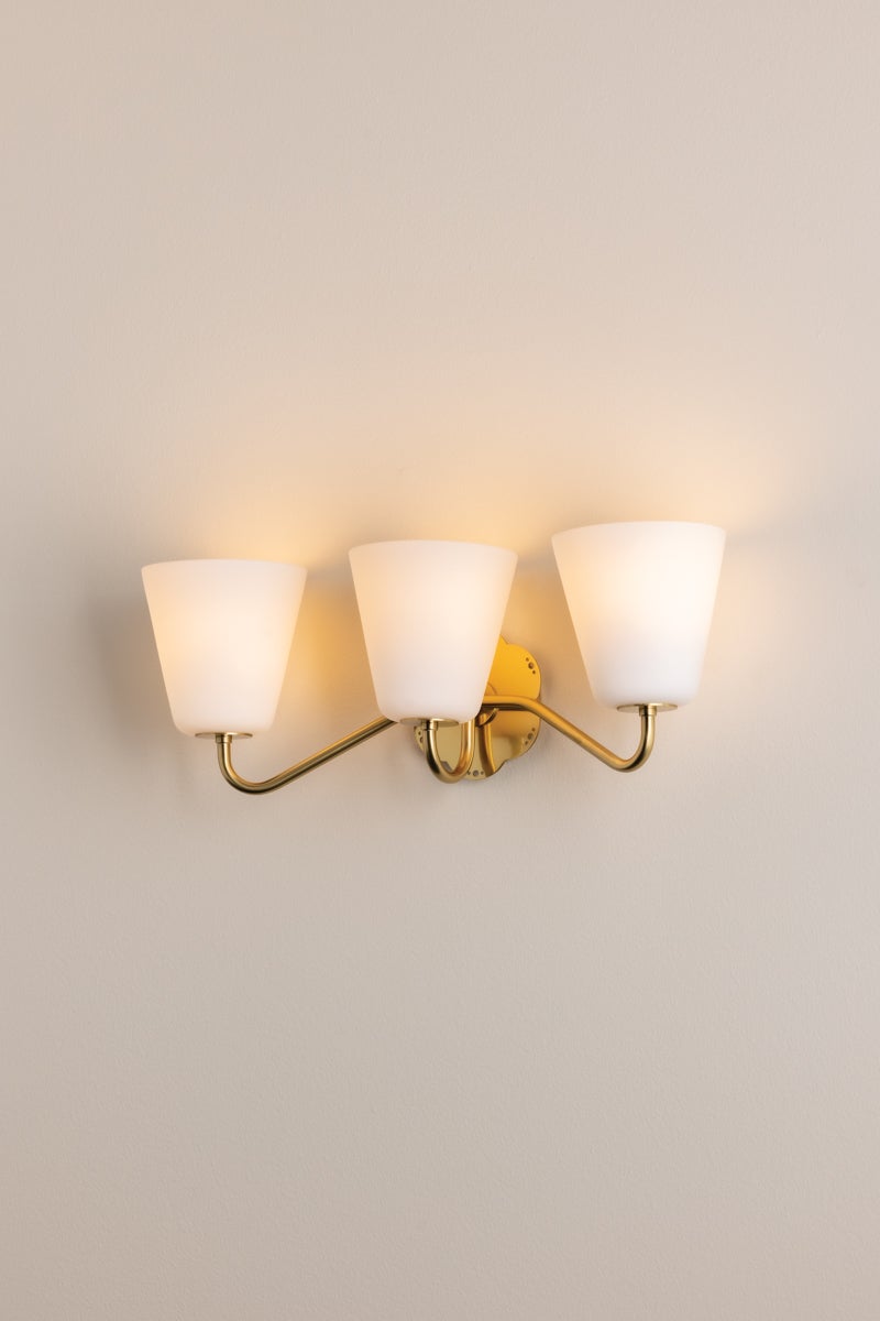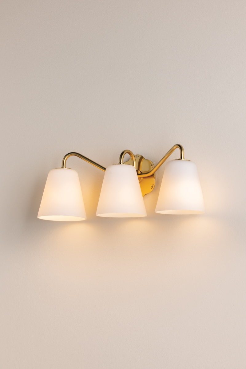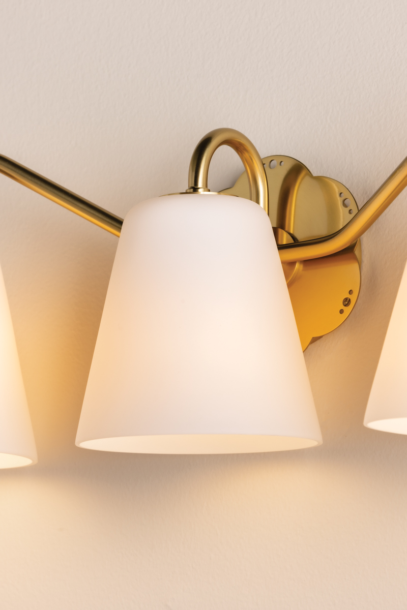 Designed specifically as bath lighting, the Leonella sconce uses a vintage-inspired botanical motif to make a subtle statement. Swooping arms in Aged Brass or Polished Nickel extend from the floral-shaped backplate, which features decorative perforations for added interest. Resembling snowdrops, the matte white bell-shaped shades provide a powerful downlight. Leonella is available with 1, 2, or 3 lights to illuminate daily routines.