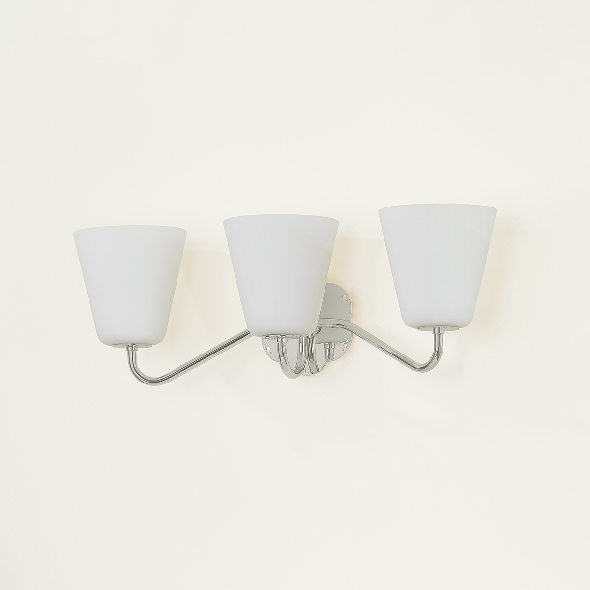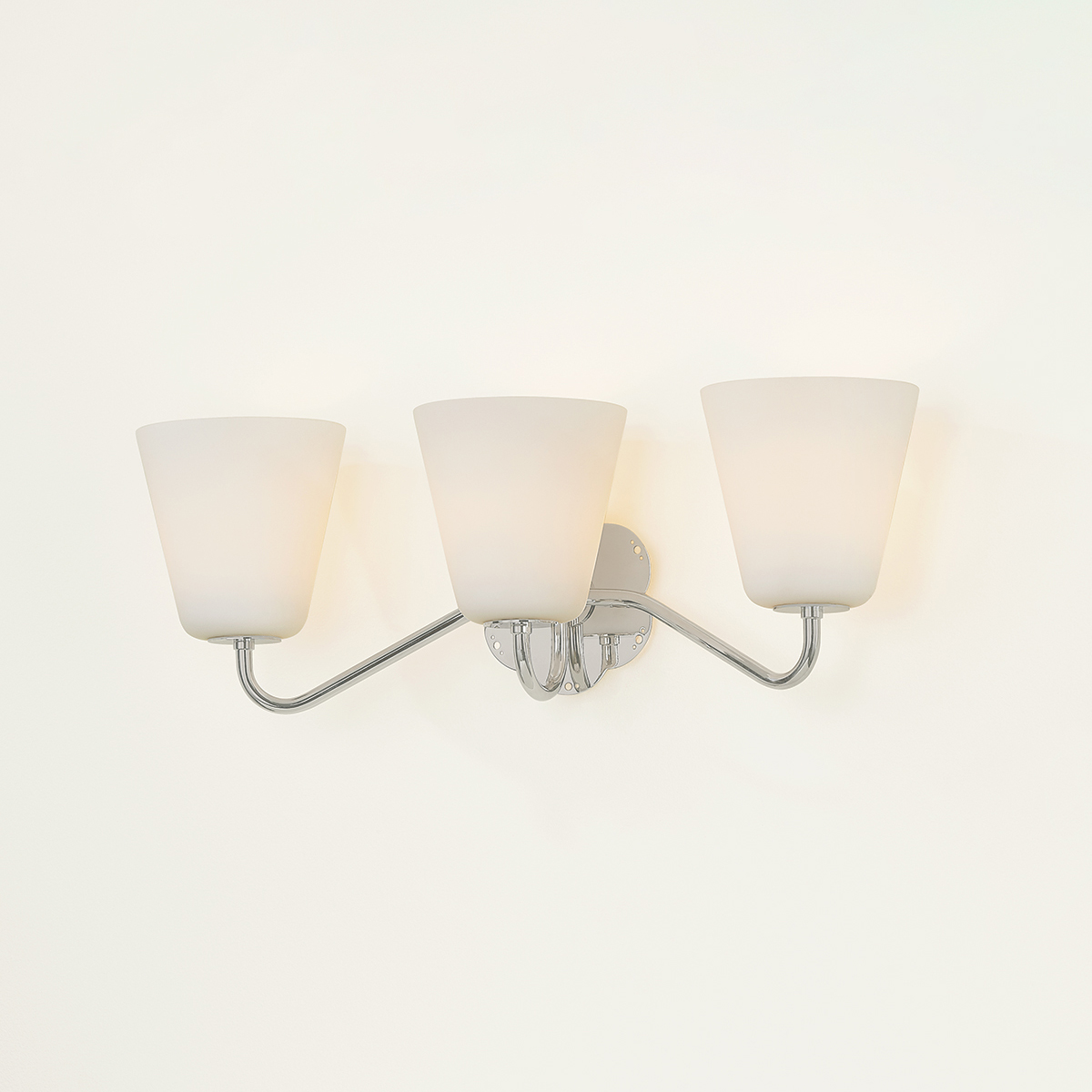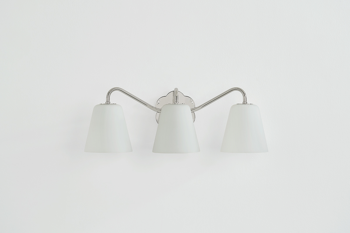 Designed specifically as bath lighting, the Leonella sconce uses a vintage-inspired botanical motif to make a subtle statement. Swooping arms in Aged Brass or Polished Nickel extend from the floral-shaped backplate, which features decorative perforations for added interest. Resembling snowdrops, the matte white bell-shaped shades provide a powerful downlight. Leonella is available with 1, 2, or 3 lights to illuminate daily routines.