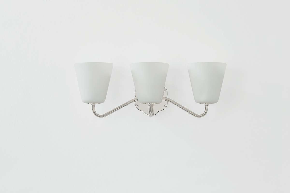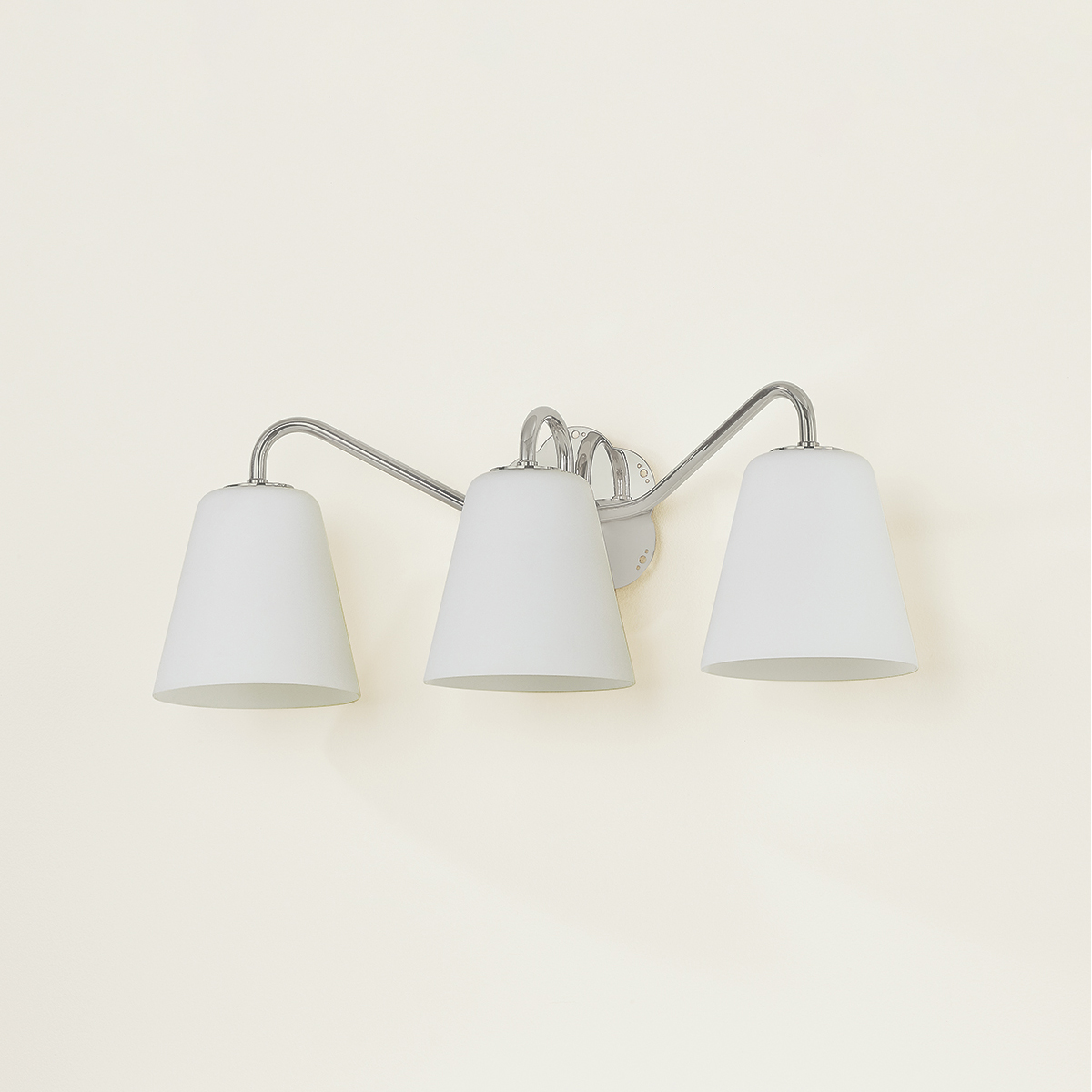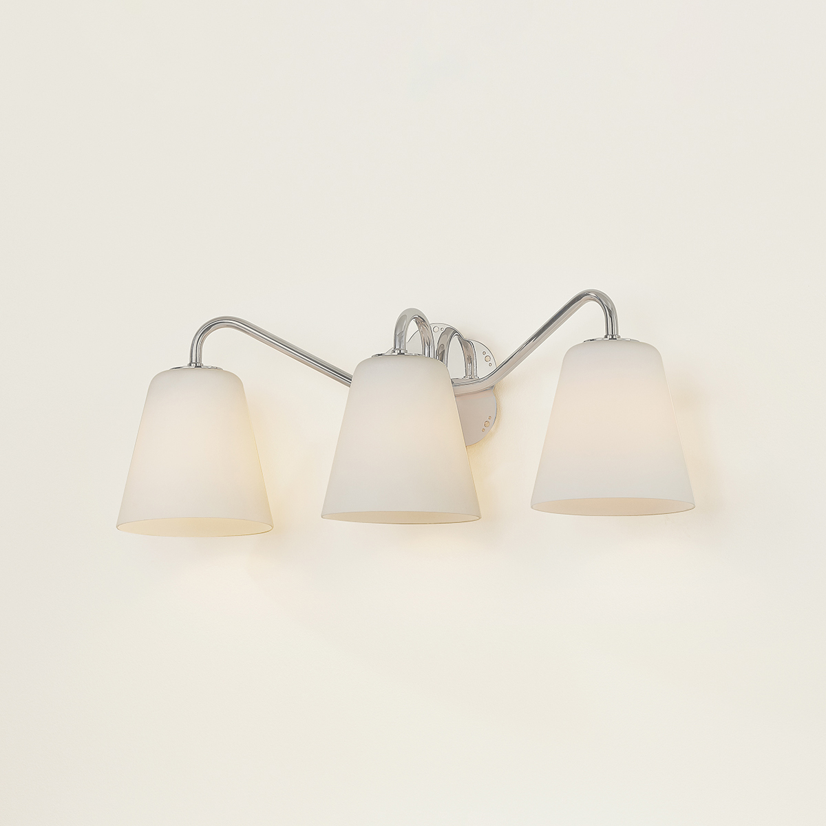 Designed specifically as bath lighting, the Leonella sconce uses a vintage-inspired botanical motif to make a subtle statement. Swooping arms in Aged Brass or Polished Nickel extend from the floral-shaped backplate, which features decorative perforations for added interest. Resembling snowdrops, the matte white bell-shaped shades provide a powerful downlight. Leonella is available with 1, 2, or 3 lights to illuminate daily routines.