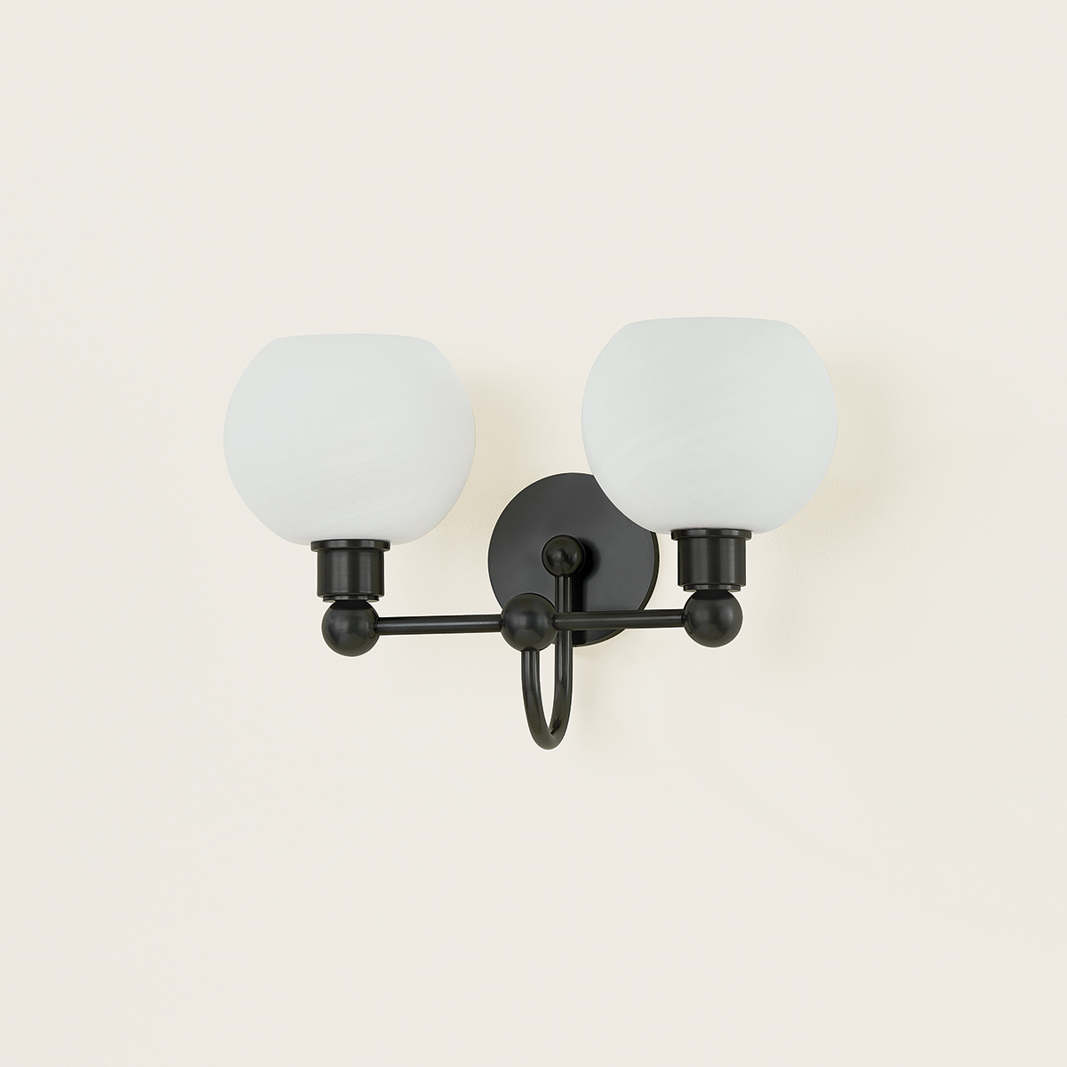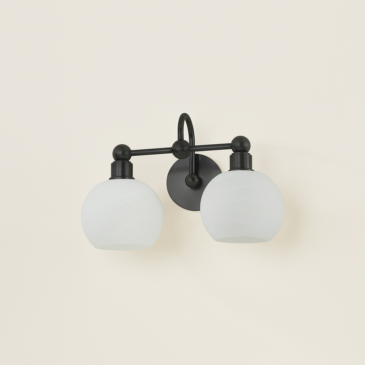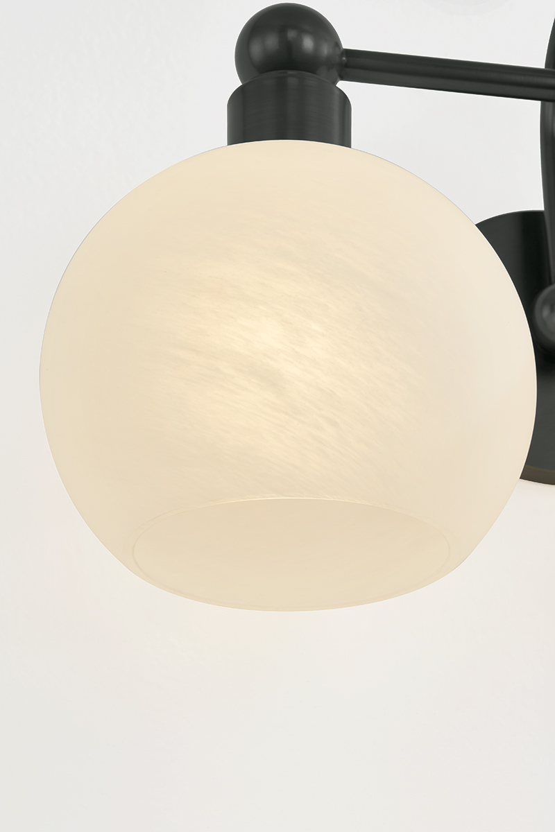 There’s a sense of visual ease in the continuity of circular forms in the Jerica bath light. The silhouette is understandable and usable, yet elevated by decorative sphere details, curved lines, and matte cloud glass globes. Choose from a gleaming Aged Brass finish, or opt for Old Bronze for a more modern take. Whether as a sconce or bath bar, Jerica illuminates your daily routines with serene style.
