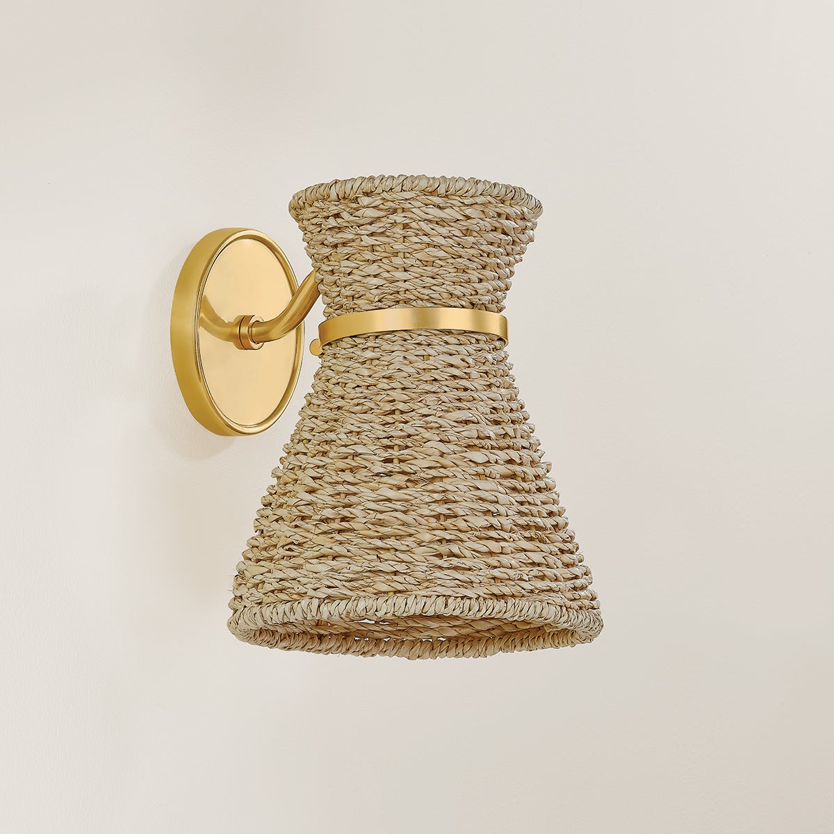 Juxtaposing natural seagrass with metal, the Jamie sconce brings a fresh dose of style to any wall. The shade has been handwoven, giving it the look and charm of traditional basketry. An Aged Brass arm wraps the top of the shade, creating a waist-like cinch that adds interest to Jamie’s simplistic silhouette.