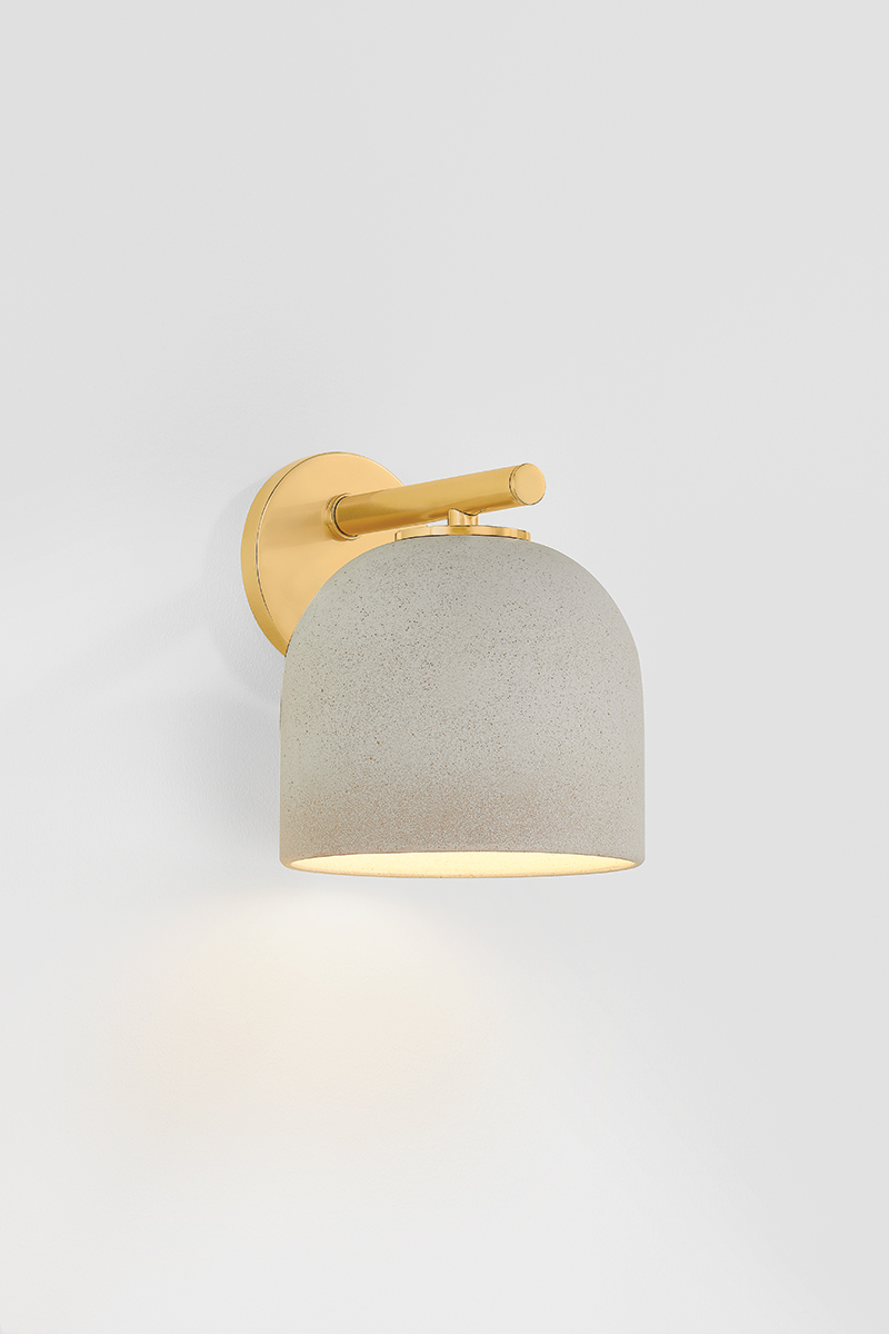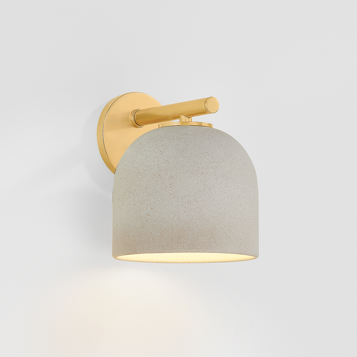 Inspired by Neoclassical architecture, Cara uses a domed shade and textural ceramic finish for a sconce that feels both ancient and new. A matte reactive glaze in an creamy hue creates a subtle surface grain that imitates natural stone. A circular modern armback in an Aged Brass finish adds shine to the fixture.