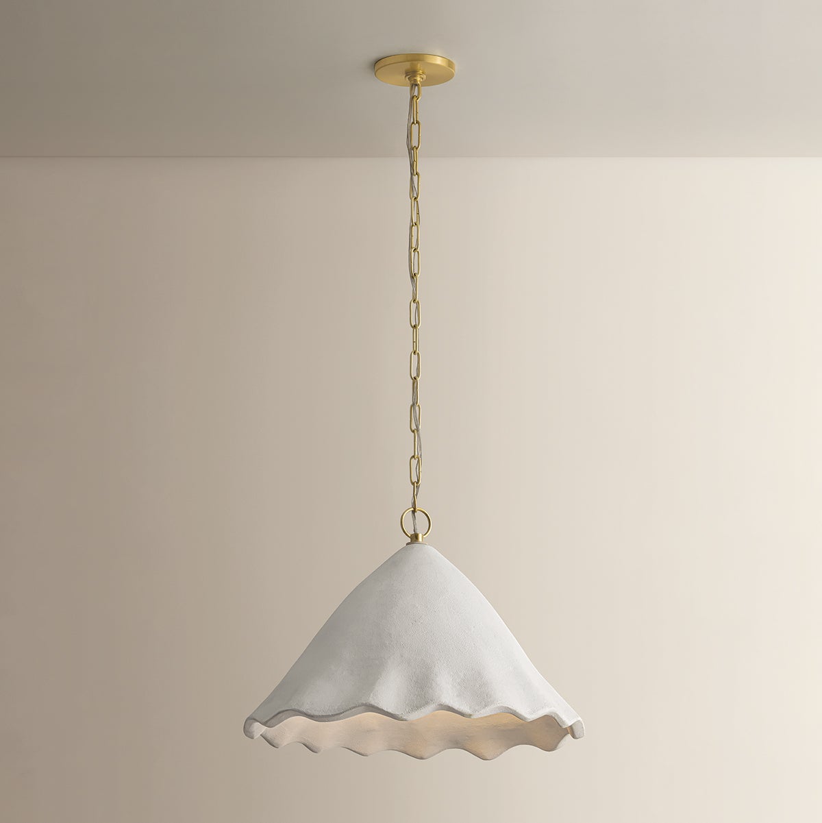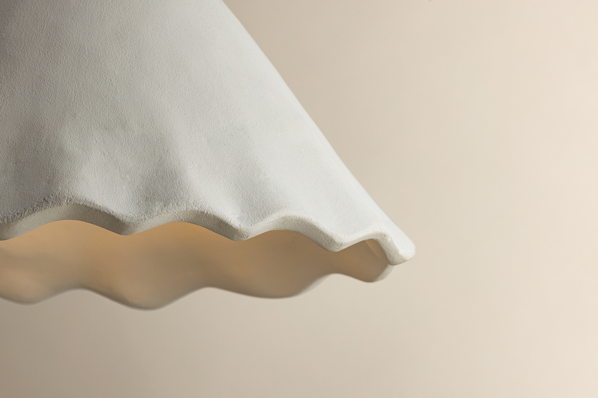 The botanically-inspired Lulu pendant makes a serene statement of material and form. Reminiscent of a tulip, the bell-shaped shade hangs with gentle suspension from an Aged Brass loop. While it resembles ceramic, it is crafted from a light, airy eco paper mix. Doubling as decoration, it creates a quiet moment of contemplation.