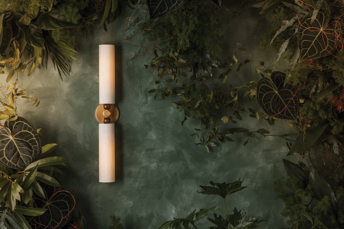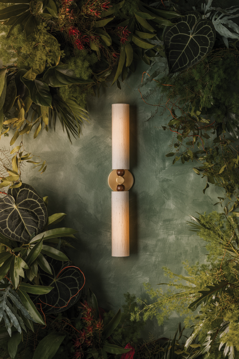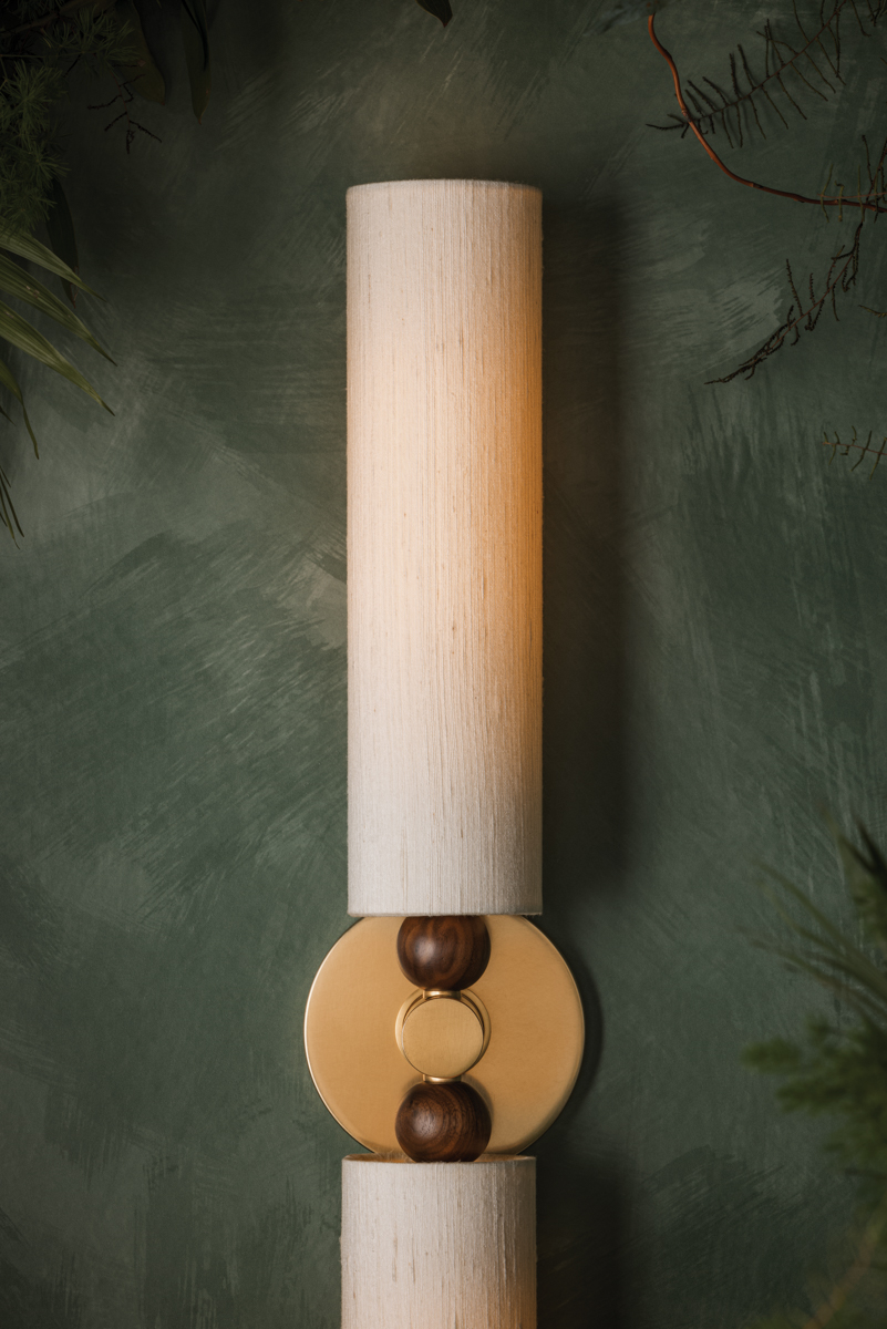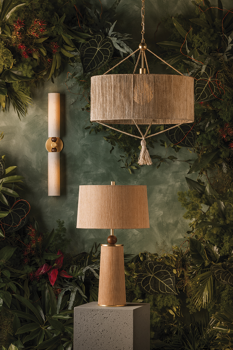 A tribute to Mandy’s husband, Rory, Reyn features architectural lines and a beloved family name. The inherent warmth and earthiness of the natural jute shade are complemented by a clean frame finished in Aged Brass. Depending on the fixture type, the decorative accents on Reyn alternate between artistic gold tassels and wooden spheres.